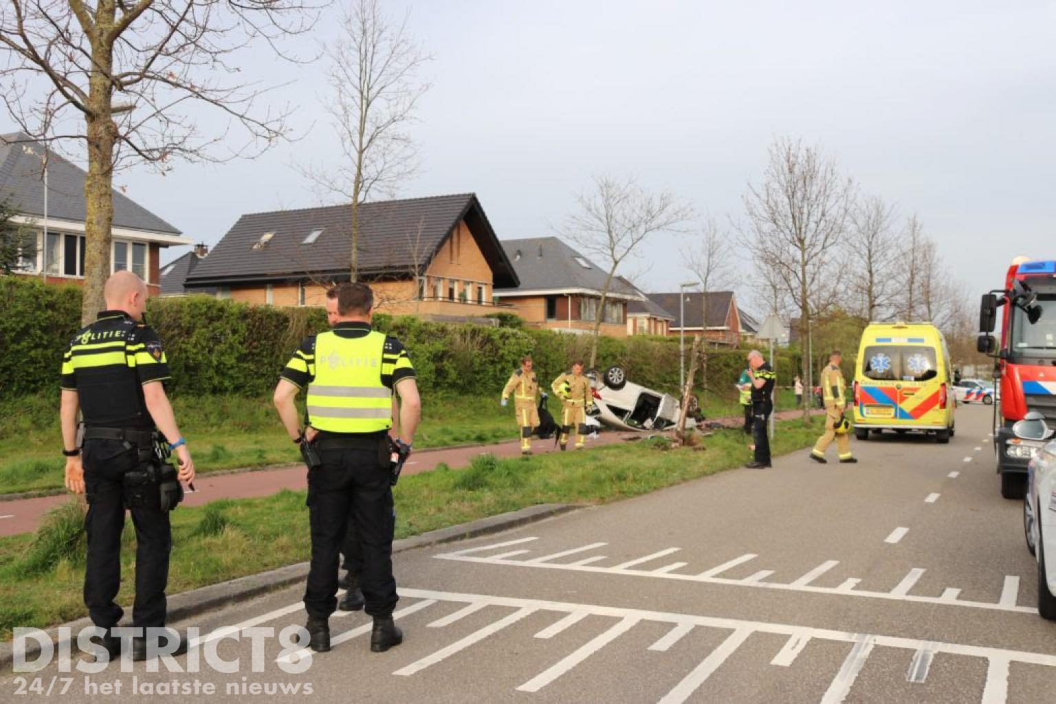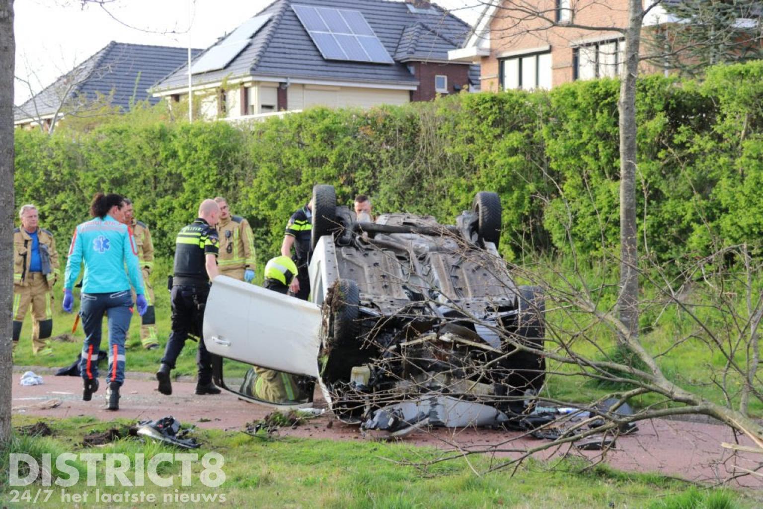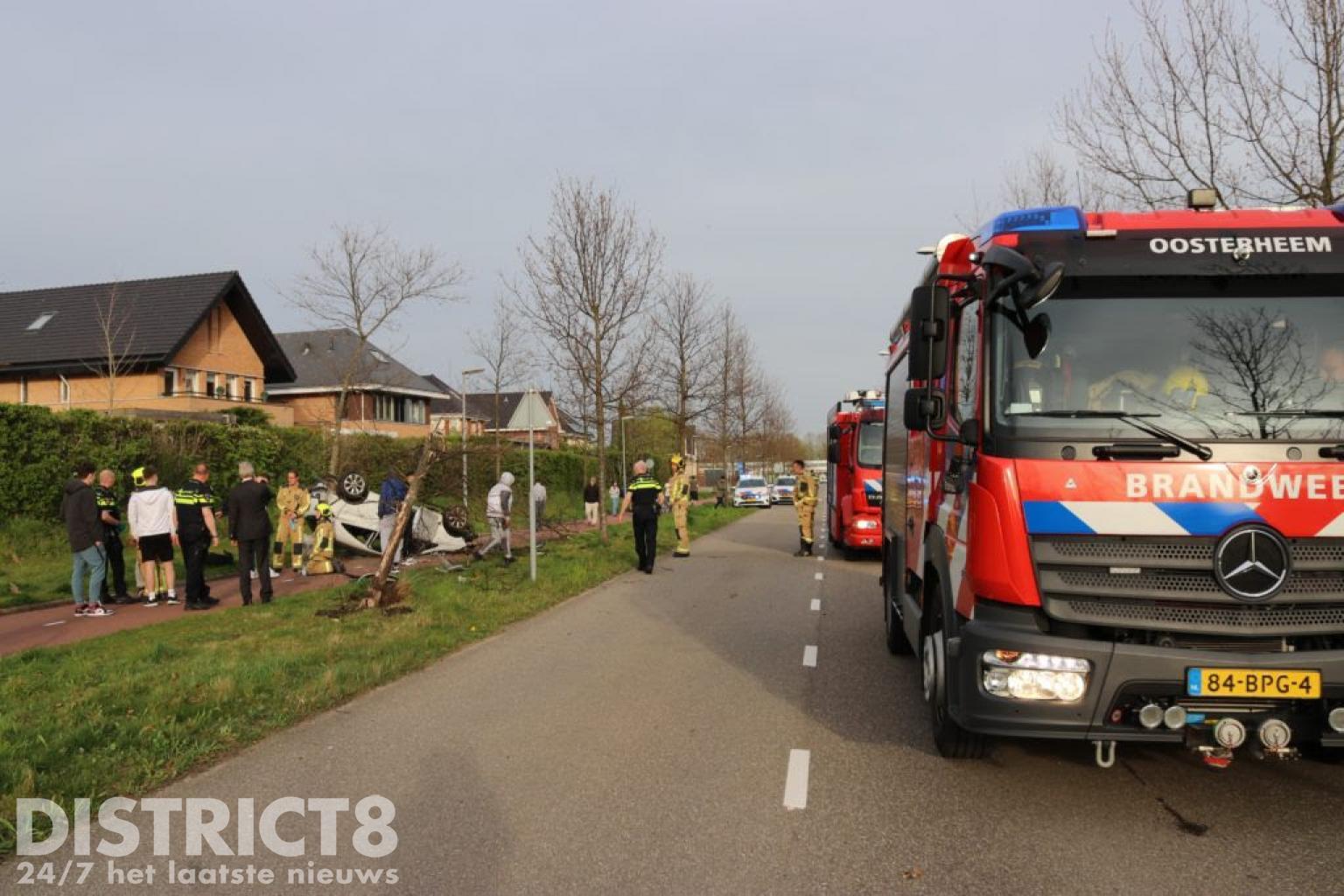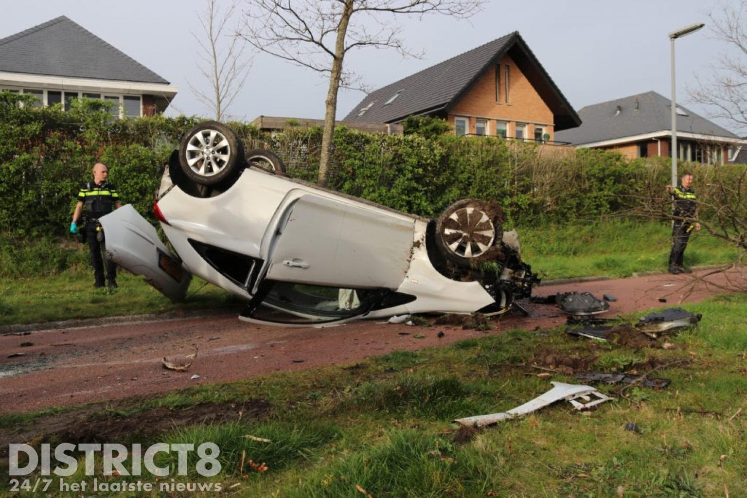 Een automobilist bleek de macht over het stuur te zijn verloren en is op z’n kop tot stilstand gekomen op een fietspad. Volgens omstanders miste de bestuurder hierbij op een haar na twee fietsers.