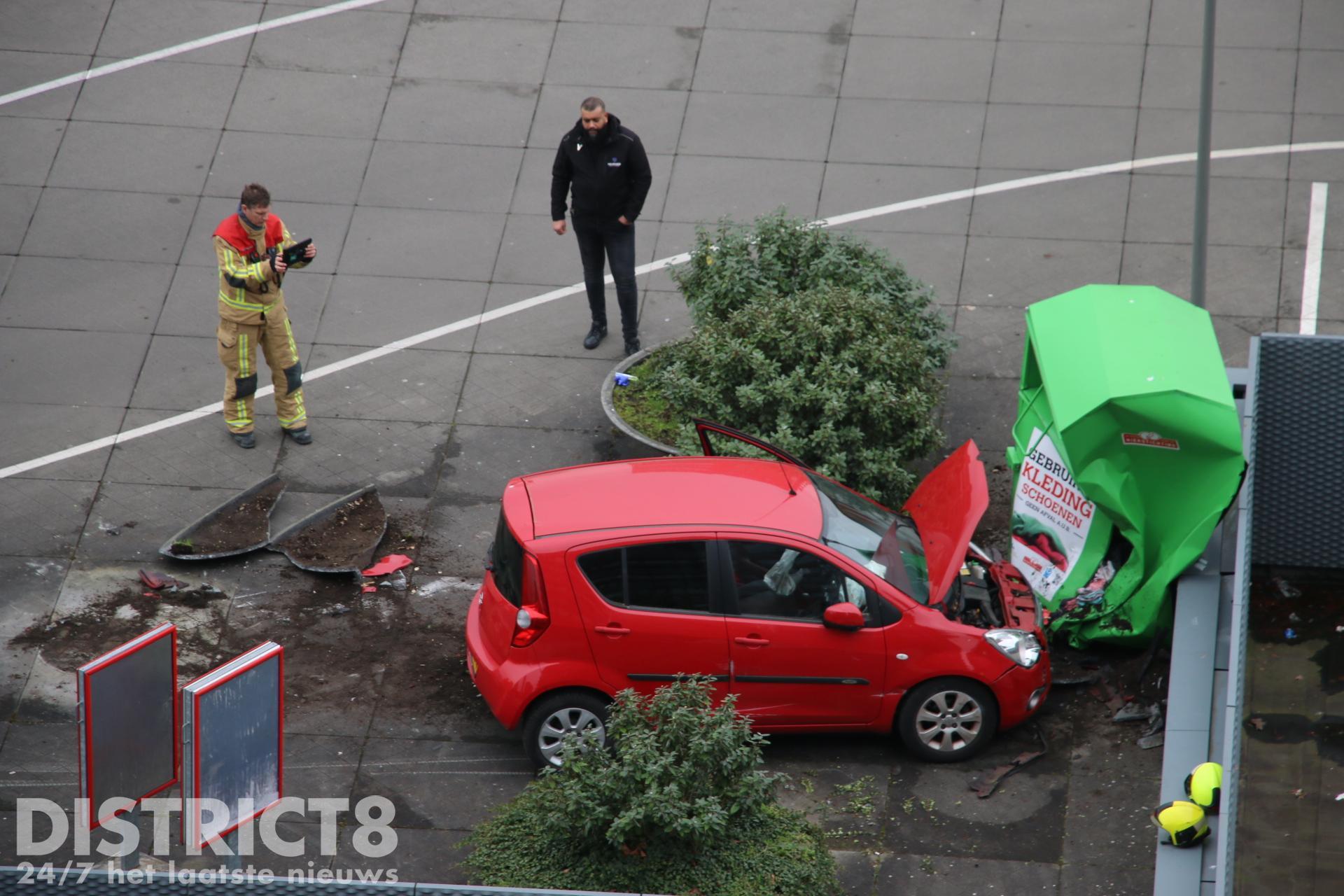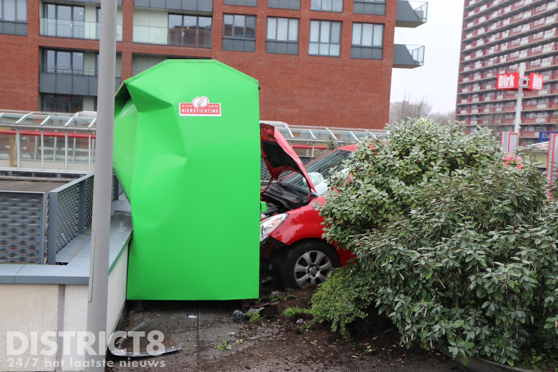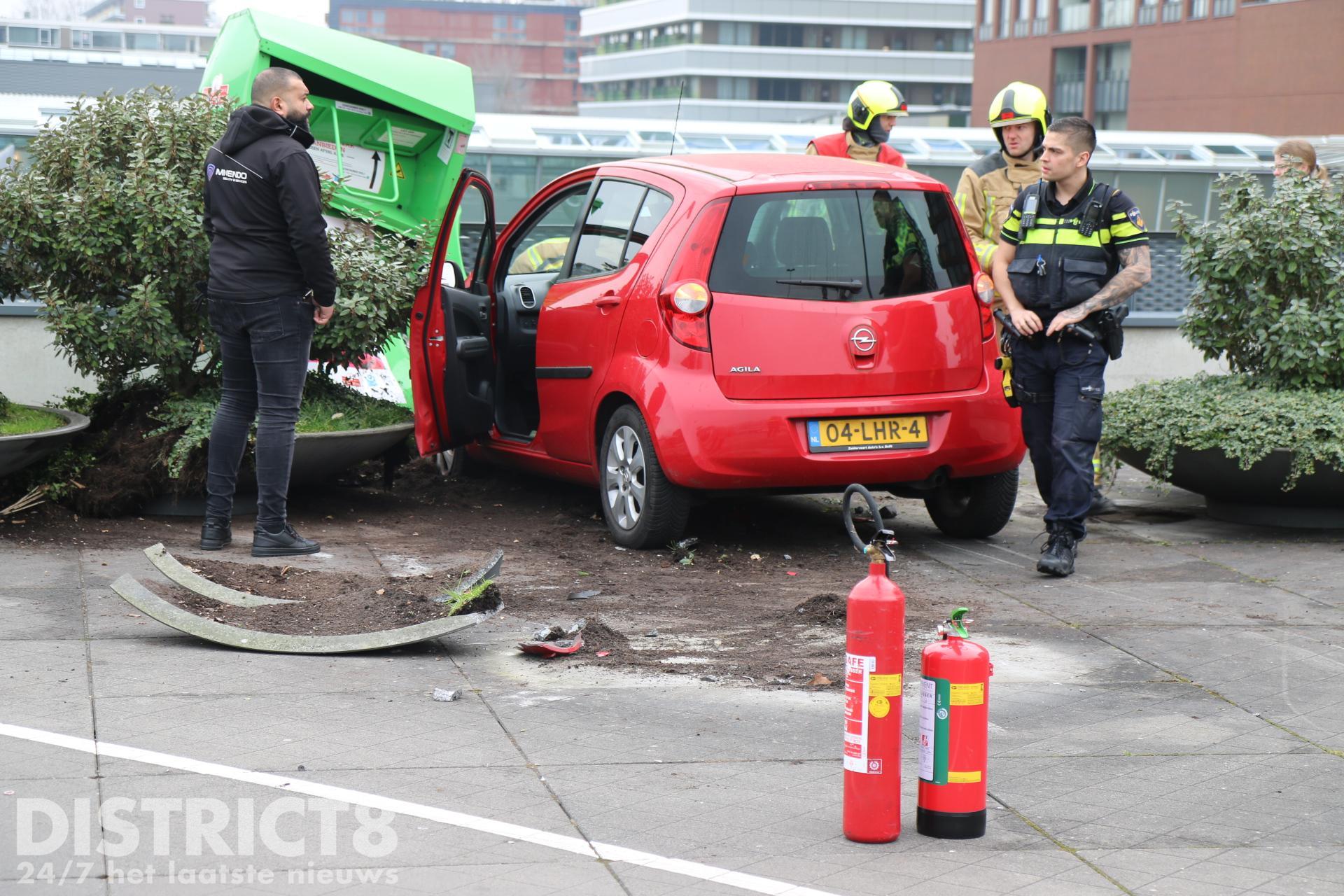 Door nog onbekende oorzaak heeft een automobilist een plantenbak en een kledingcontainer geramd.