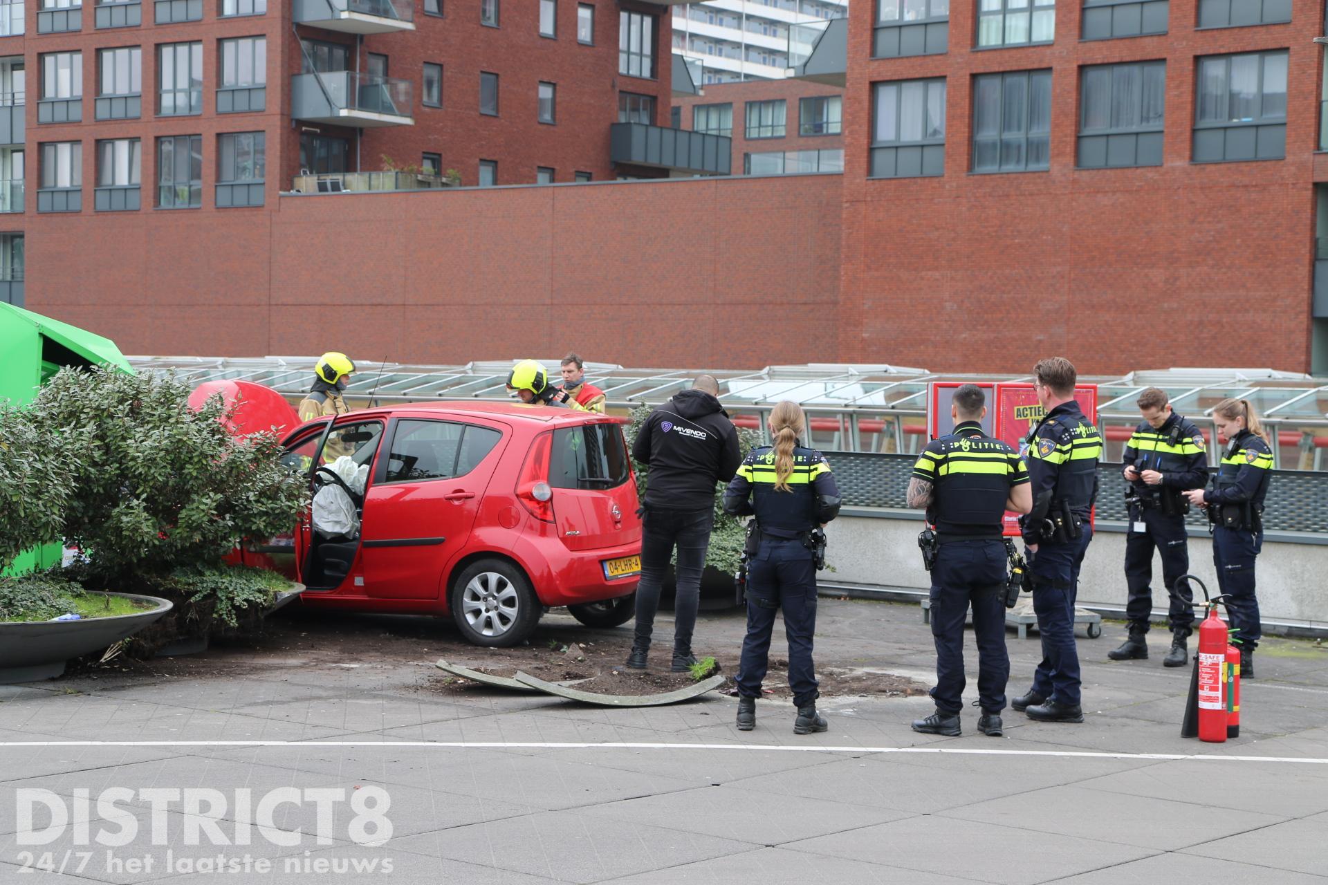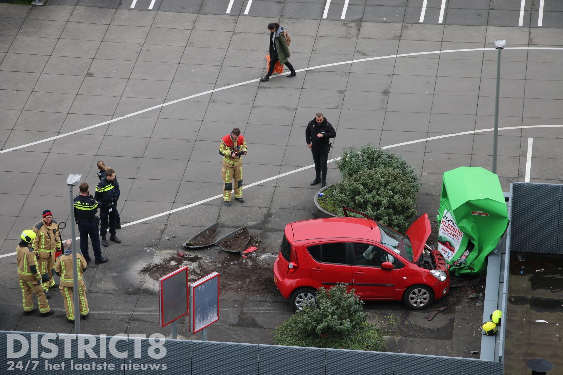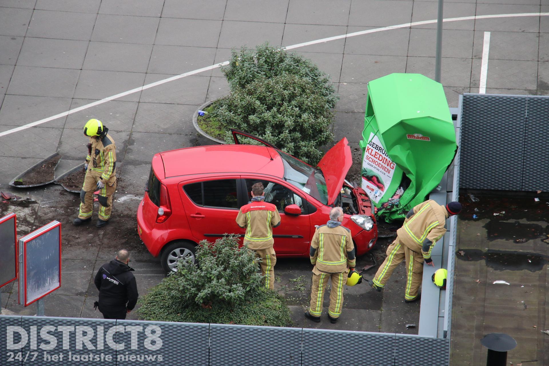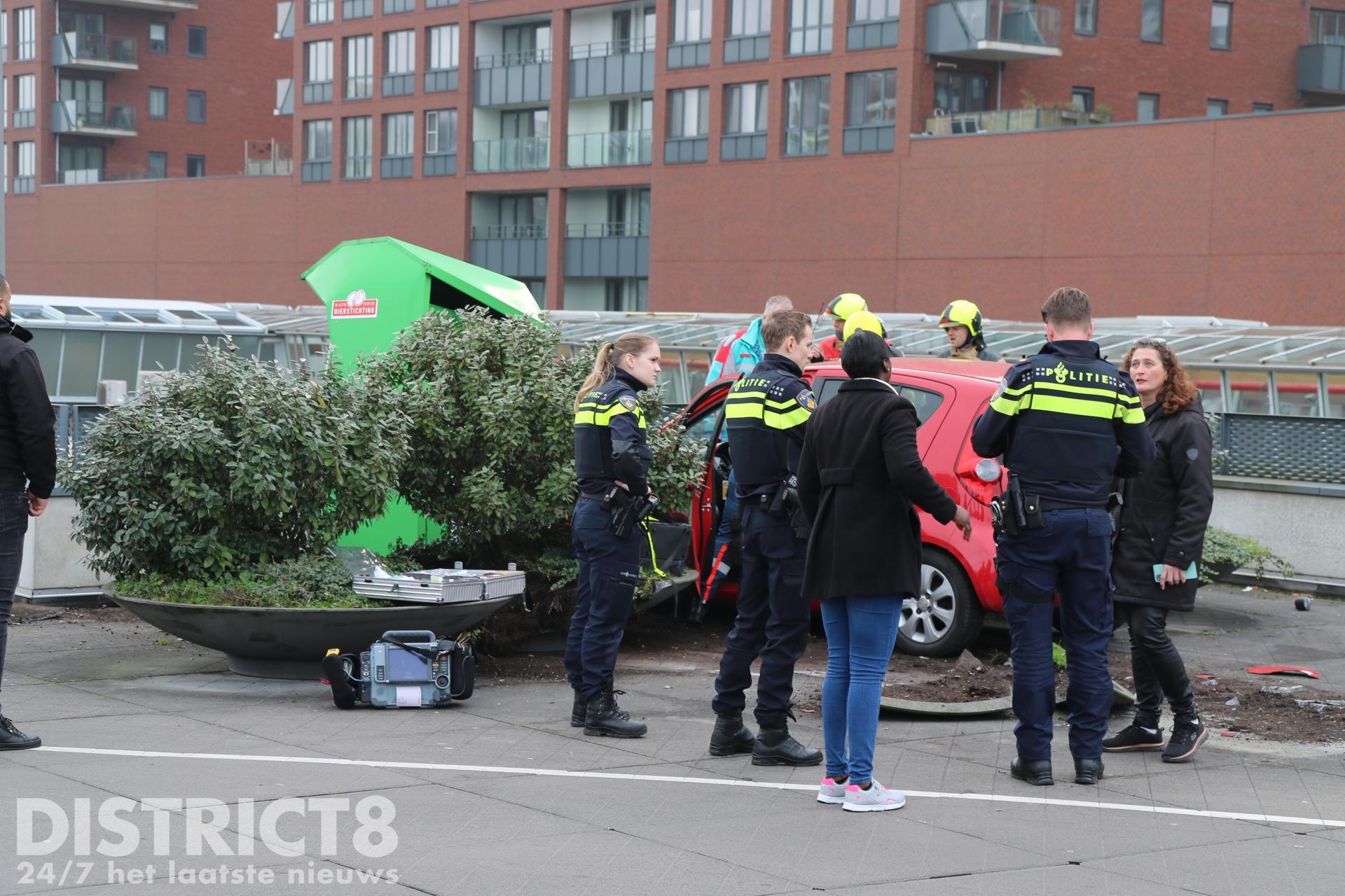 Door nog onbekende oorzaak heeft een automobilist een plantenbak en een kledingcontainer geramd.