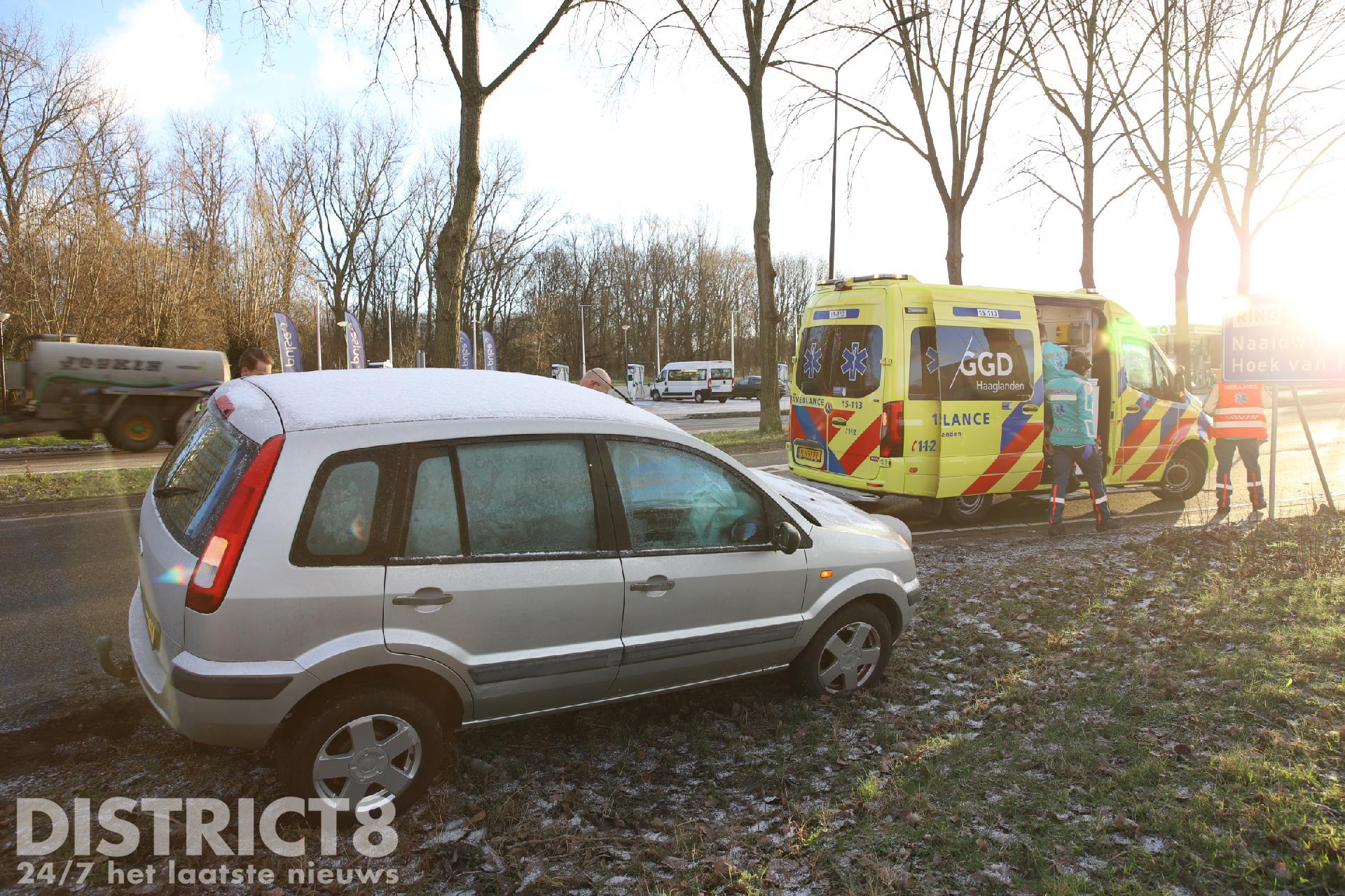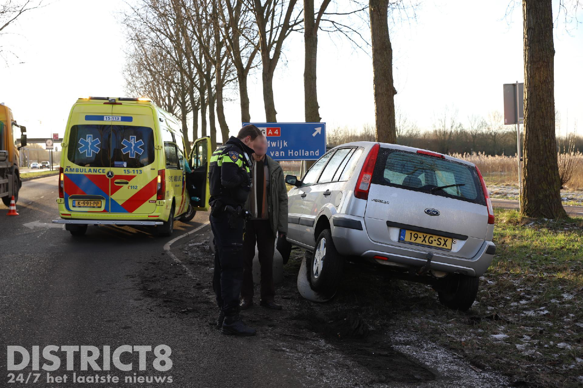 De automobilist kwam vanaf Rijswijk en wilde naar de rijksweg A4 richting Rotterdam rijden. De man zag door de laagstaande zon niet goed waar de voorsorteerstrook begon. De man stuurde te vroeg in en kwam met een flink klap tot stilstand.