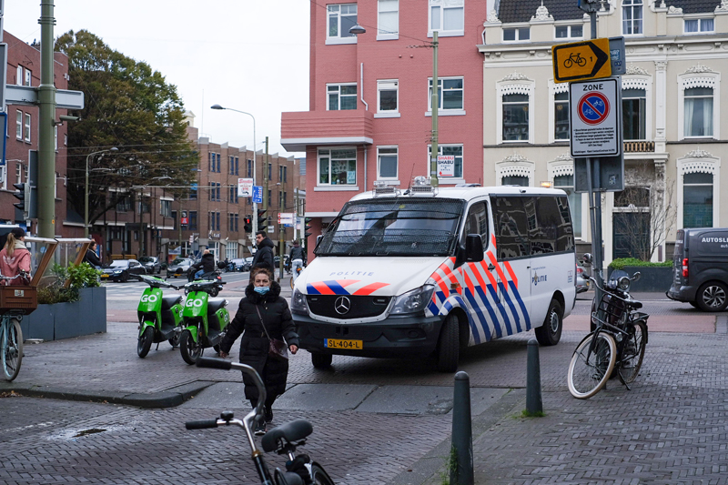 Nog voordat de agenten hem een stopteken konden geven, was de man er al met hoge snelheid vandoor. Bij zijn vlucht schampte hij een politiebiker op de Kortenaerkade en reed hard door in de richting van de Zoutmanstraat. Hierbij raakte hij een fietser die met de schrik vrij wist te komen.