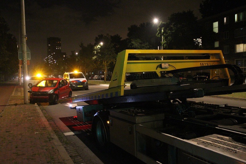 Een berger is ter plaatse gekomen om de auto af te slepen.