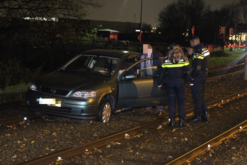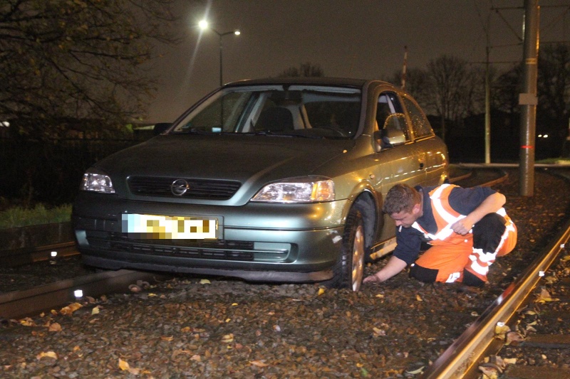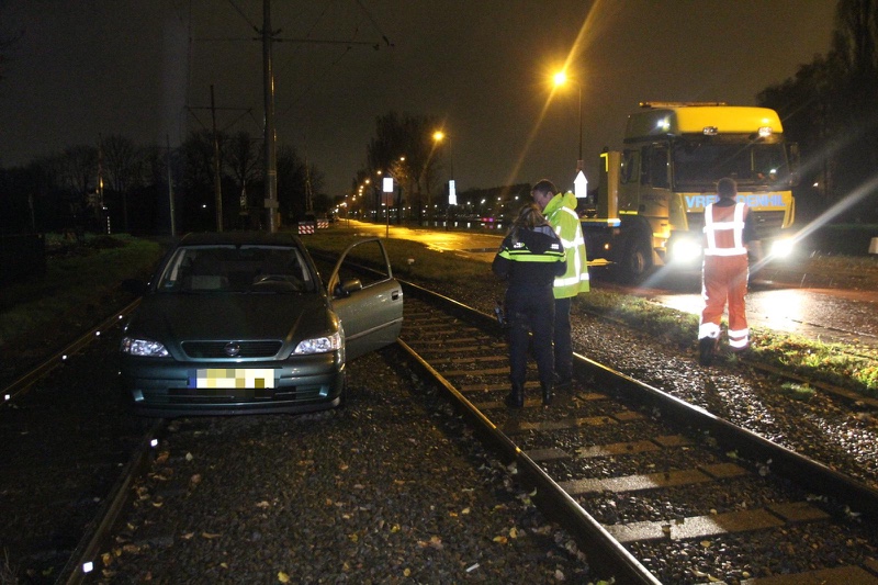 Automobilist rijdt zich vast op tramspoor Delftweg Rijswijk