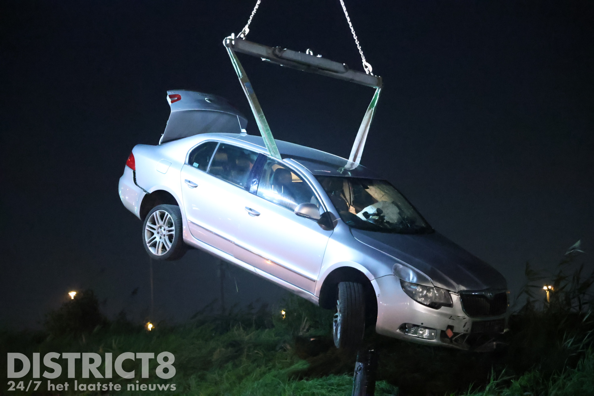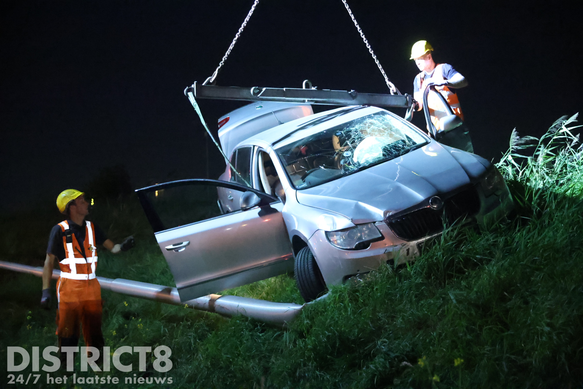 Een berger komt ter plaatse om de auto achter de vangrail vandaan te halen. De provincie is op de hoogte gebracht van de schade die is ontstaan bij de aanrijding.