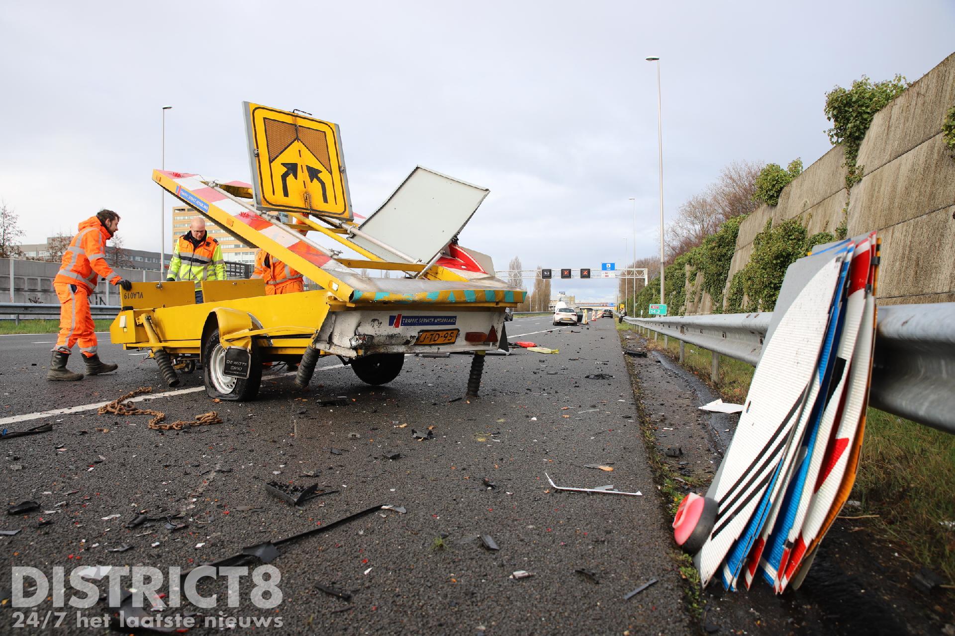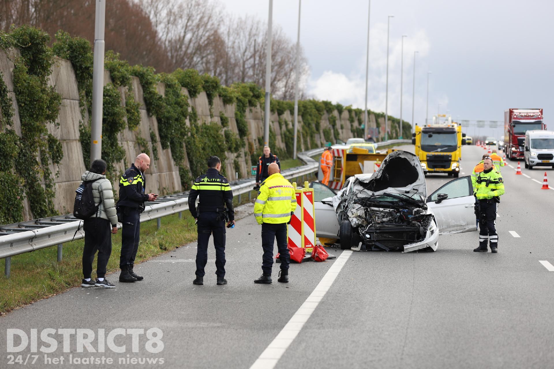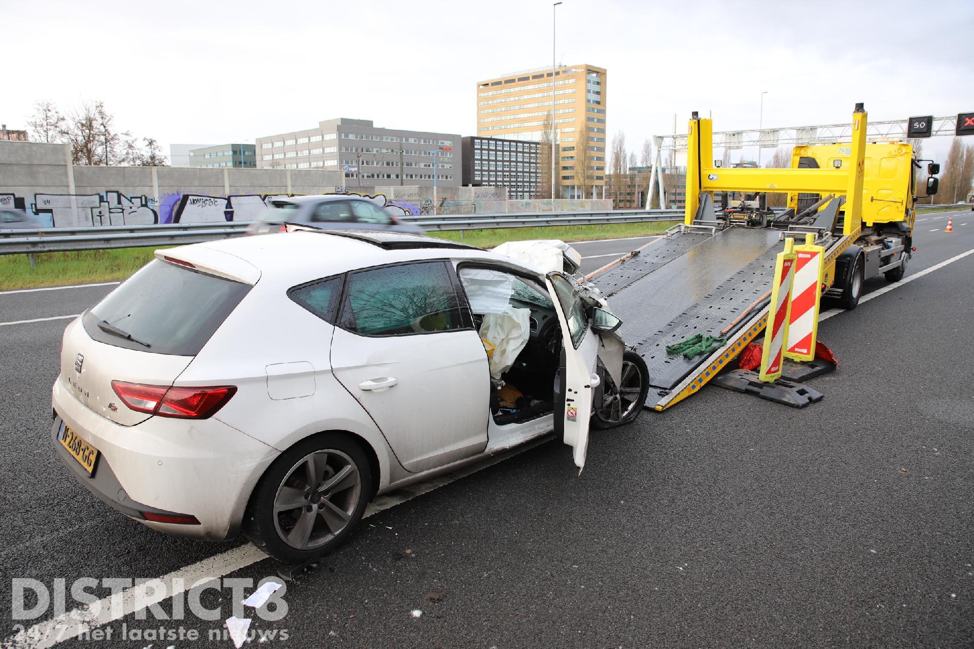 Ambulancepersoneel heeft hem nog gecontroleerd maar vervoer naar het ziekenhuis bleek niet noodzakelijk. Rijkswaterstaat heeft twee rijbanen afgesloten richting Den Haag. Een berger is ter plaatse om de actiewagen en de auto af te voeren.
