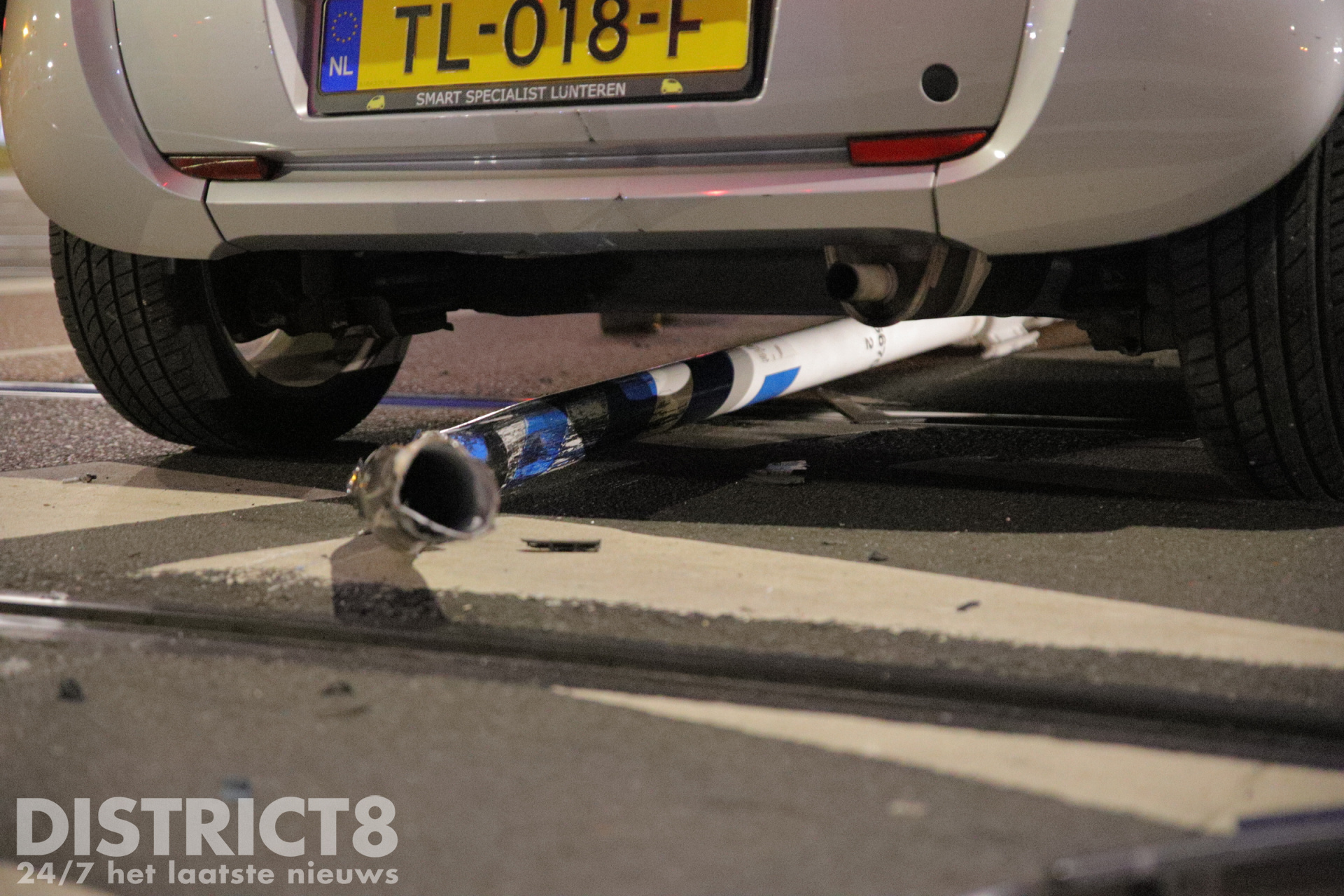 Een automobilist is door nog onbekende oorzaak uit de bocht gevlogen. Via het fietspad heeft de automobilist een paal geraakt en is vervolgens op de weg tot stilstand gekomen.