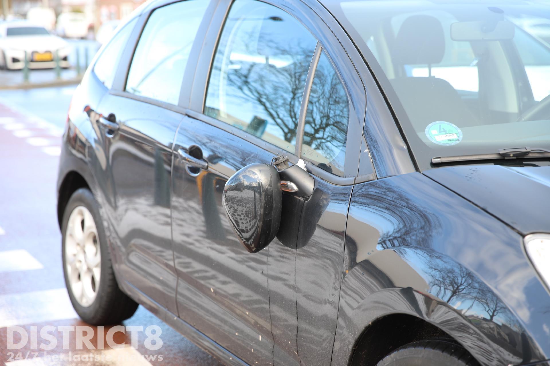 De spiegel van de auto is kapot en is met behulp van een stuk ducttape weer aan de auto bevestigd.