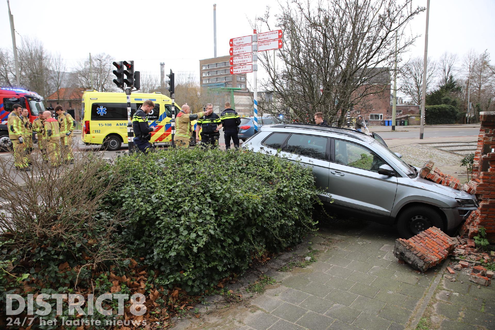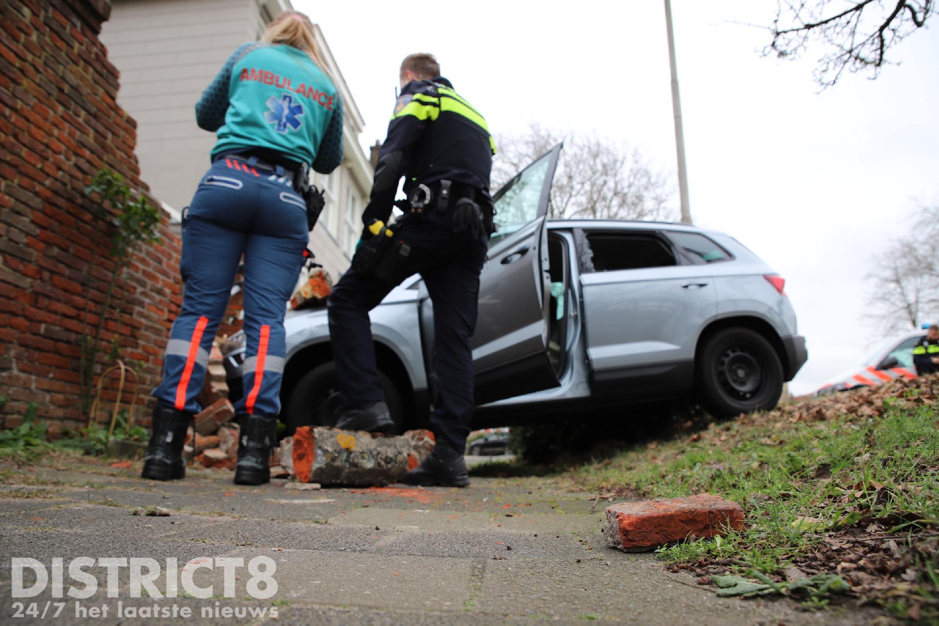 Rond het middaguur ging het mis. Een automobiliste reed door een nog onbekende oorzaak door een muurtje van een tuintje heen en kwam daar tot stilstand.