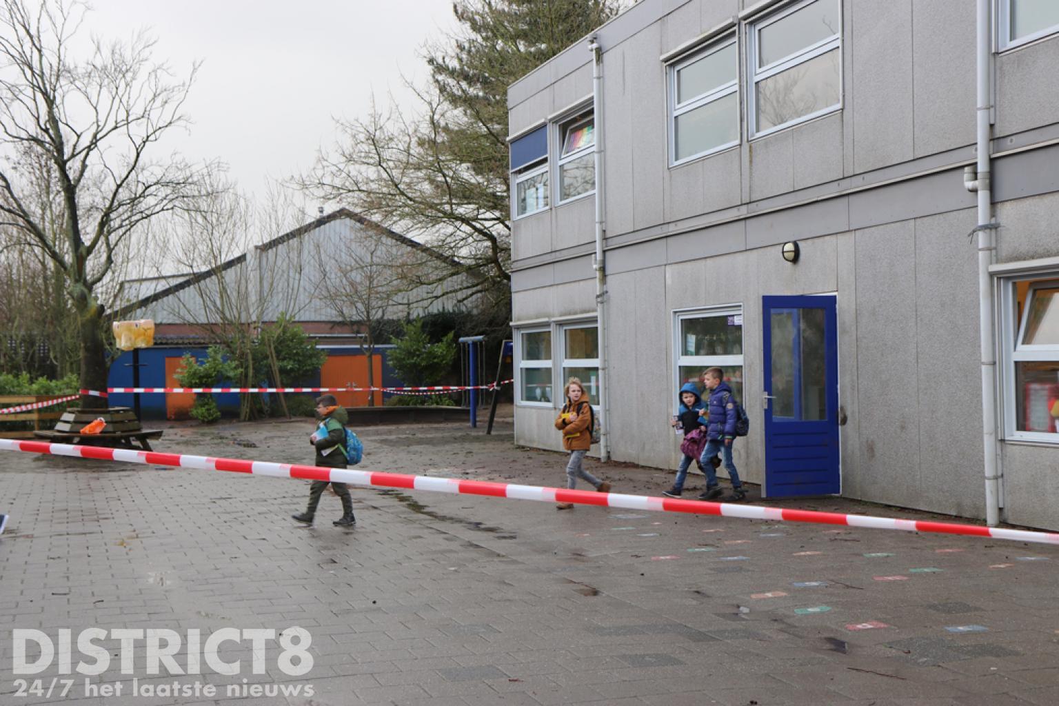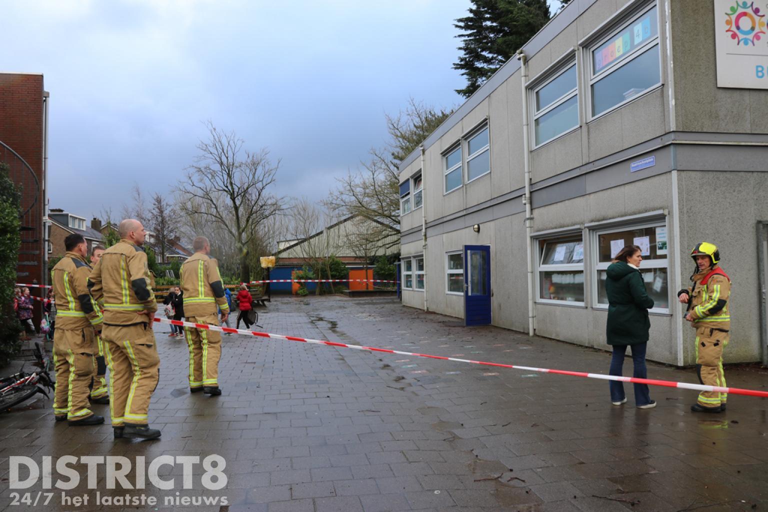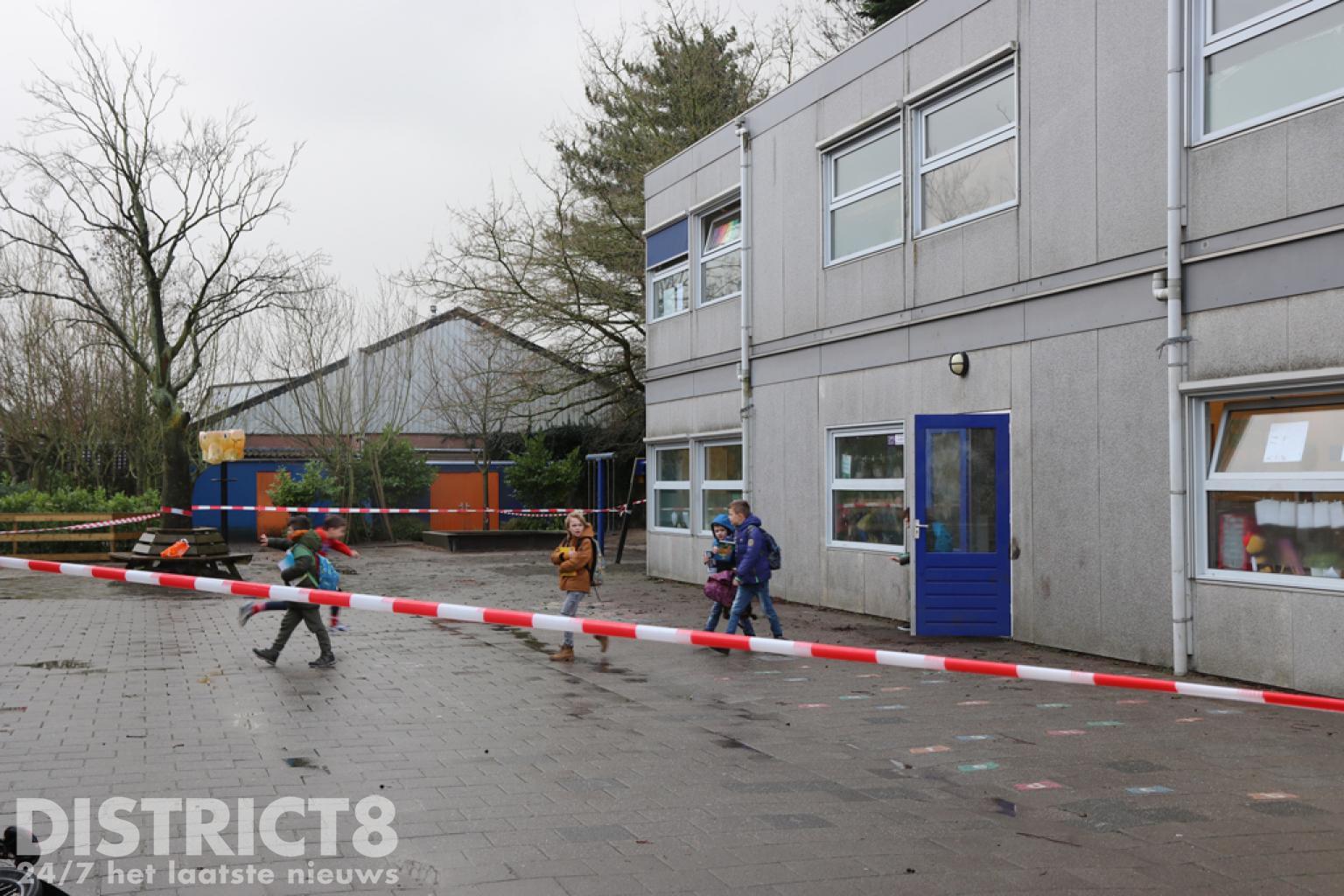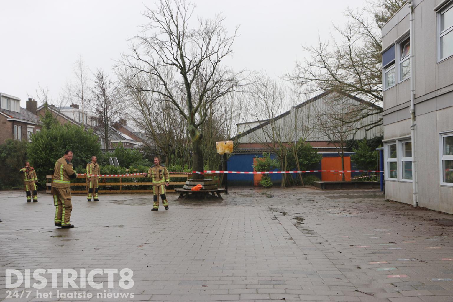 Het schoolplein is afgezet en de brandweer, politie en de gemeente zijn ter plaatse.