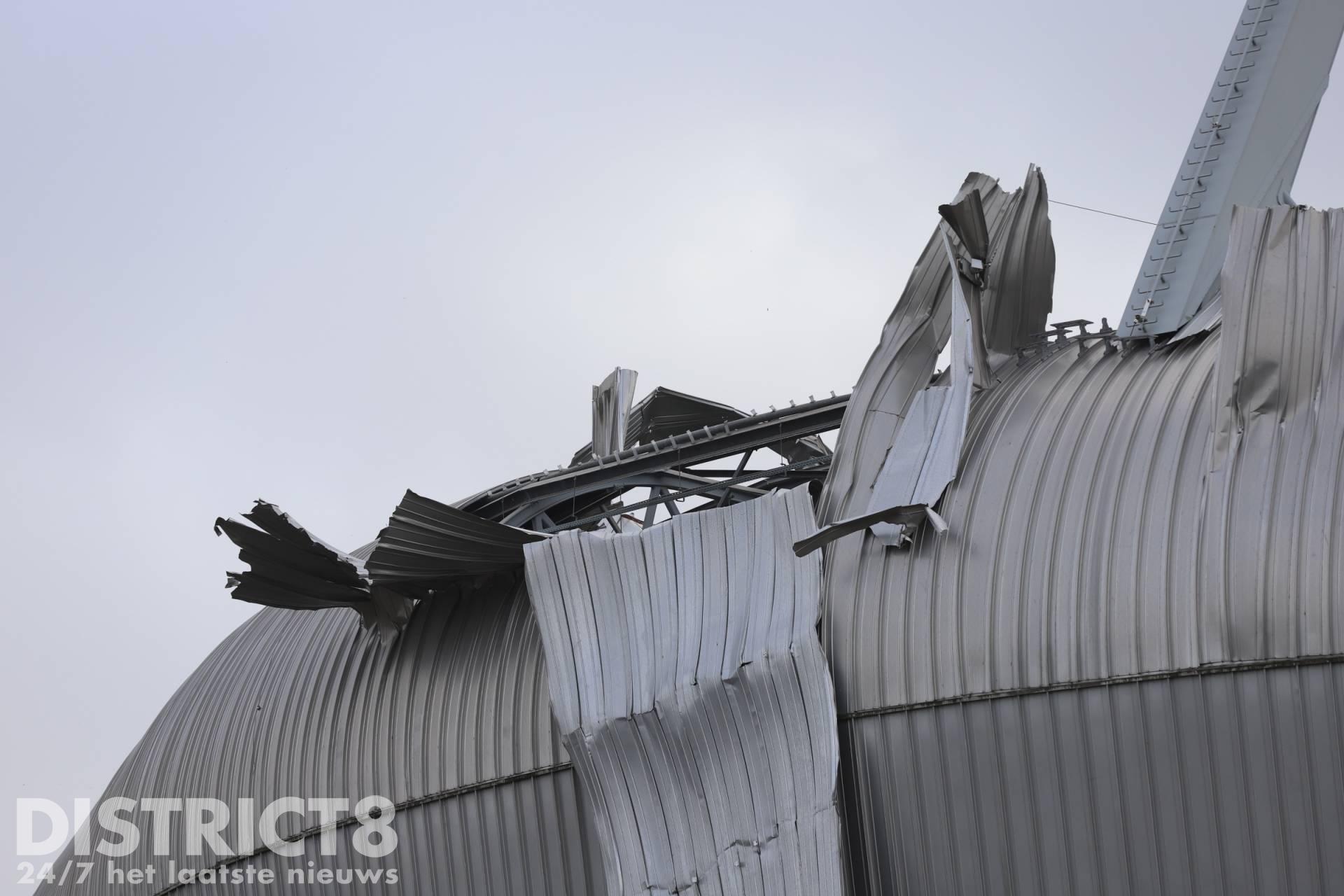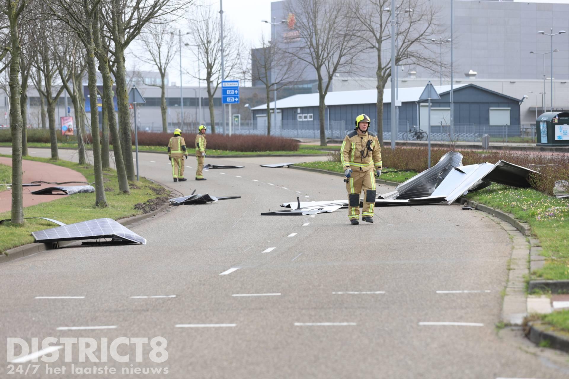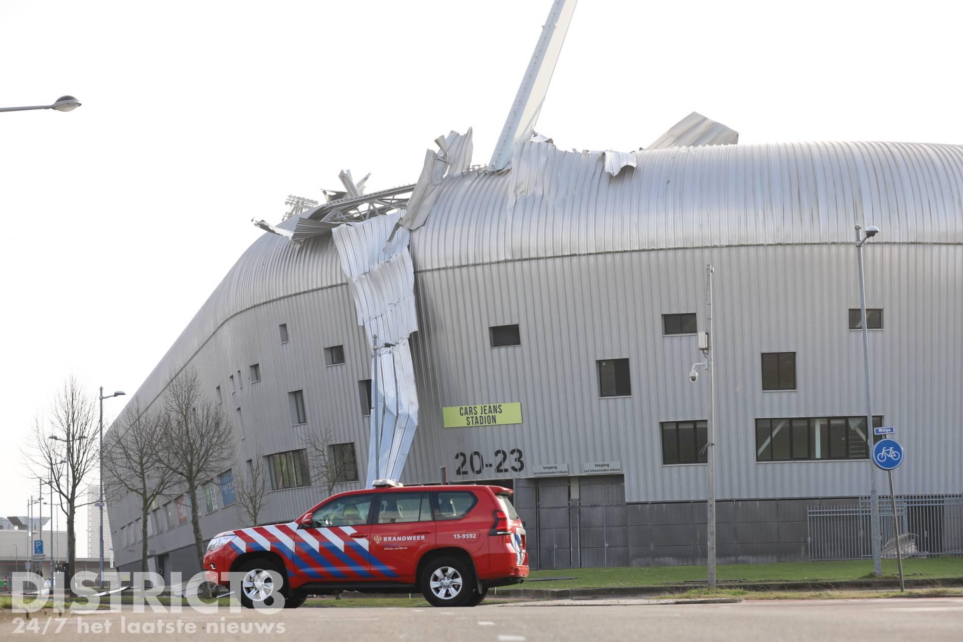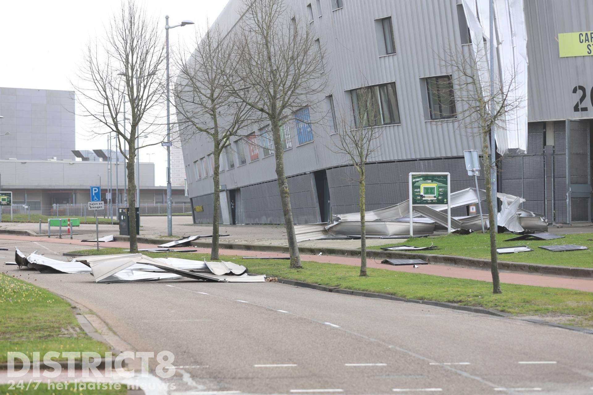 De beplating van het Stadion is losgerukt, de grote delen van de beplating waaien over straat wat voor een gevaarlijke situatie zorgt.