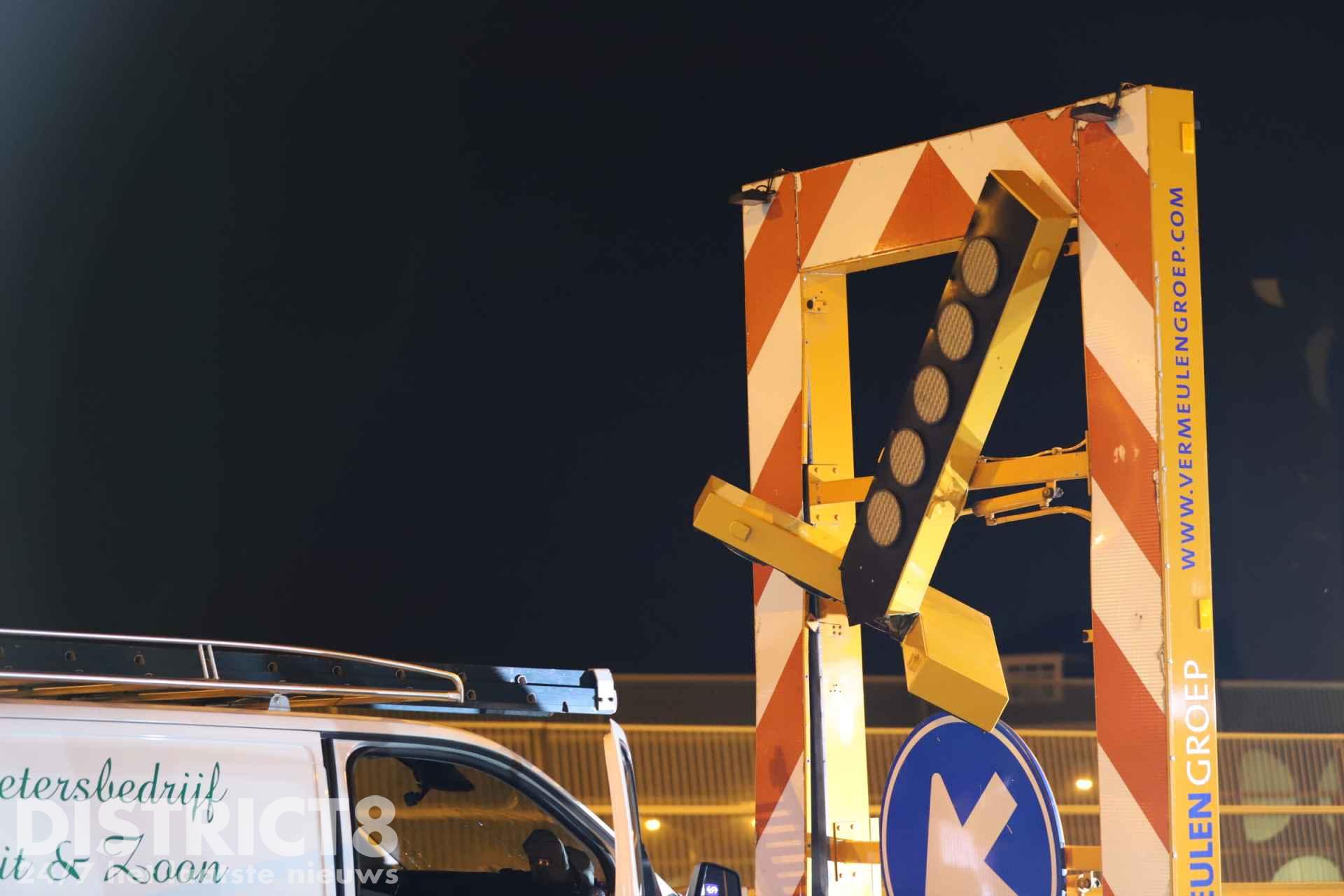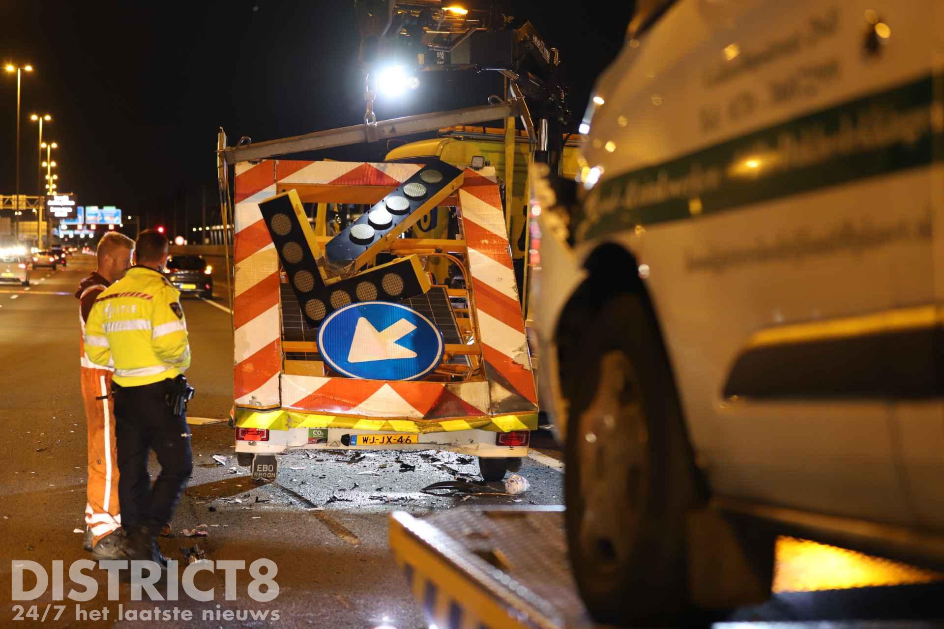 De pijlwagen stond op de rechter rijstrook om werkzaamheden te beveiligen, even verderop waren wegwerkers bezig met het repareren van een verzakte put.