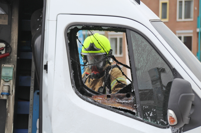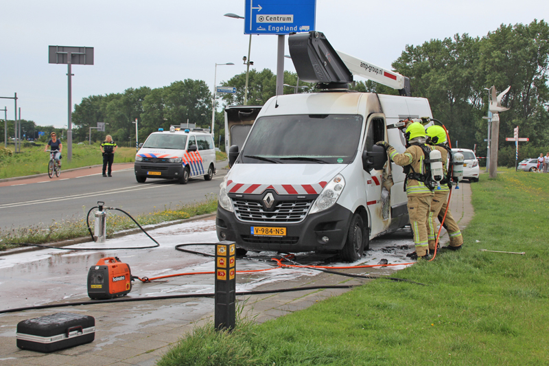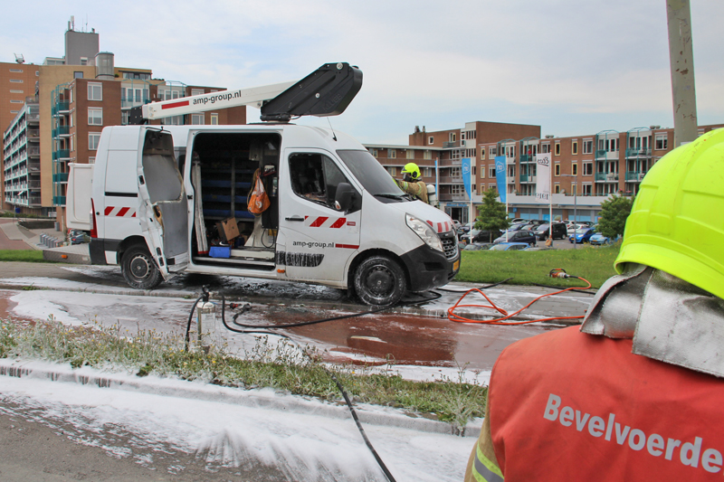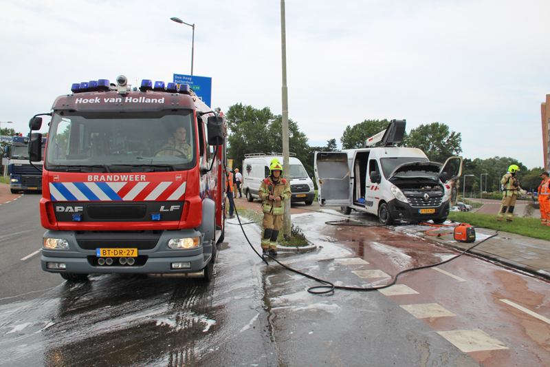 Hoek van Holland – Een bestelbus van een bedrijf dat werkt aan de Hoekse Lijn is verwoest door een brand aan de Harwichweg in Hoek van Holland. Door kortsluiting in de accu’s ontstond brand in het voertuig, waarna ook de dieseltank vlam vatte.