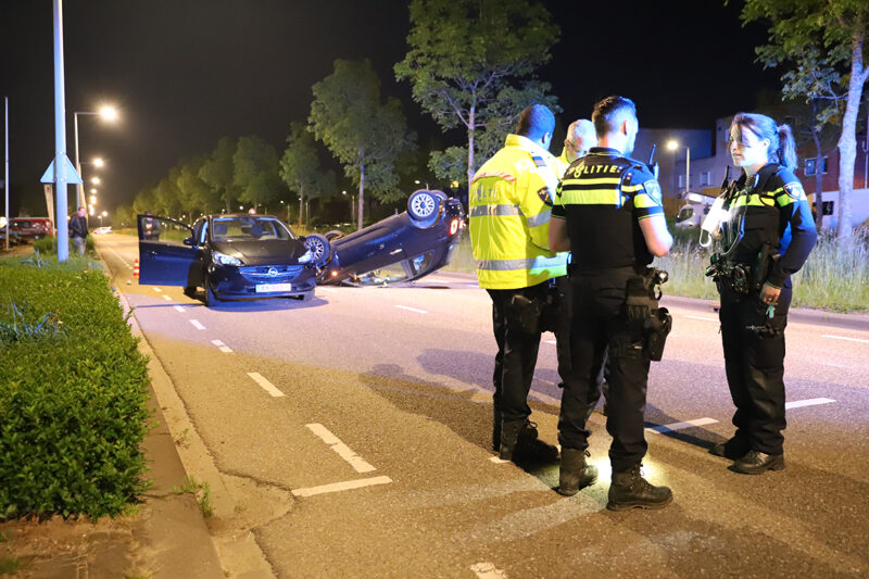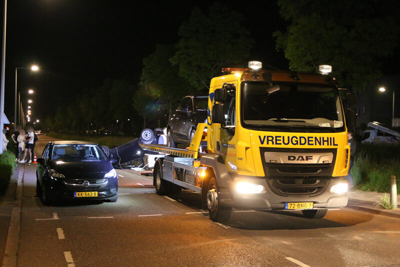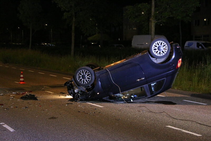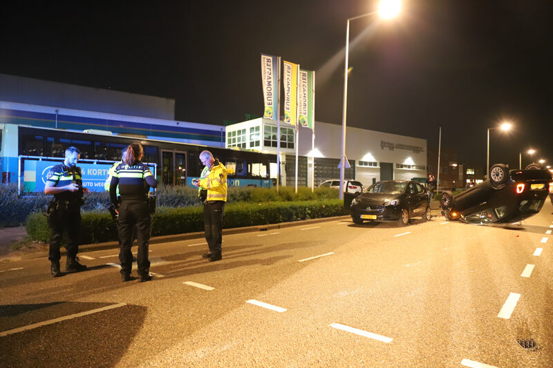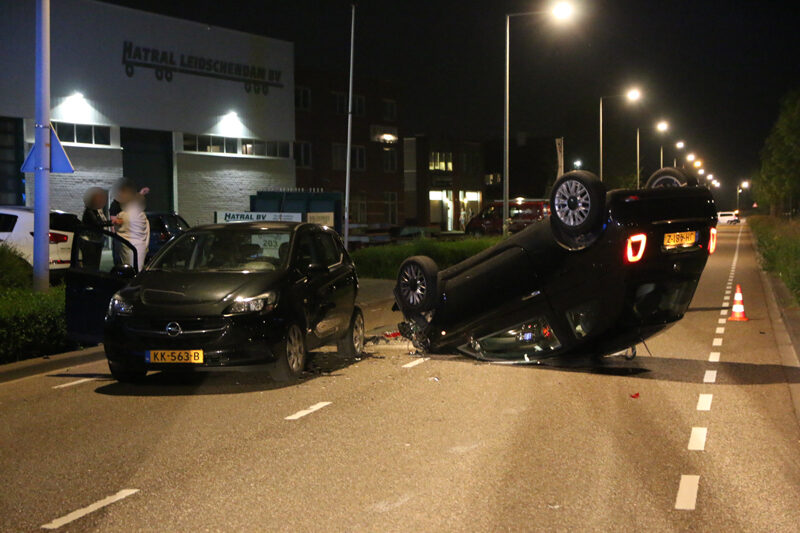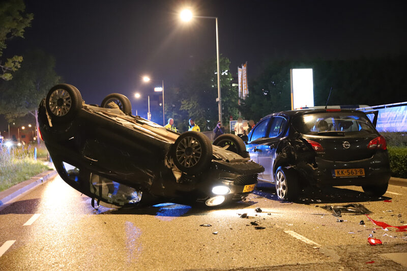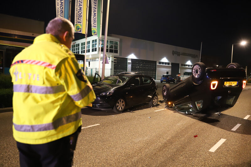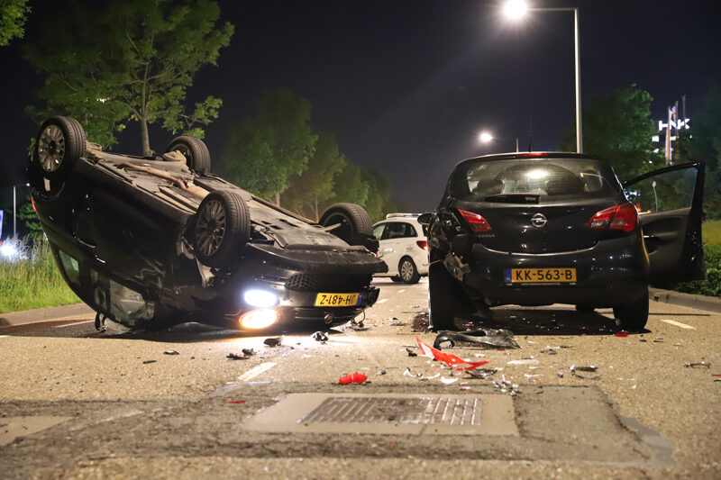 De auto’s kwamen door nog onbekende reden met elkaar in botsing. Na de aanrijding kwam één van de voertuigen op zijn kop terecht.