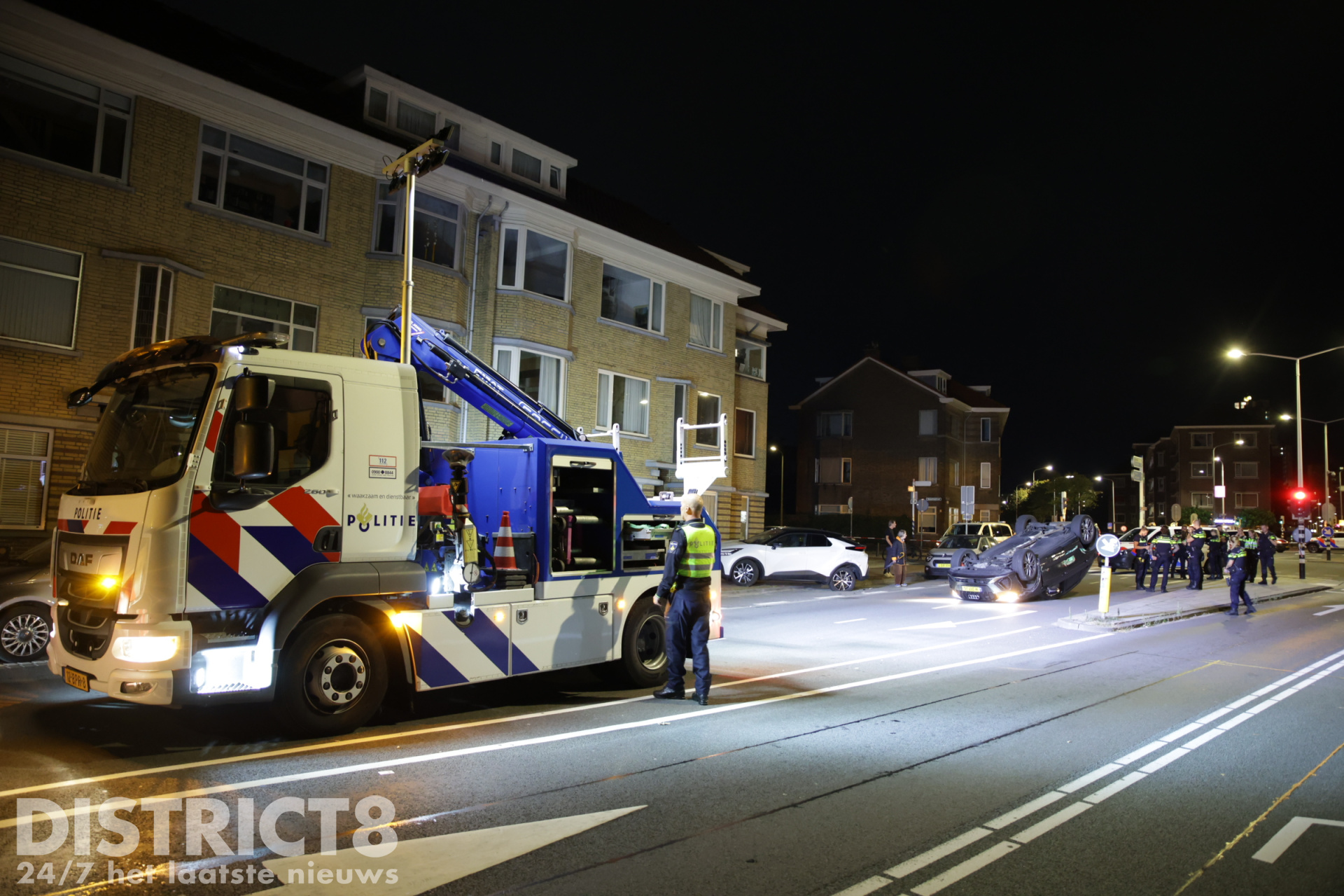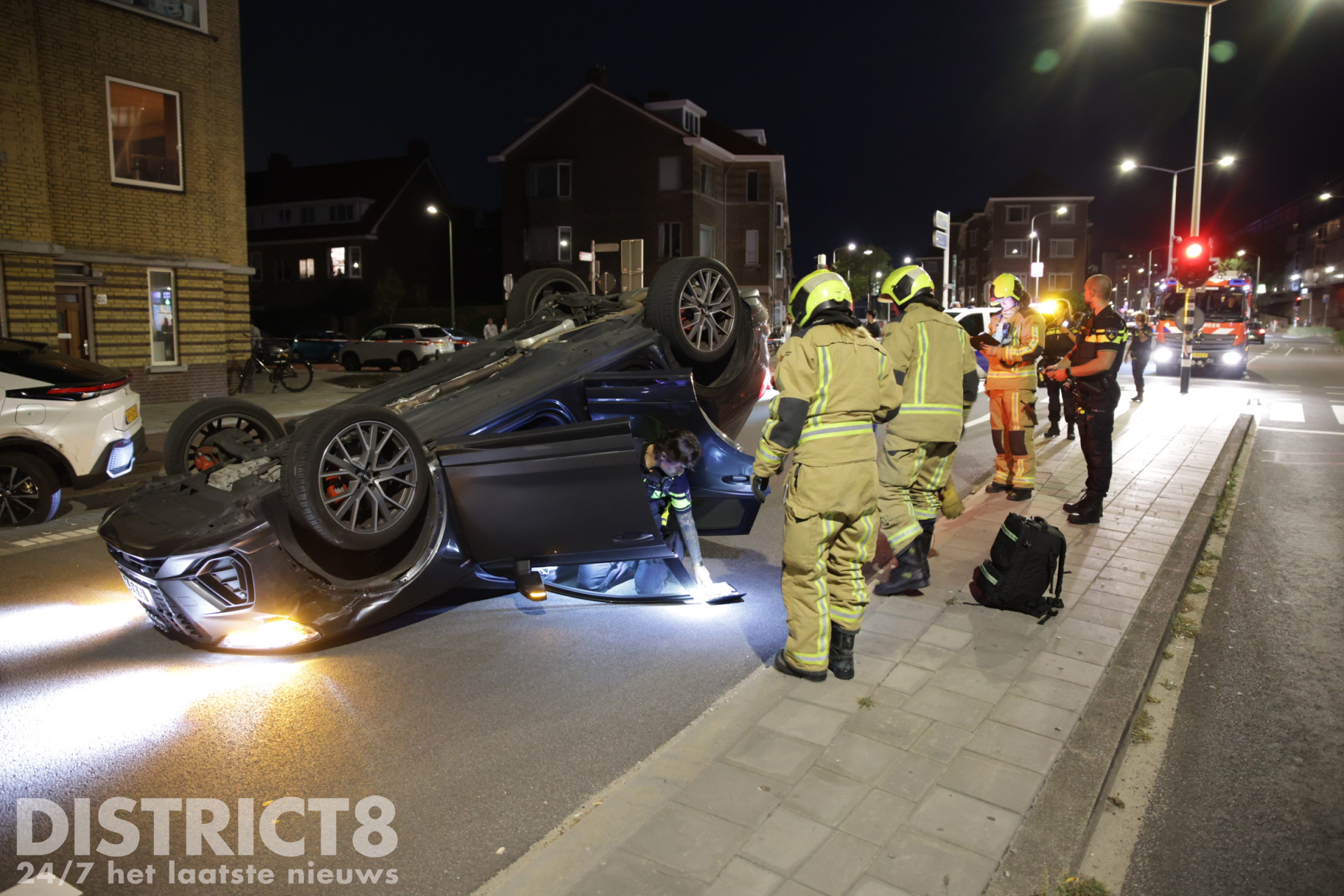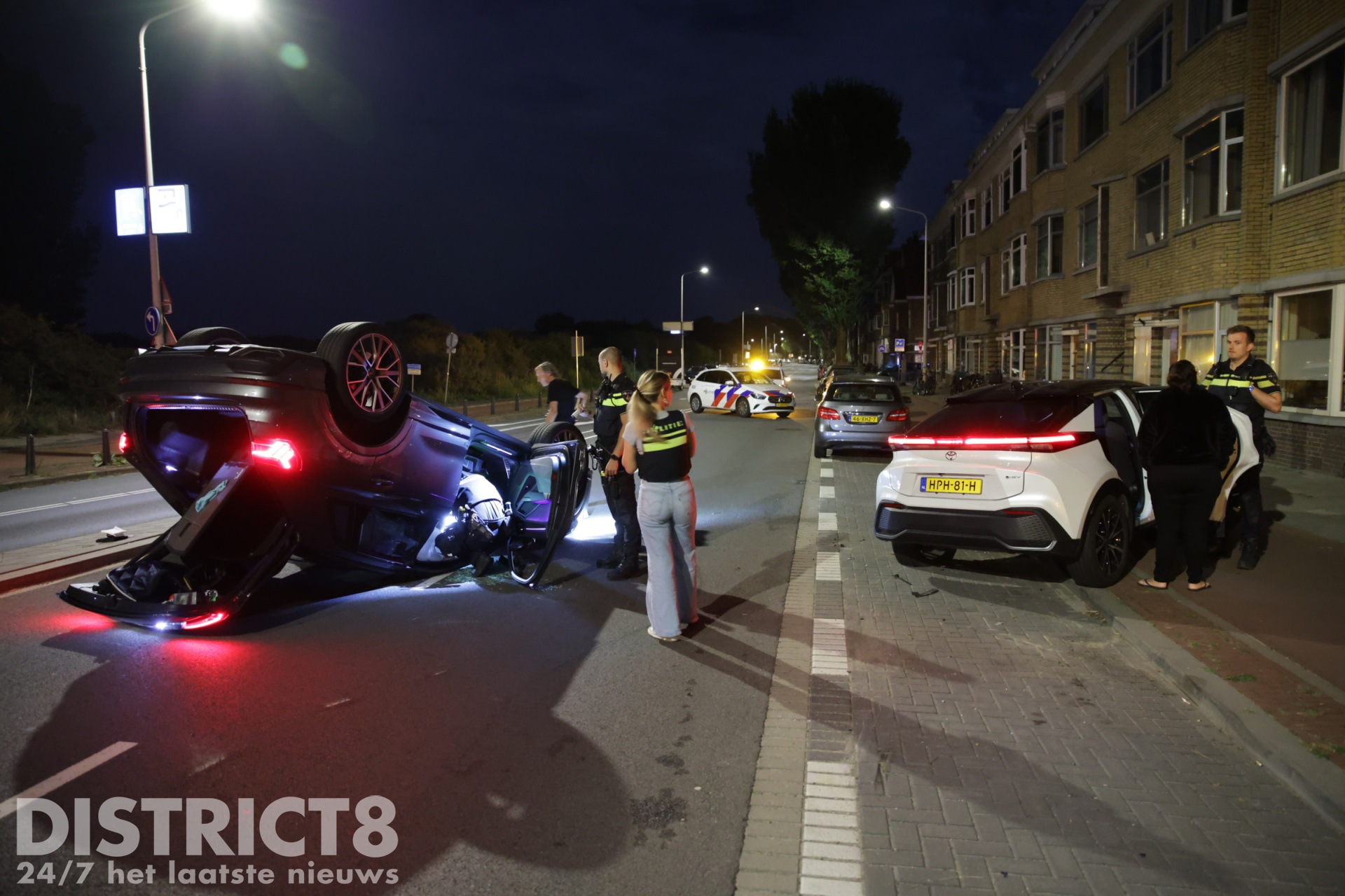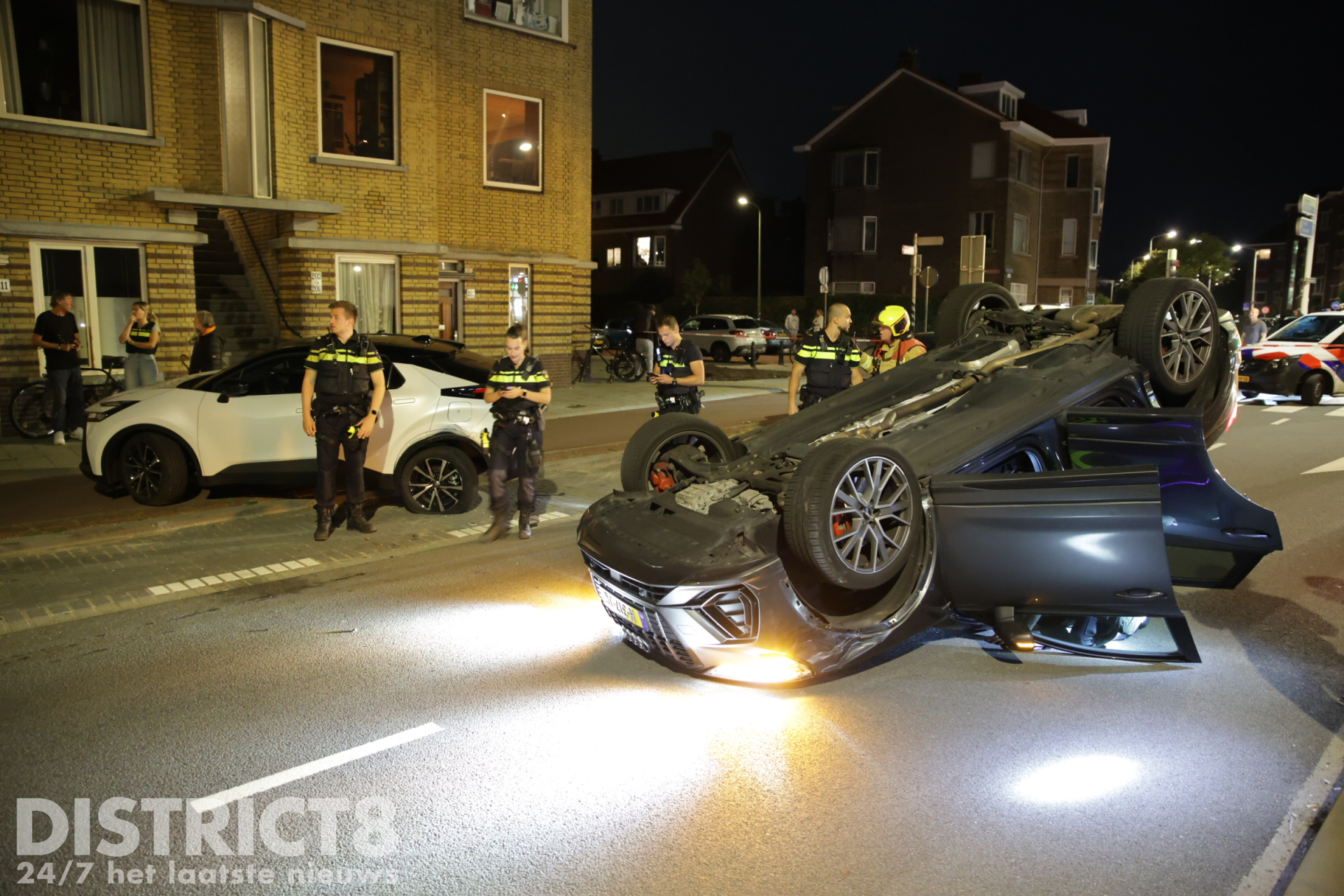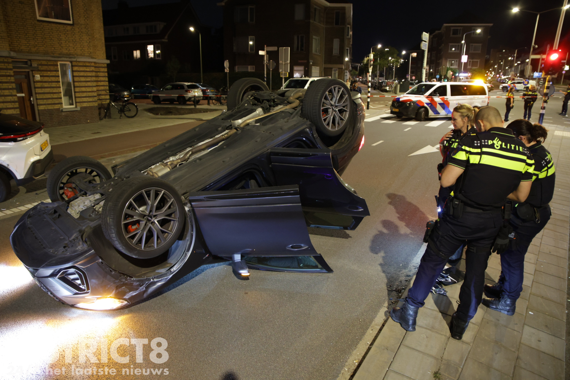 Den Haag – Op de Zwolsestraat met de Hasseltsestraat in Den Haag is in de nacht van zondag op maandag 8 september een auto over de kop gevlogen.