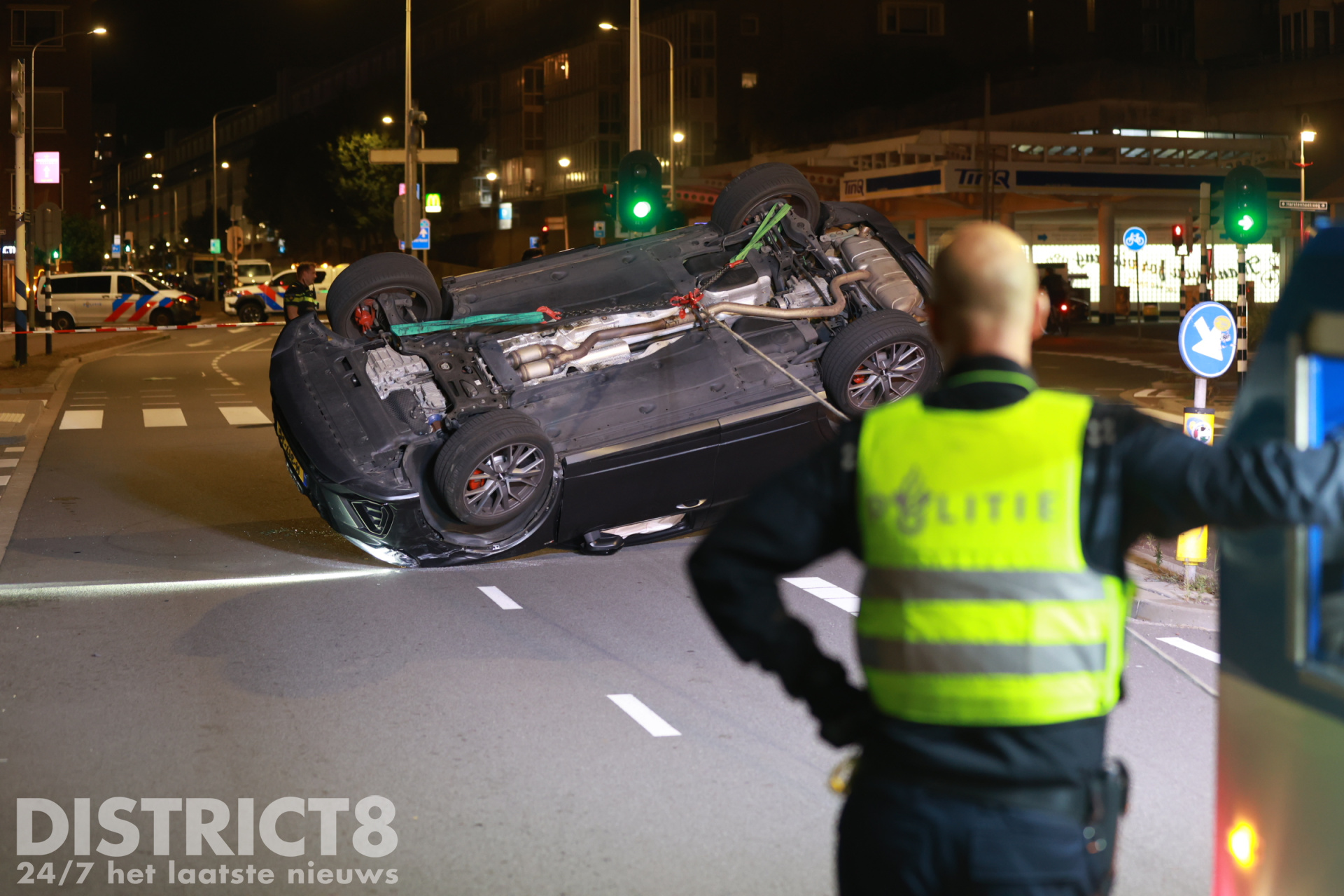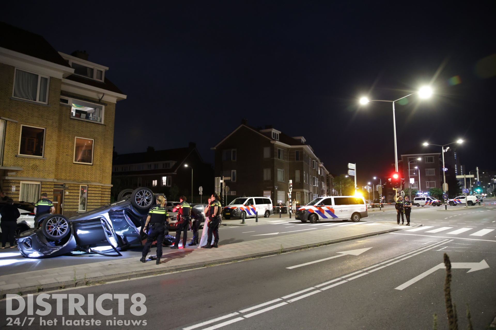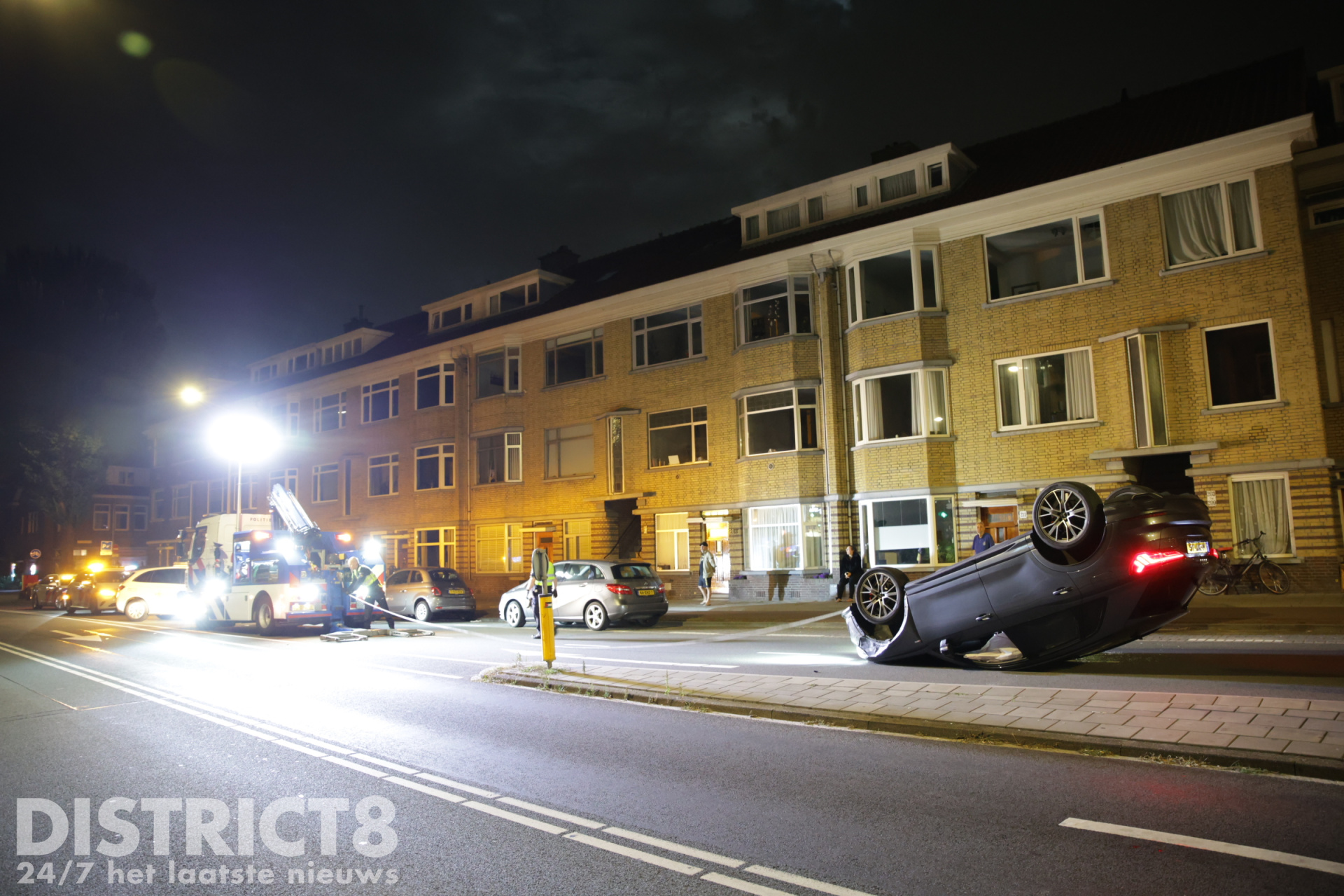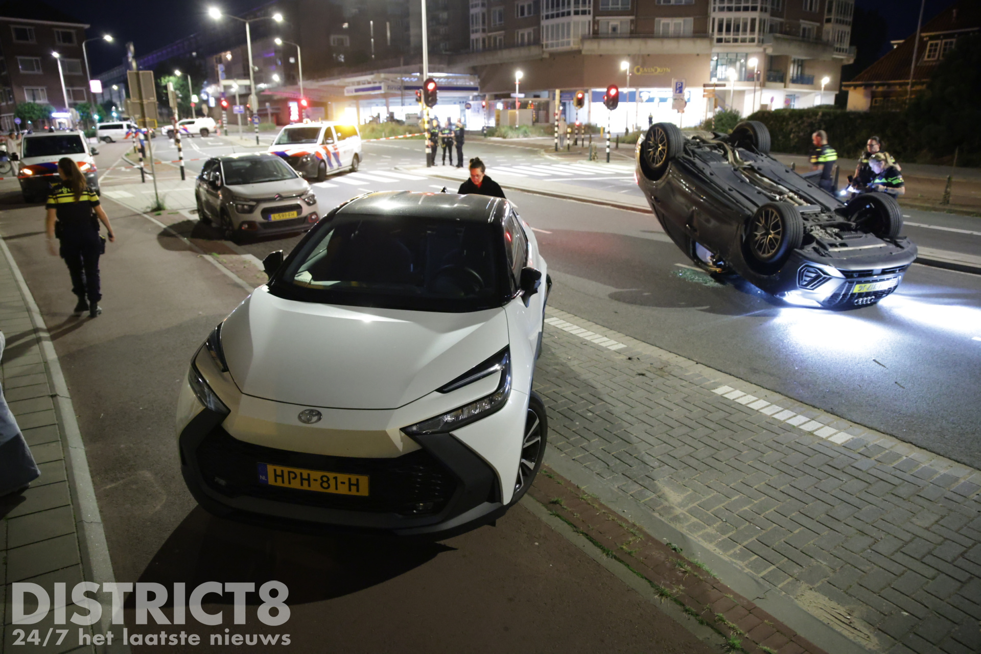 Den Haag – Op de Zwolsestraat met de Hasseltsestraat in Den Haag is in de nacht van zondag op maandag 8 september een auto over de kop gevlogen.