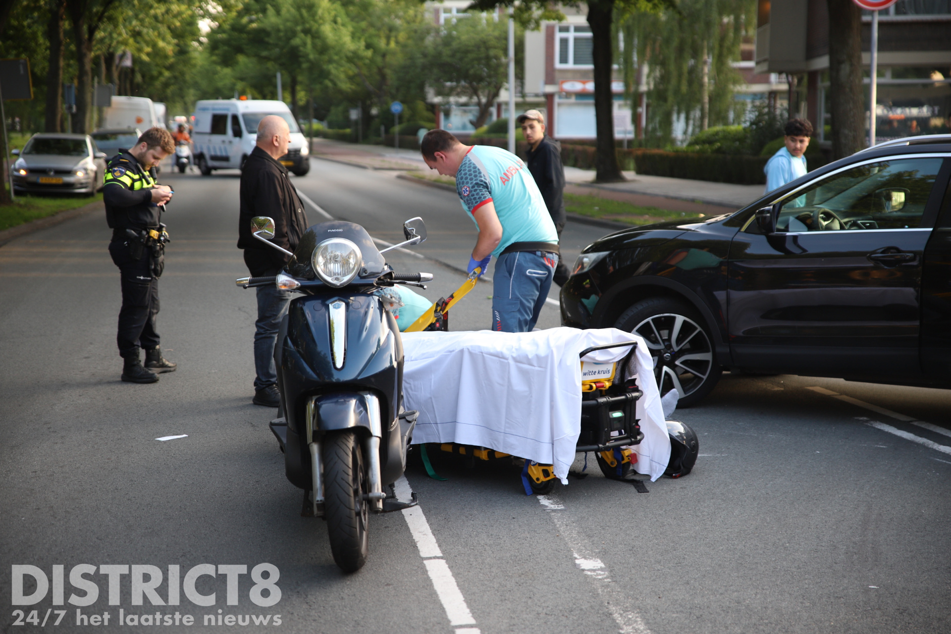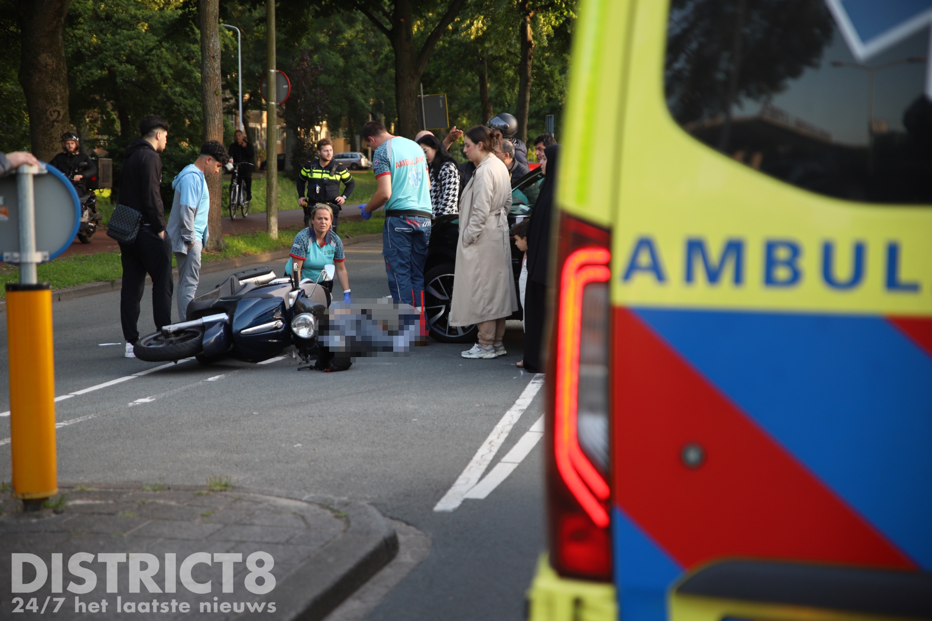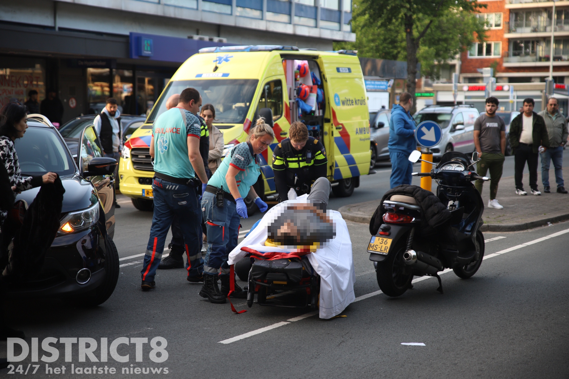 De bestuurder van de motorscooter raakte gewond en moest op straat gestabiliseerd worden. In de ambulance is hij verder behandeld en daarna met spoed (A1) naar het ziekenhuis vervoerd.