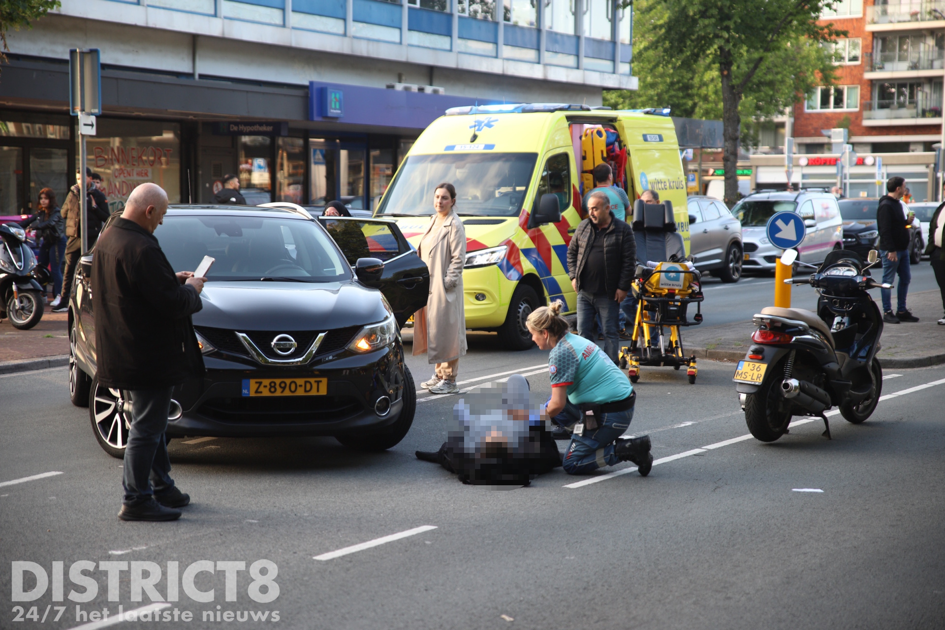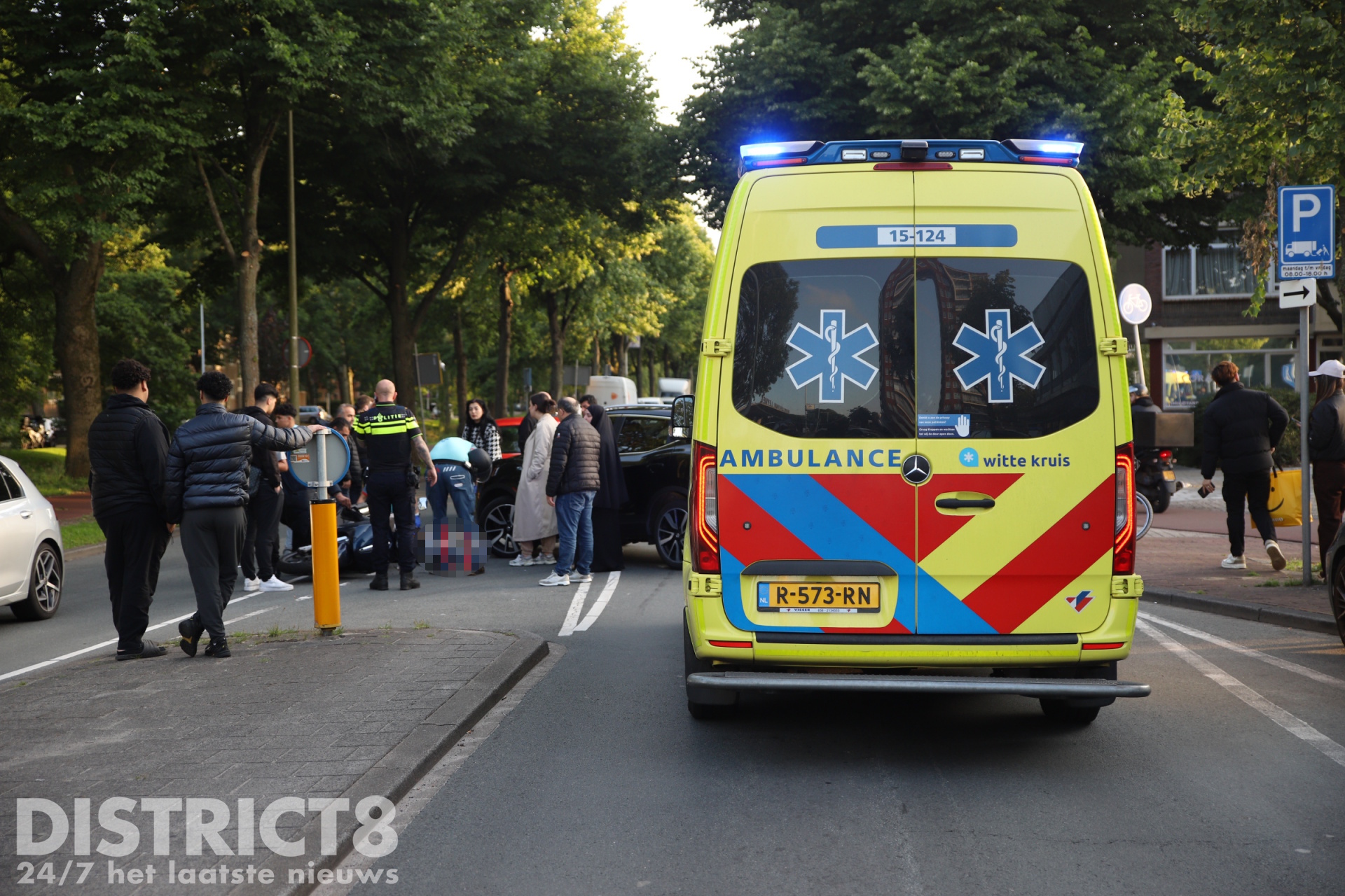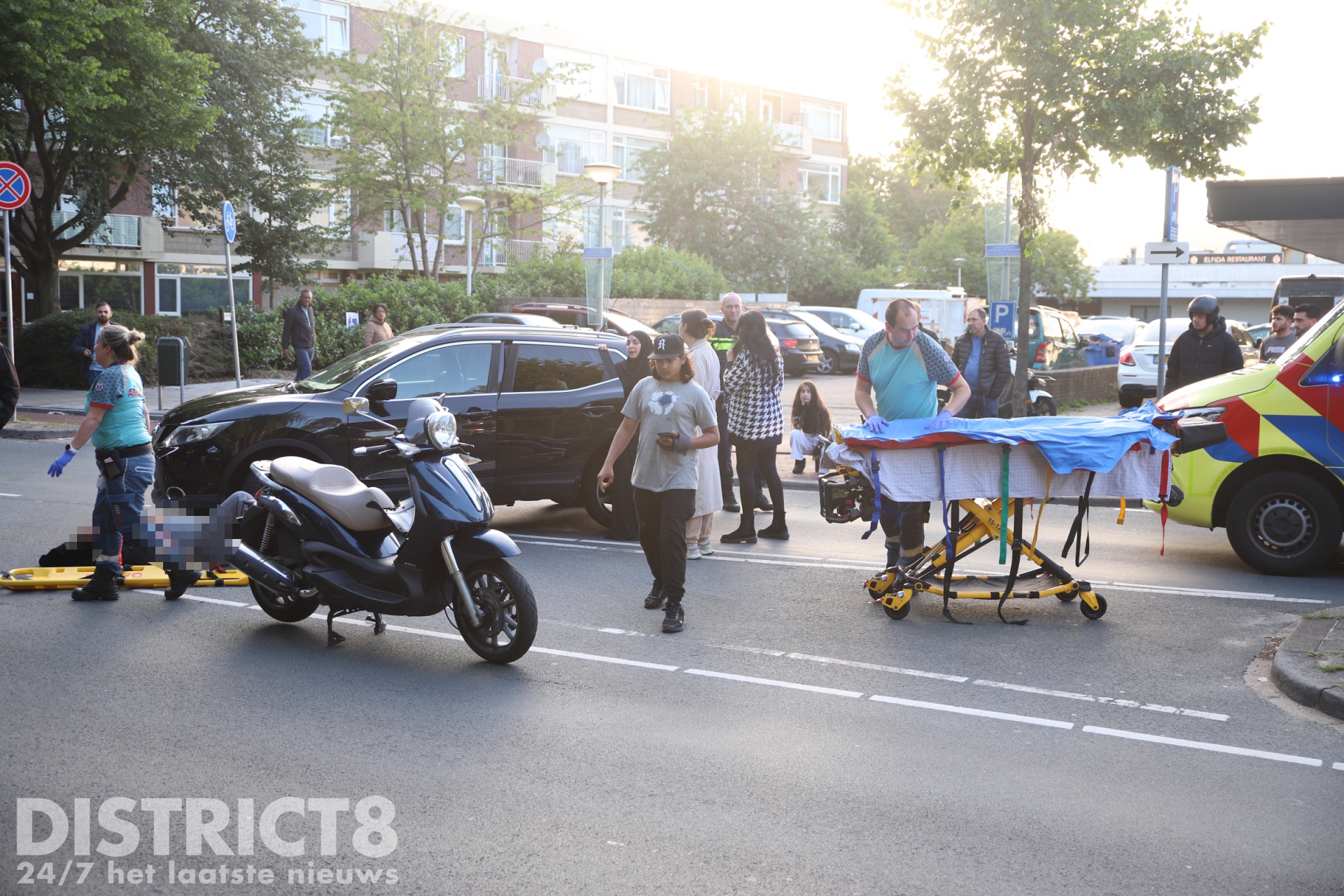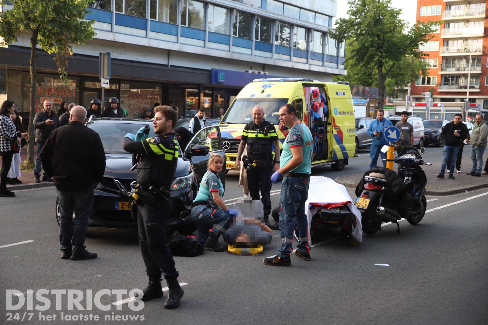 De bestuurder van de motorscooter raakte gewond en moest op straat gestabiliseerd worden. In de ambulance is hij verder behandeld en daarna met spoed (A1) naar het ziekenhuis vervoerd.