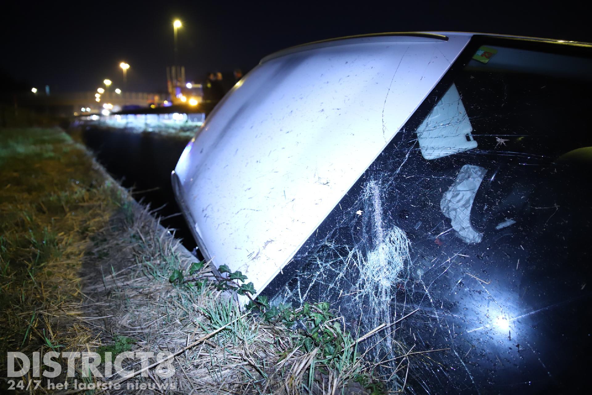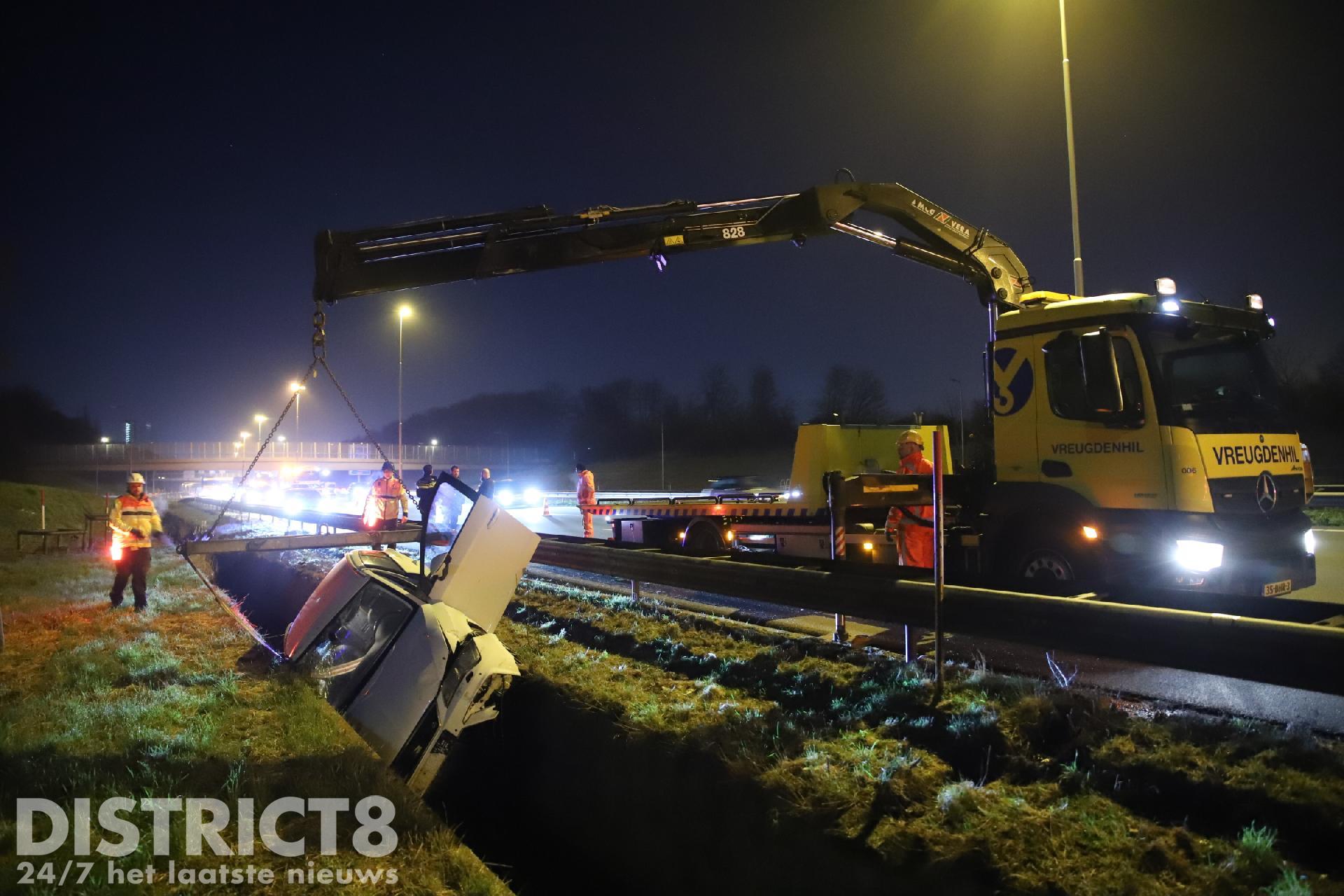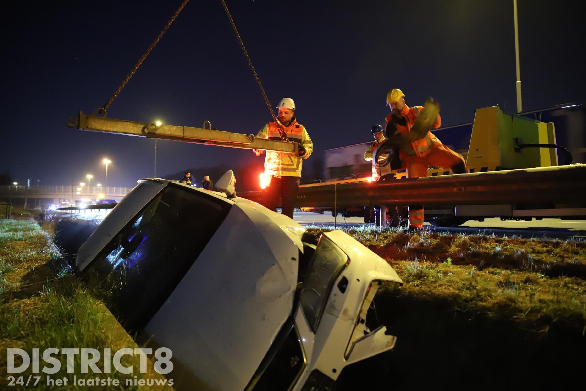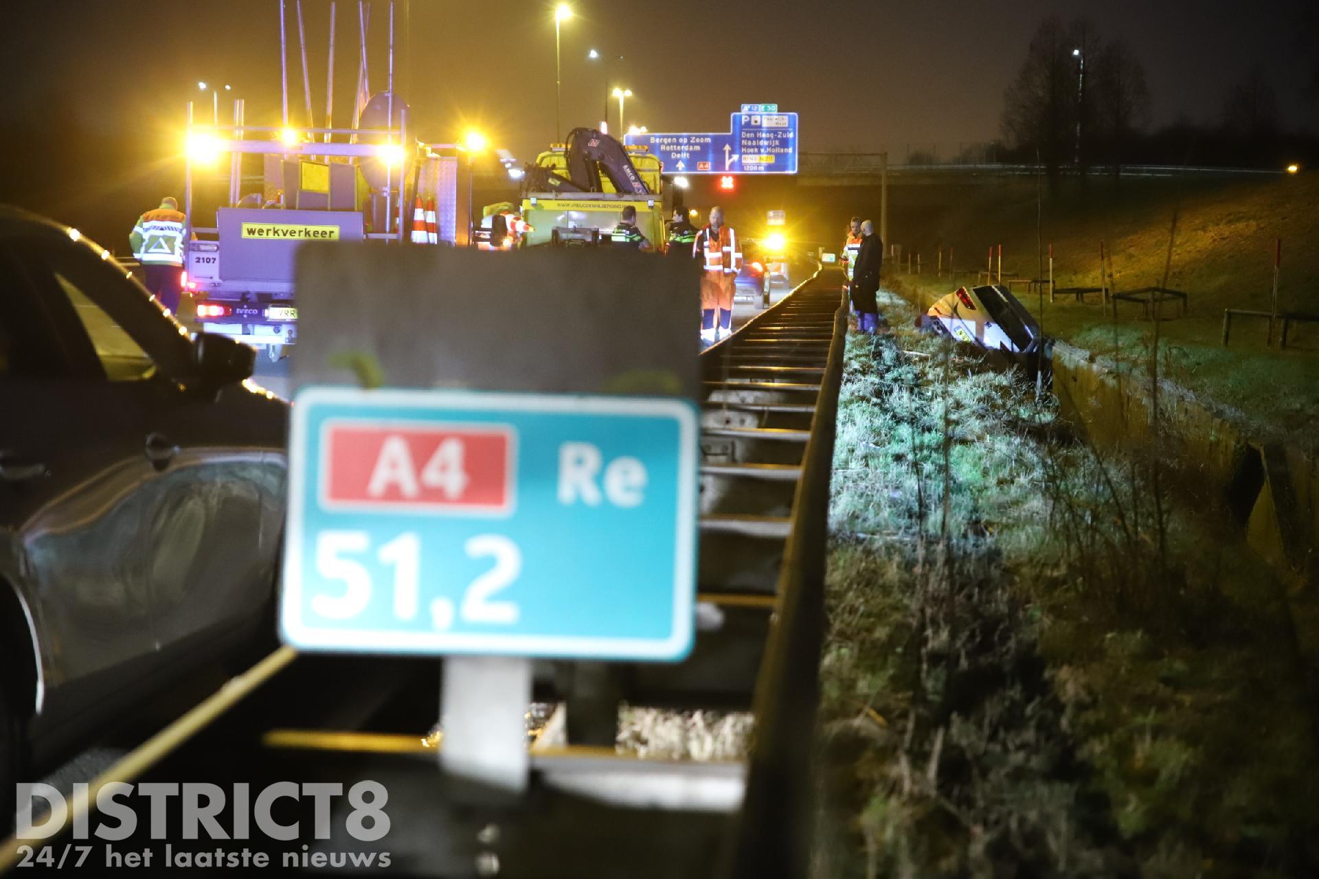 Een berger van bergingsbedrijf Vreugdenhil heeft met een kraan de auto uit de betonnen geul gehaald. De auto, die verhuurd werd, raakte door het eenzijdige ongeval total-loss. Omdat er onder andere sprake is van olie lekkage blijft één rijbaan van de A4 richting Rotterdam, en de afrit richting de Prinses Beatrixlaan afgesloten.