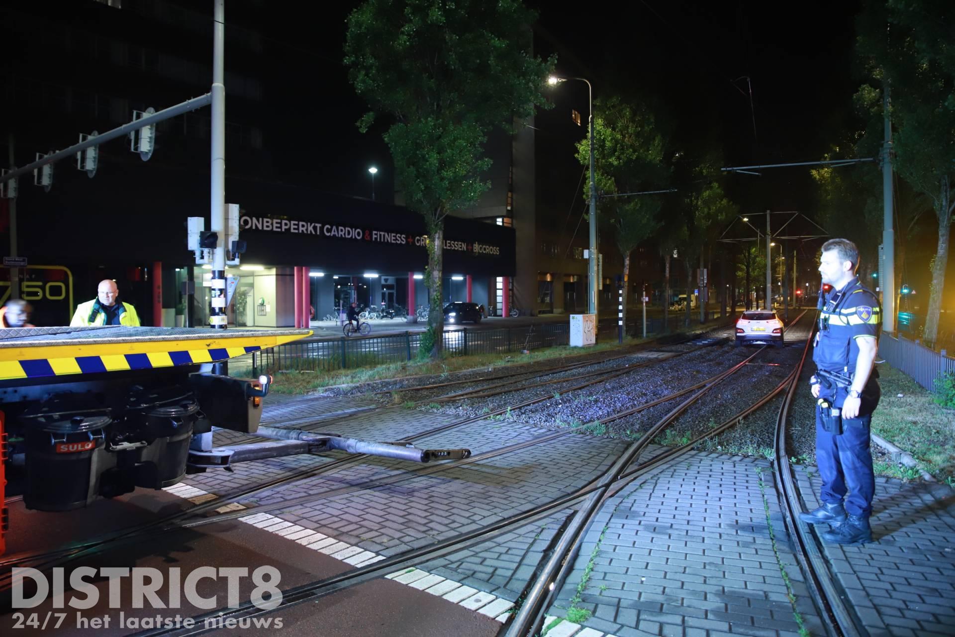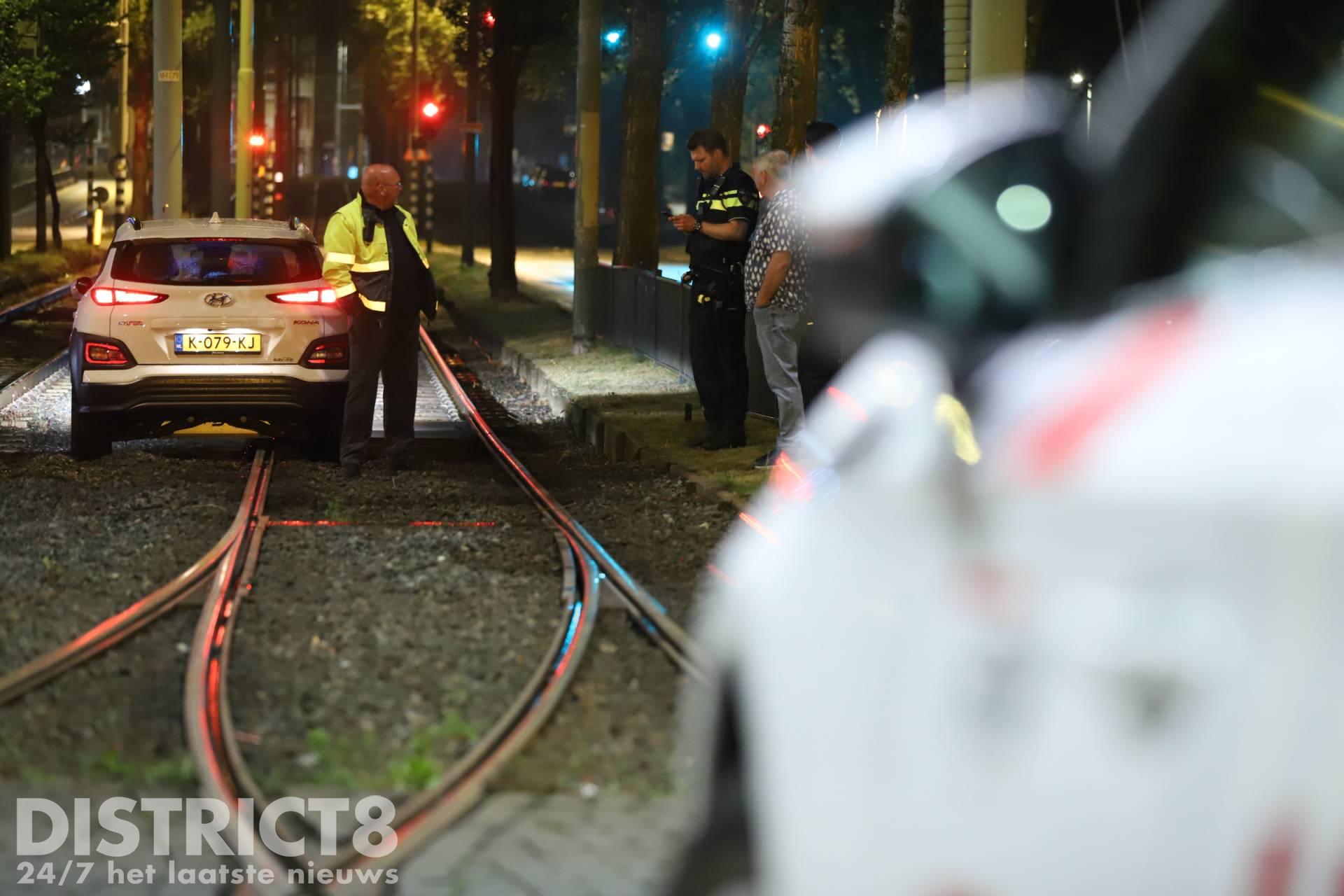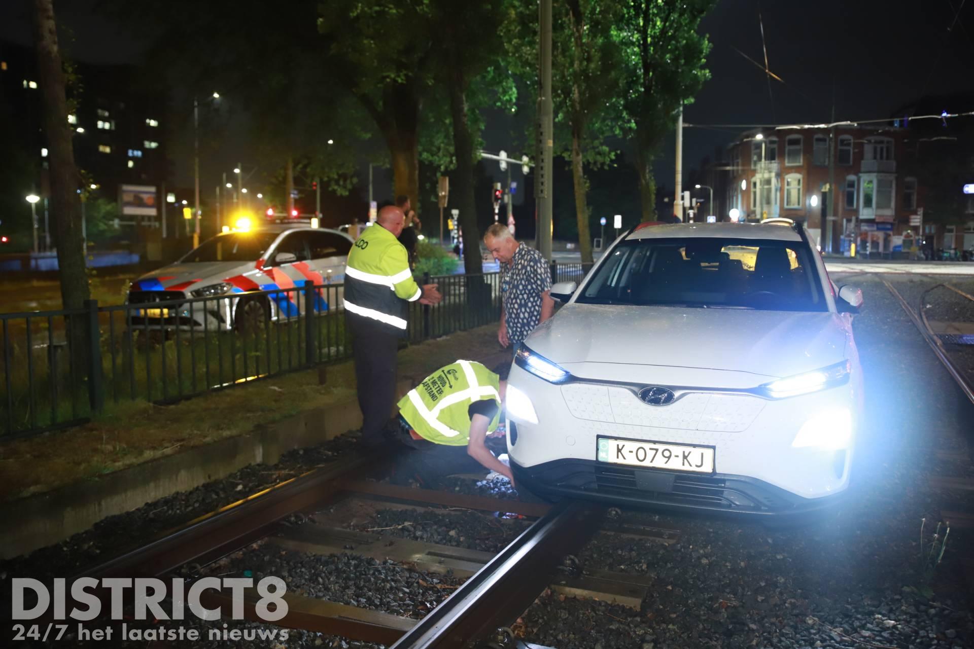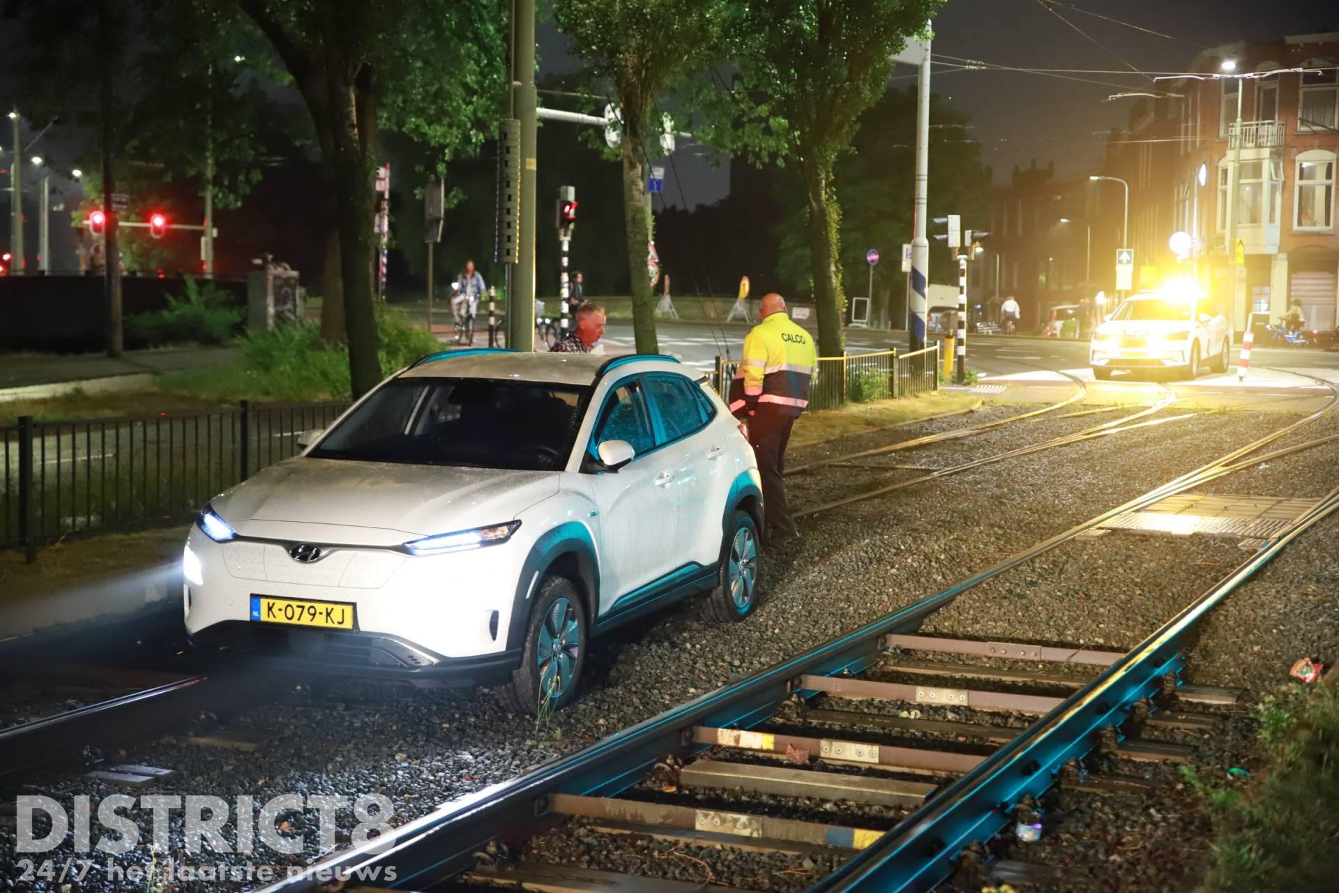 Den Haag – Op de Noord-West Buitensingel in Den Haag is in de nacht van zaterdag 25 op zondag 26 juni een auto vast komen te staan op de tramrails.