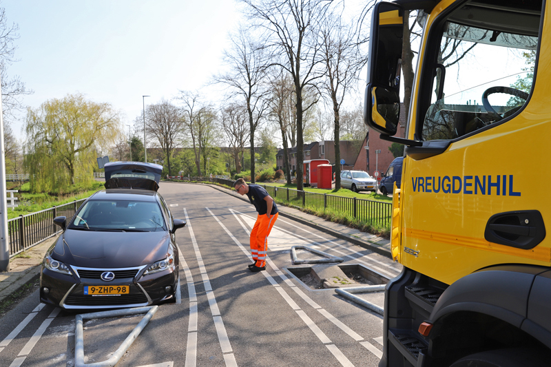 Een berger heeft uiteindelijk met een krik het voertuig omhoog kunnen krikken en achteruit kunnen rijden zodat het voertuig niet meer vast zat in de bussluis.