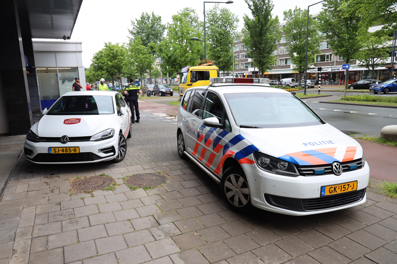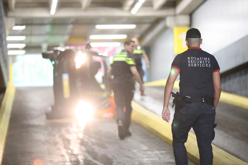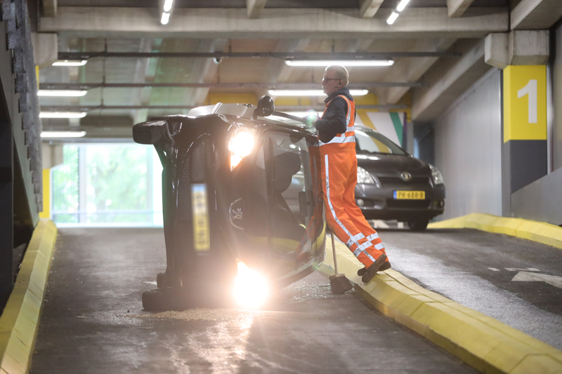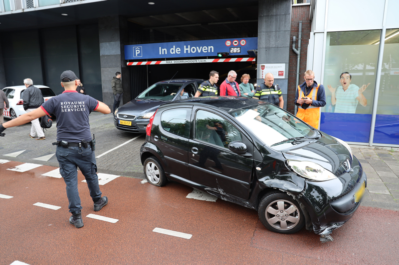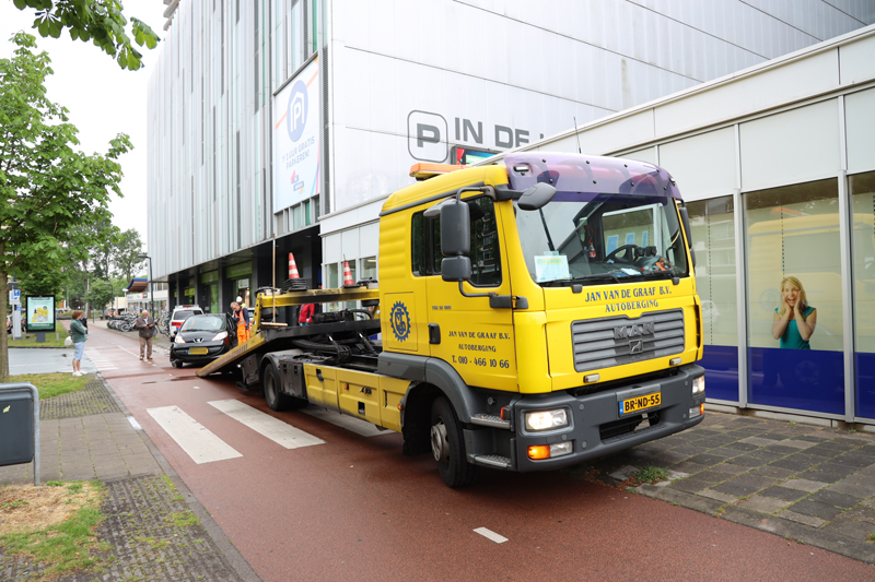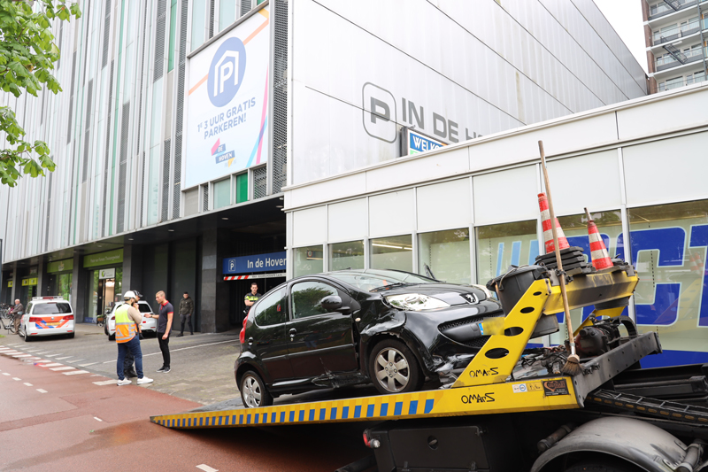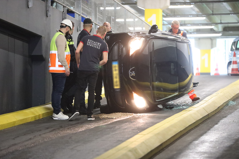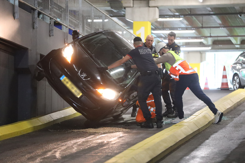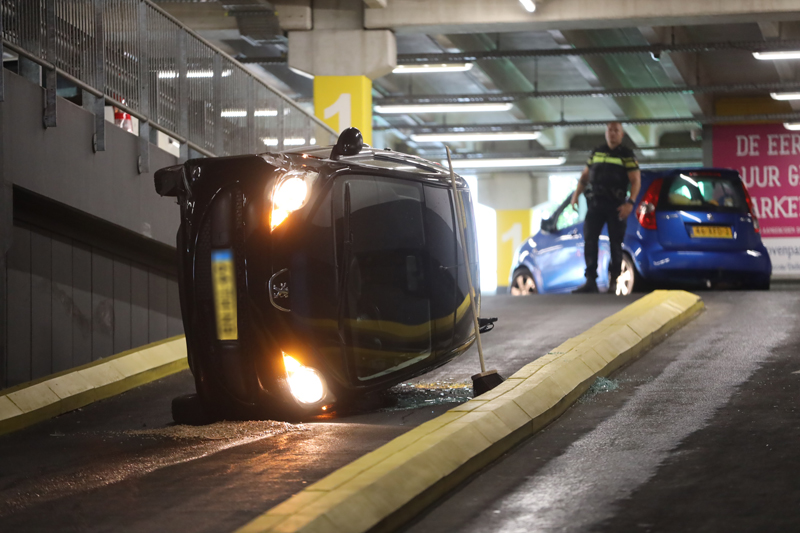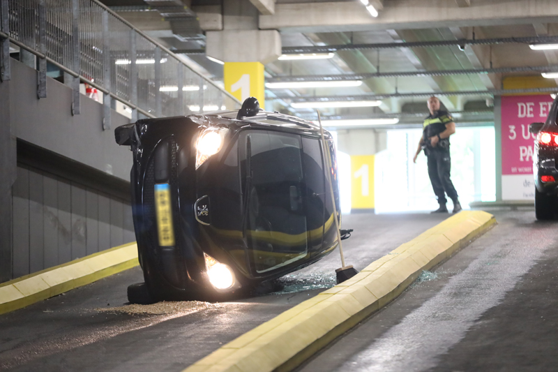 Delft – Woensdagochtend 5 juni is er op de helling van de parkeergarage van winkelcentrum De Hovenpassage aan de Papsouwselaan in Delft een auto op z’n kant terecht gekomen.