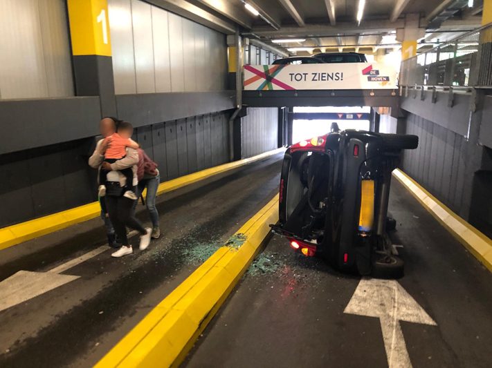 Even na half 11 kwam de auto door nog onbekende oorzaak op z’n kant terecht, een beveiliger van het winkelcentrum merkte dit direct op en schoot de inzittenden, moeder en kind te hulp en haalde deze uit de auto.
