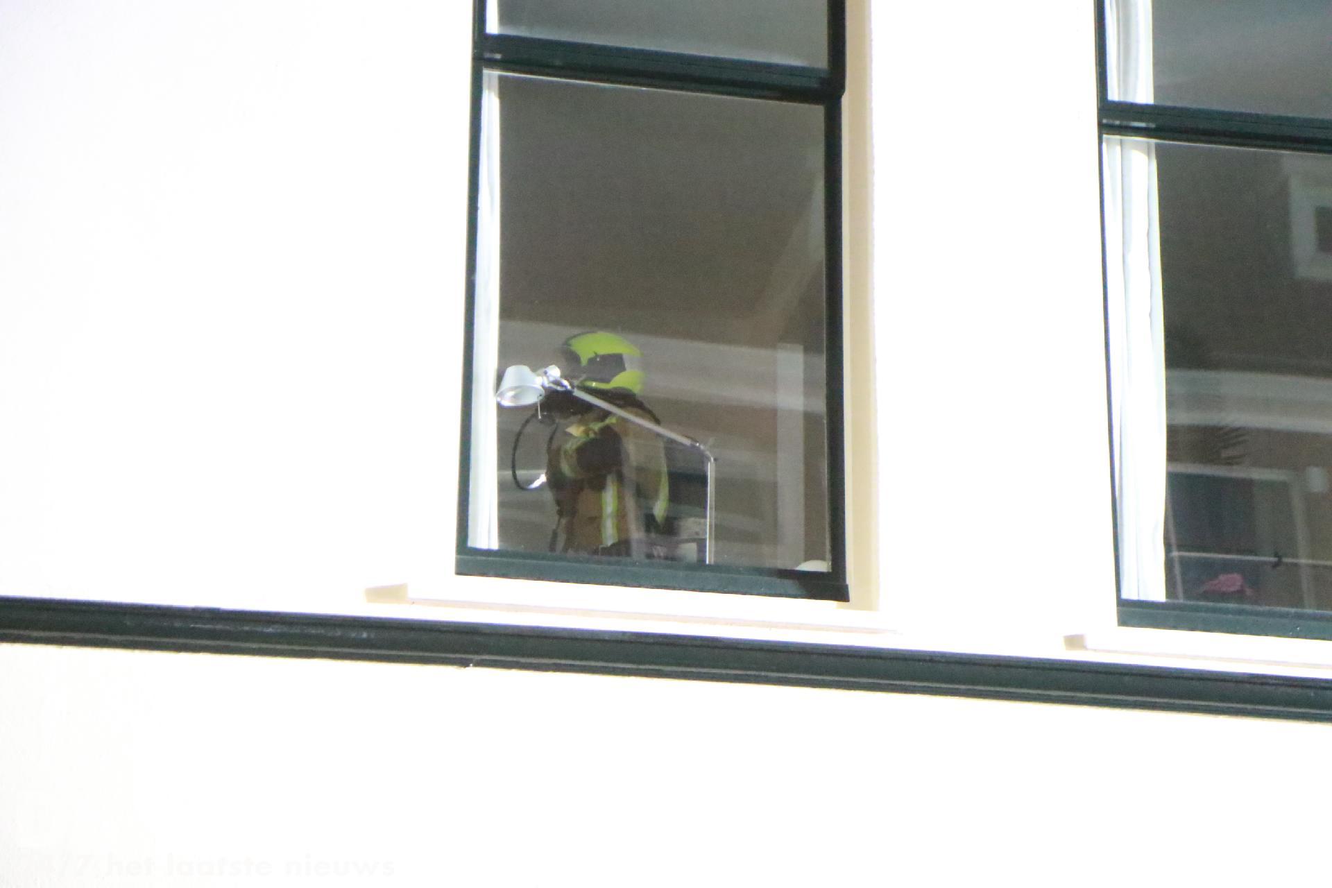 De band ontstond in de meterkast van een bedrijfspand onder de woning. Het pand staat leeg. De brandweer heeft opgeschaald naar middelbrand.