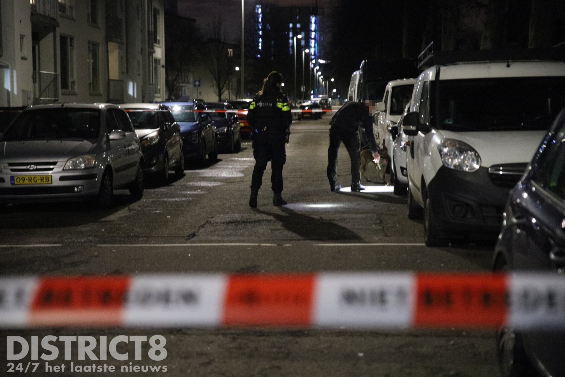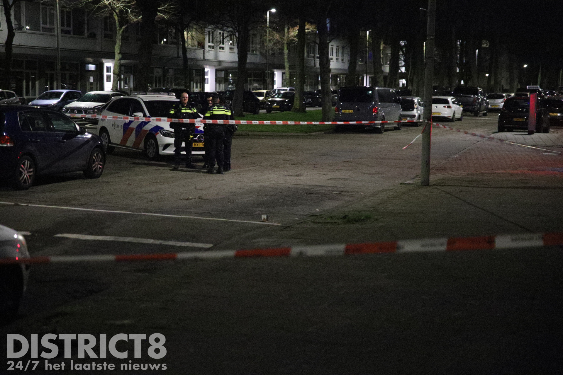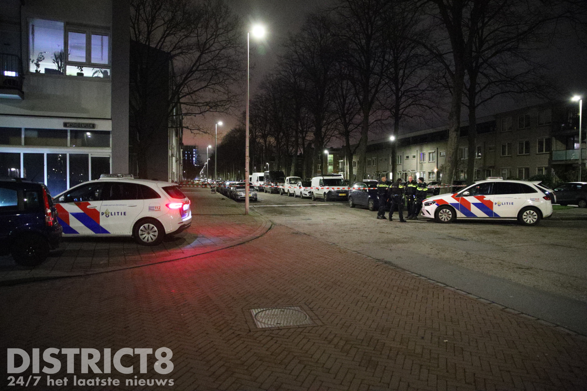 Na het incident is de verdachte rennend gevlucht in de richting van de Erasmusweg. De politie heeft verschillende delen van de straat afgezet met lint en deze ingericht als Plaats Delict. Voor een portiek staan twee pylonnen met daaronder kogelhulzen.