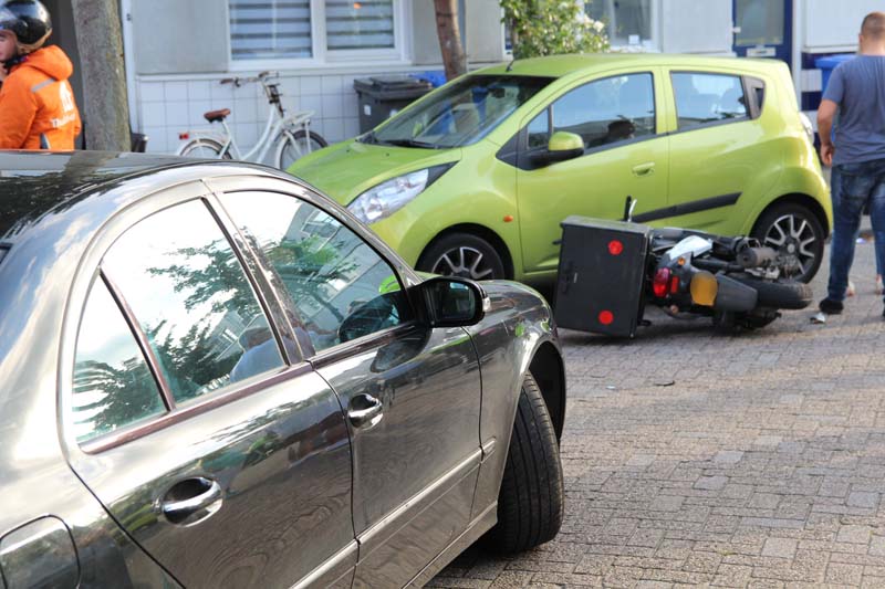 De personenauto kwam uit een parkeervak en zag de bezorgscooter over het hoofd. De bezorgscooter kwam hard op de stenen terecht, en viel tegen een andere geparkeerde auto aan.