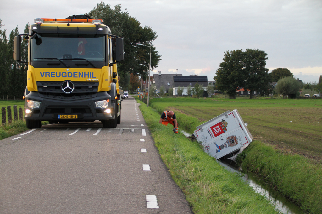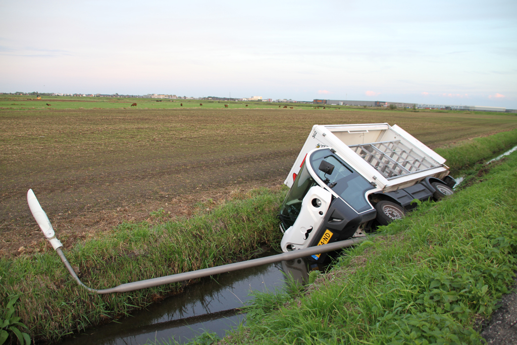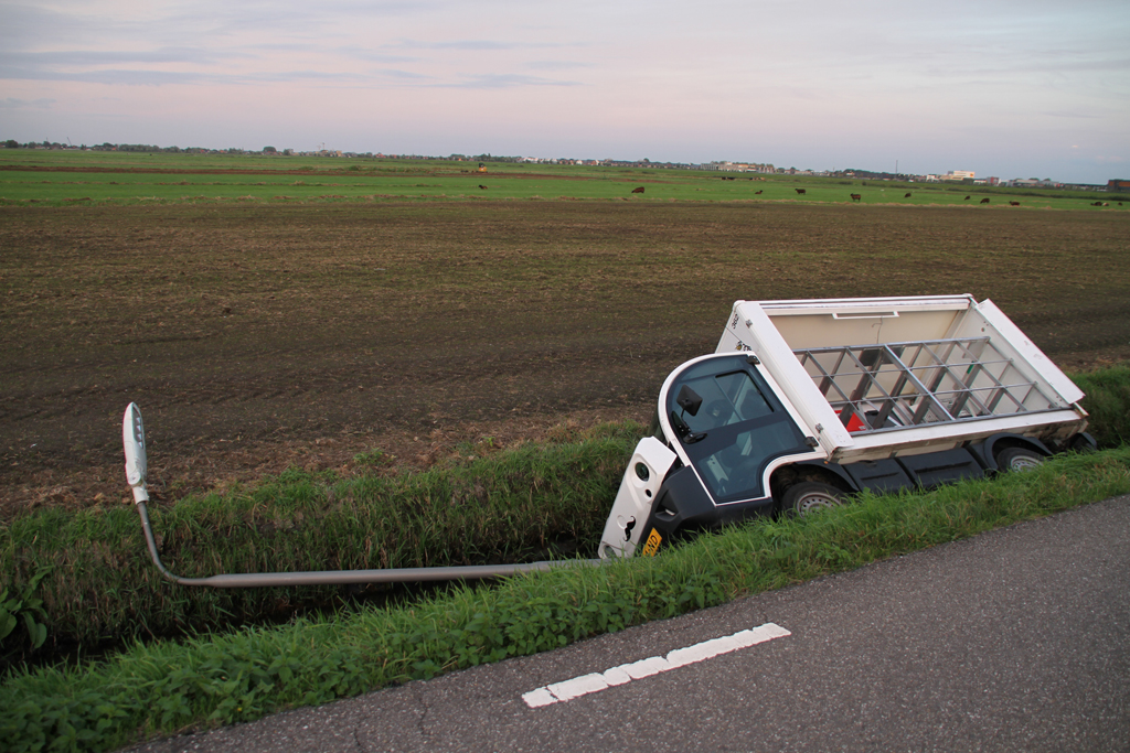 De bestuurder van het bezorgwagentje moest uitwijken voor een passerende automobilist, de bezorger kwam met twee wielen in een berm terecht en kantelde. In de berm nam hij ook een lantaarnpaal mee, deze is ontworteld en ligt onder het wagentje.