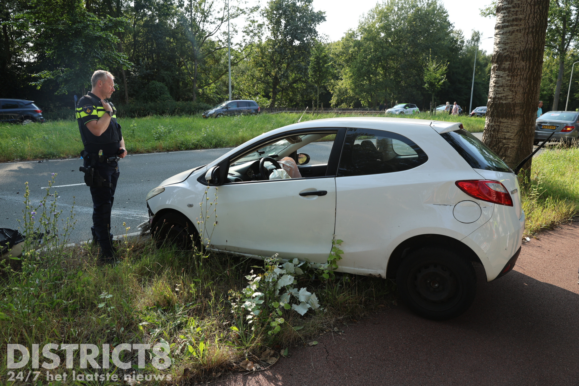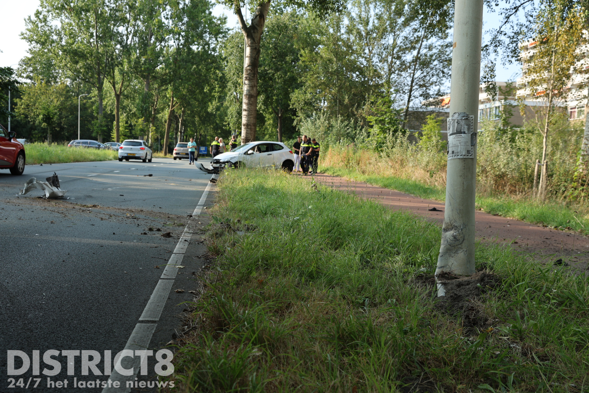 De bestuurster kwam door nog onbekende oorzaak deels in de berm terecht en ramde de lichtmast. De auto kwam enkele meters verder tot stilstand.