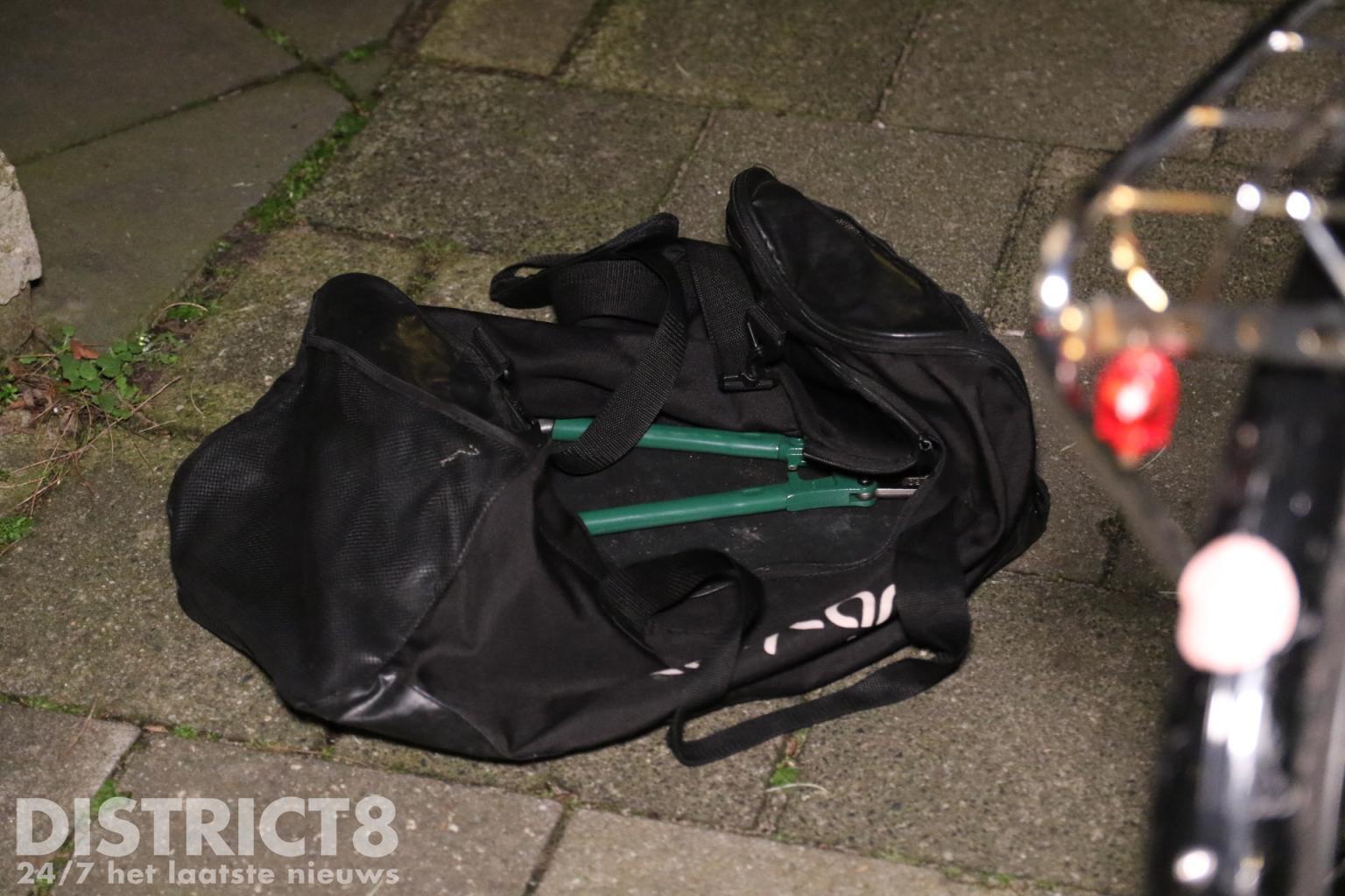 Op de kruising van de Oranjelaan met de Geestbrugweg werd even later een fiets aangetroffen, met in de transportkrat een zwarte tas. Toen een agent de tas opende bleek hier inbrekerswerktuig in te zitten. Elders in de omgeving werden de twee bivakmutsen aangetroffen.