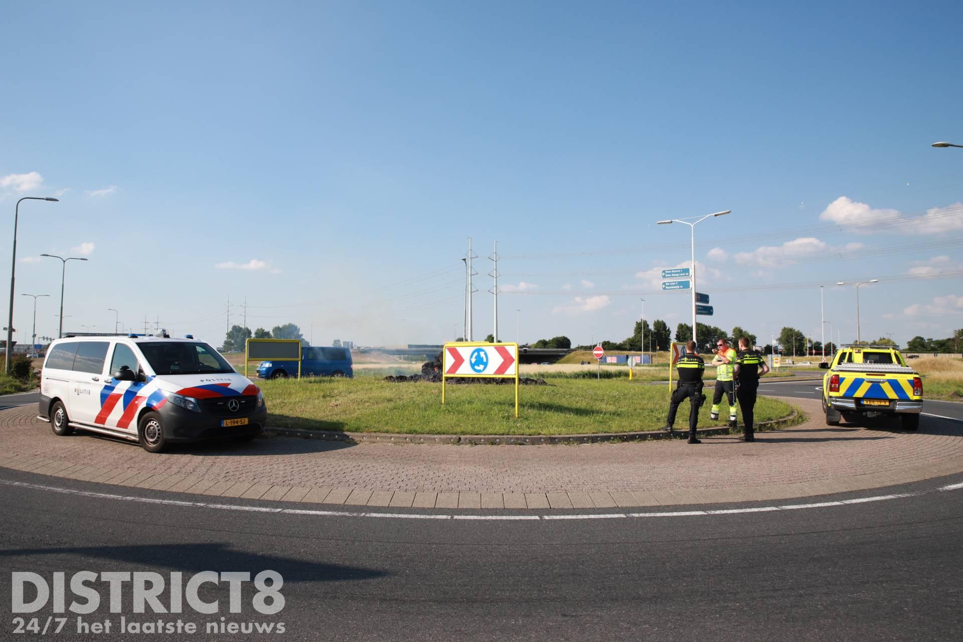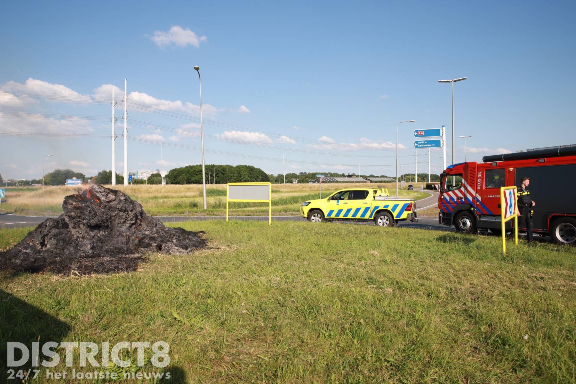 Schipluiden – Op de rotonde van de afrit A4 met de Klaas Engelbrechtsweg in Schipluiden zijn vanmiddag enkele hooibalen in brand gestoken. Volgens onze tipgever was dit een actie van enkele boeren.