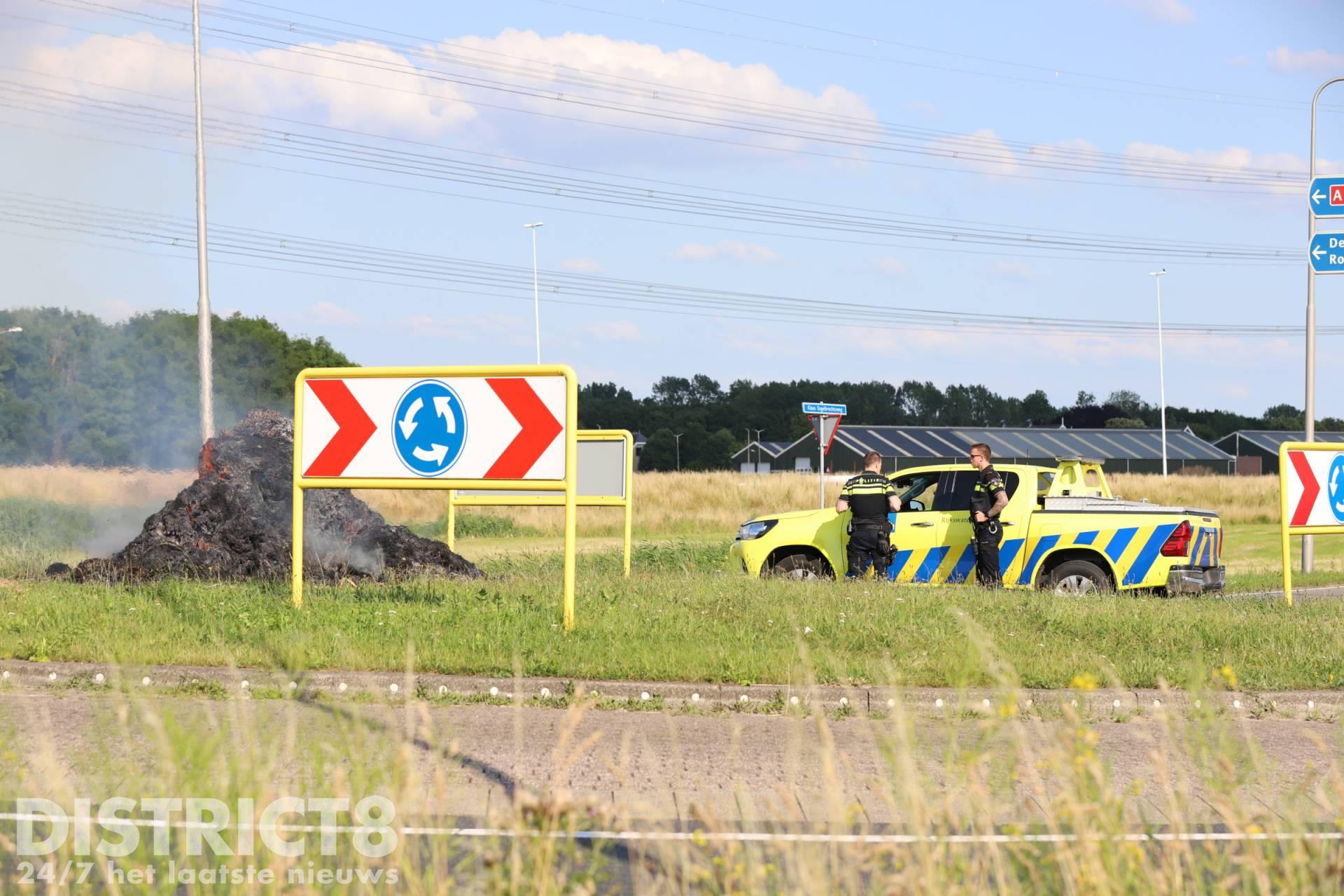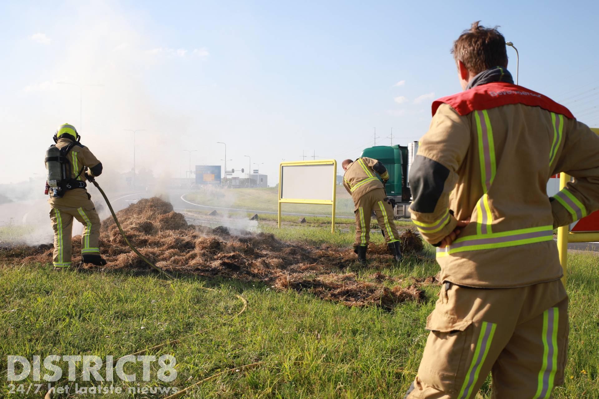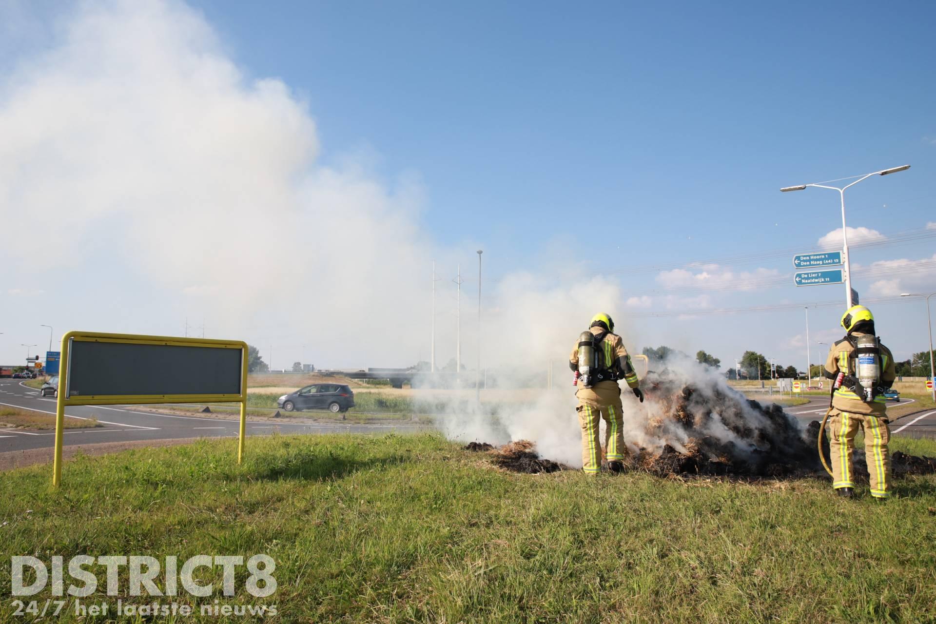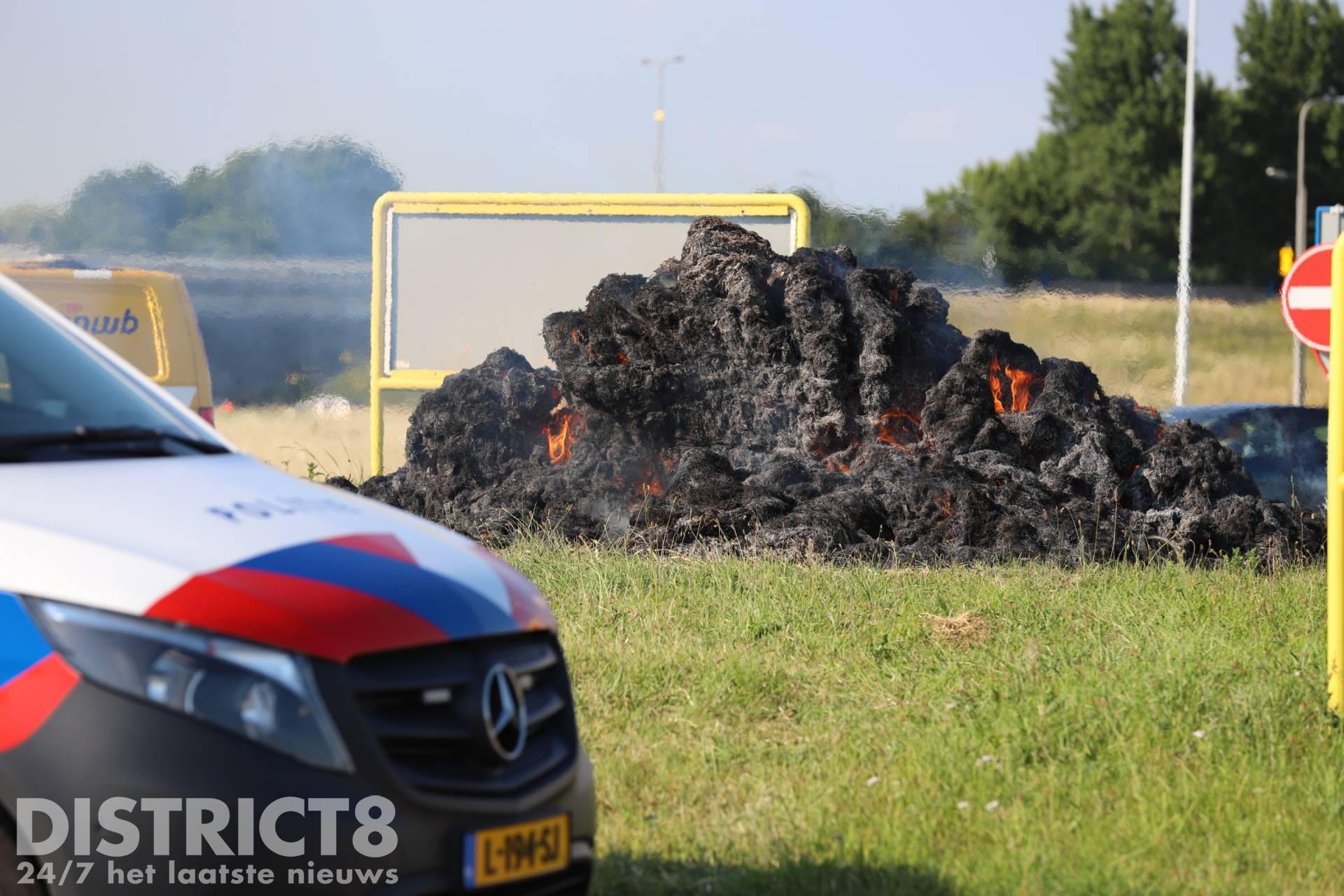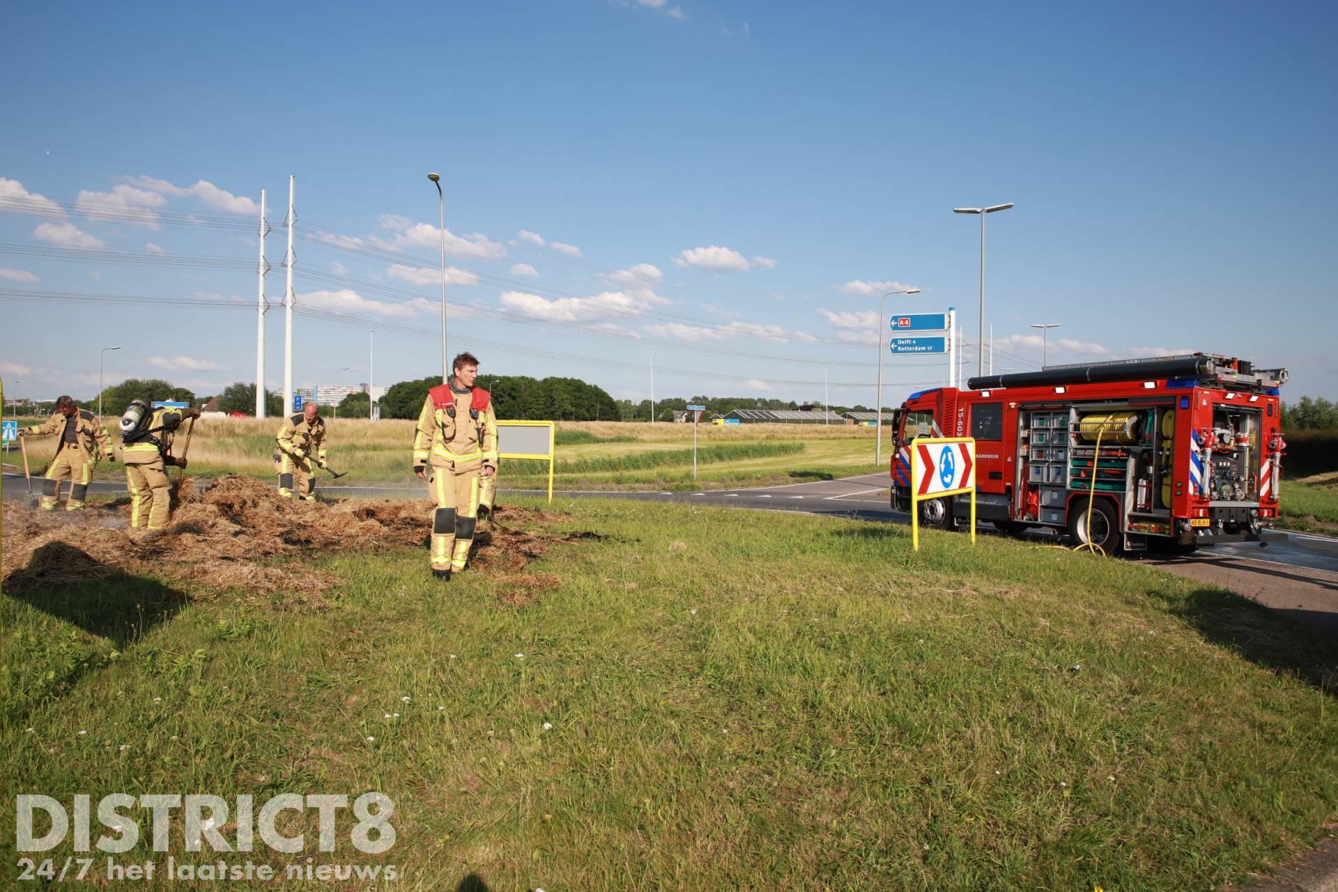 De brandweer moest eraan te pas komen om het vuur te blussen. Doormiddel van hooivorken werden de balen uit elkaar getrokken om het vuur volledig uit te krijgen.