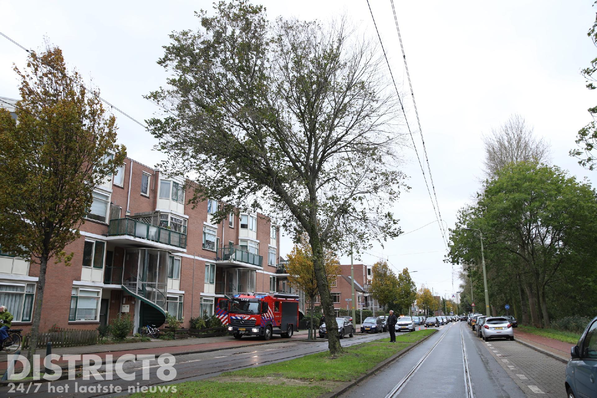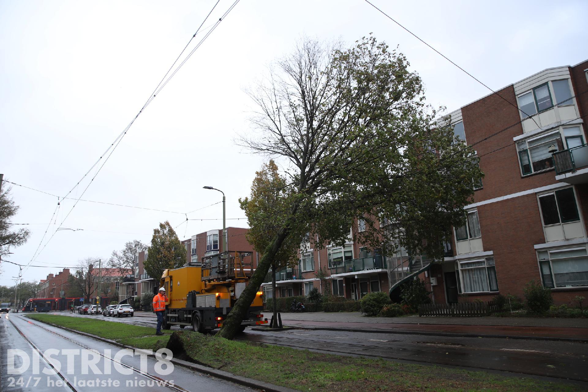 Ook werd de verkeersdienst van de HTM ter plaatse gevraagd. Eenmaal ter plaatse troffen de brandweerlieden een boom die dreigt om te vallen op de bovenleiding van het tramspoor.