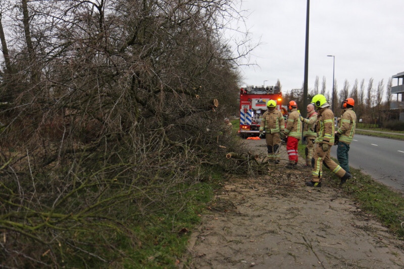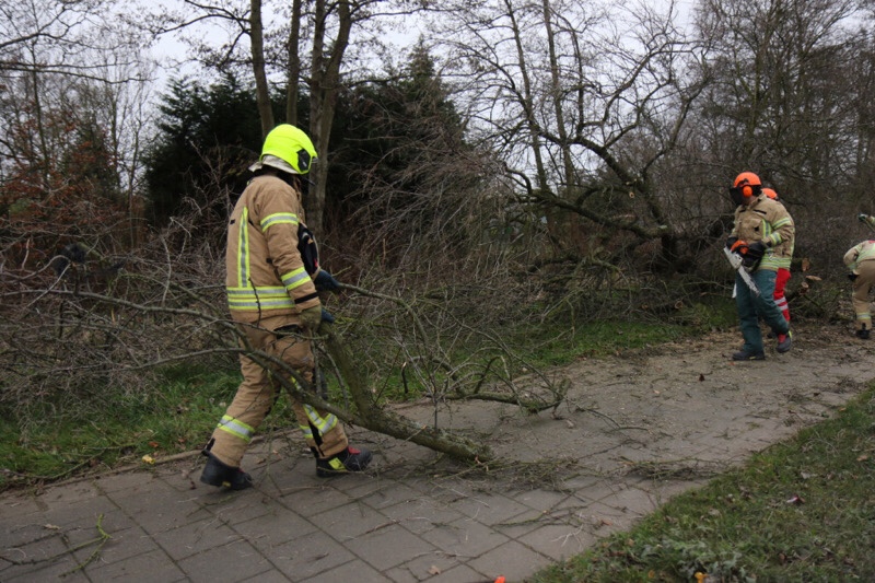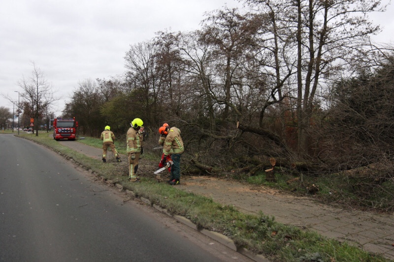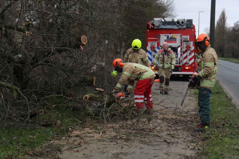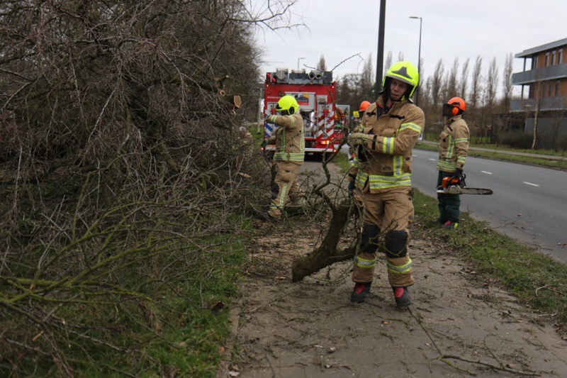 De brandweer heeft de boom in stukken gezaagd en het fietspad weer vrij gemaakt. Hulpdiensten hebben het vandaag zeer druk met losgewaaide daken, omgevallen hekken en andere stormschade.