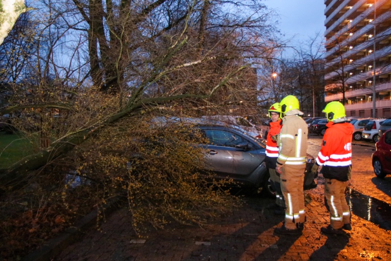 De ene viel om tegen een auto de andere hield het nog net vol en bleef scheef staan. Nadat de auto eronderuit was gereden kon de brandweer de boom in stukken zagen. De schade aan de auto viel mee op wat lakschade na.