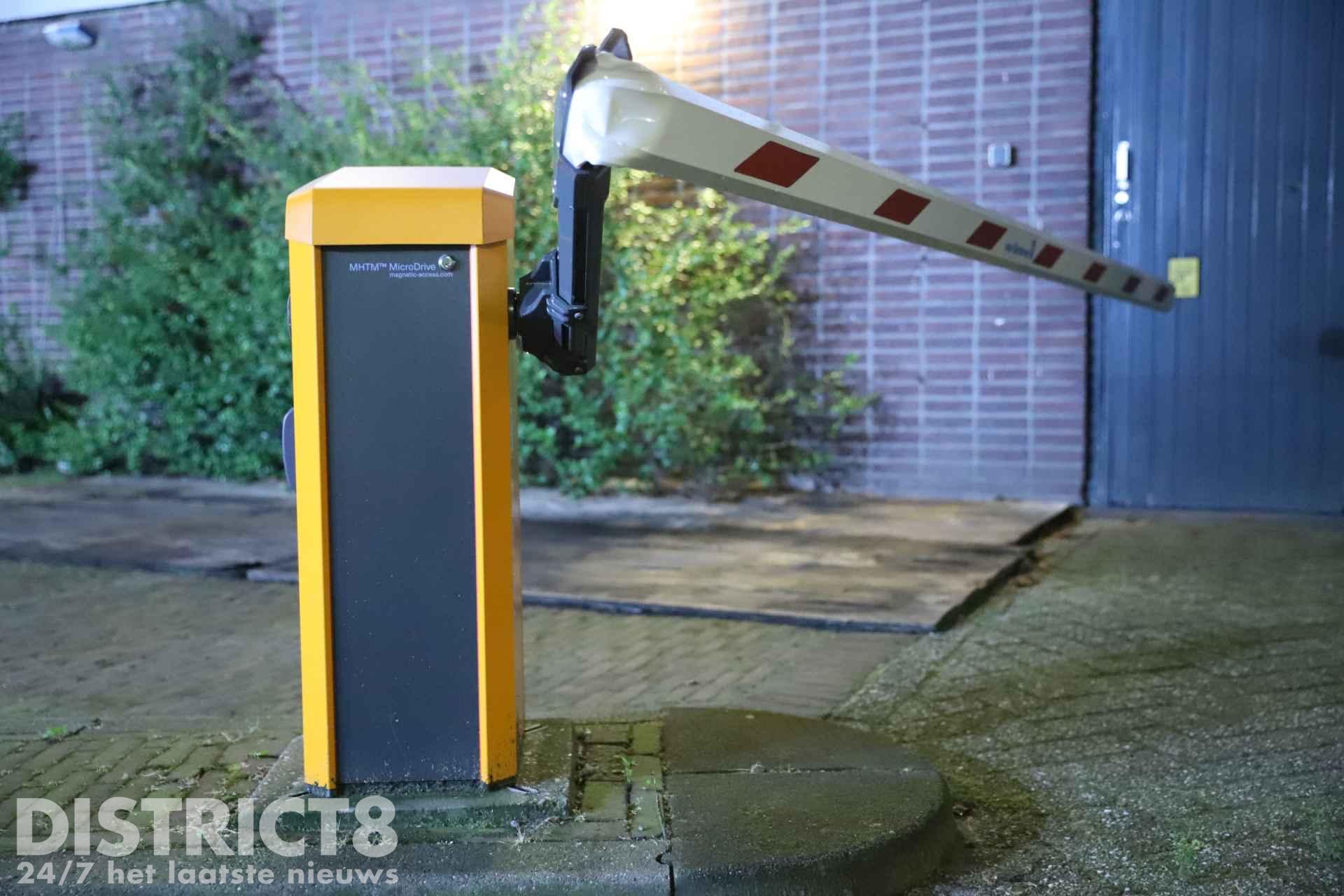 Voor de hoogwerker moest een slagboom het ontgelden; deze is vakkundig omgebogen zodat de hoogwerker er door heen kon.
