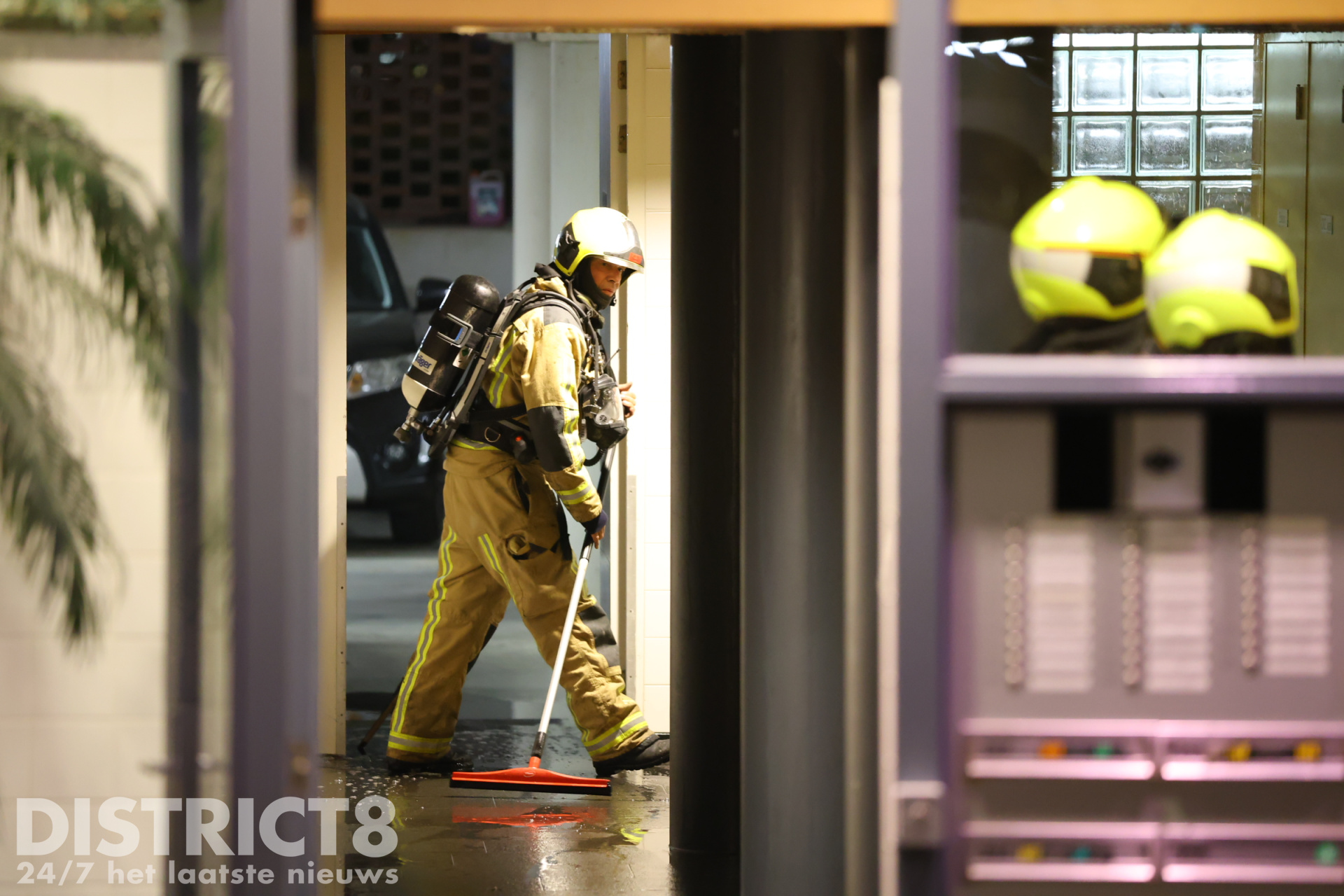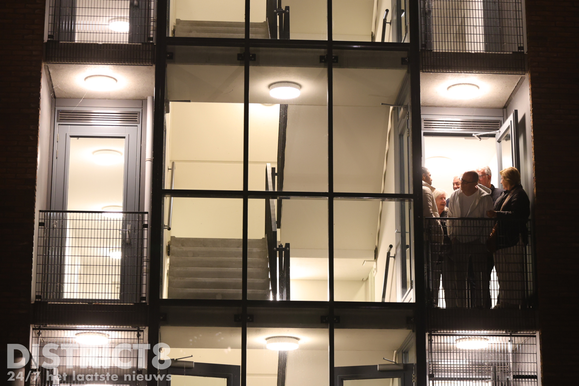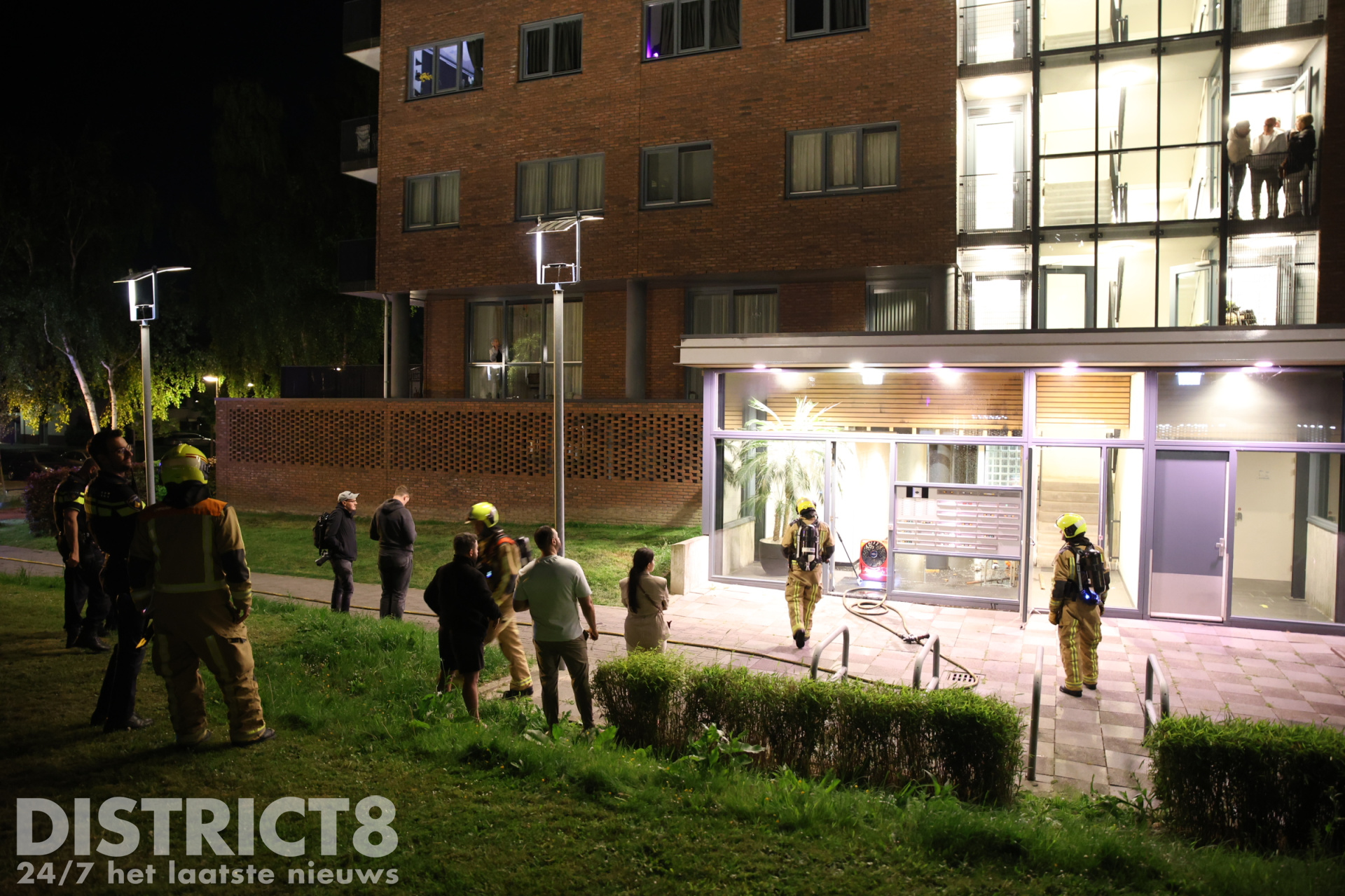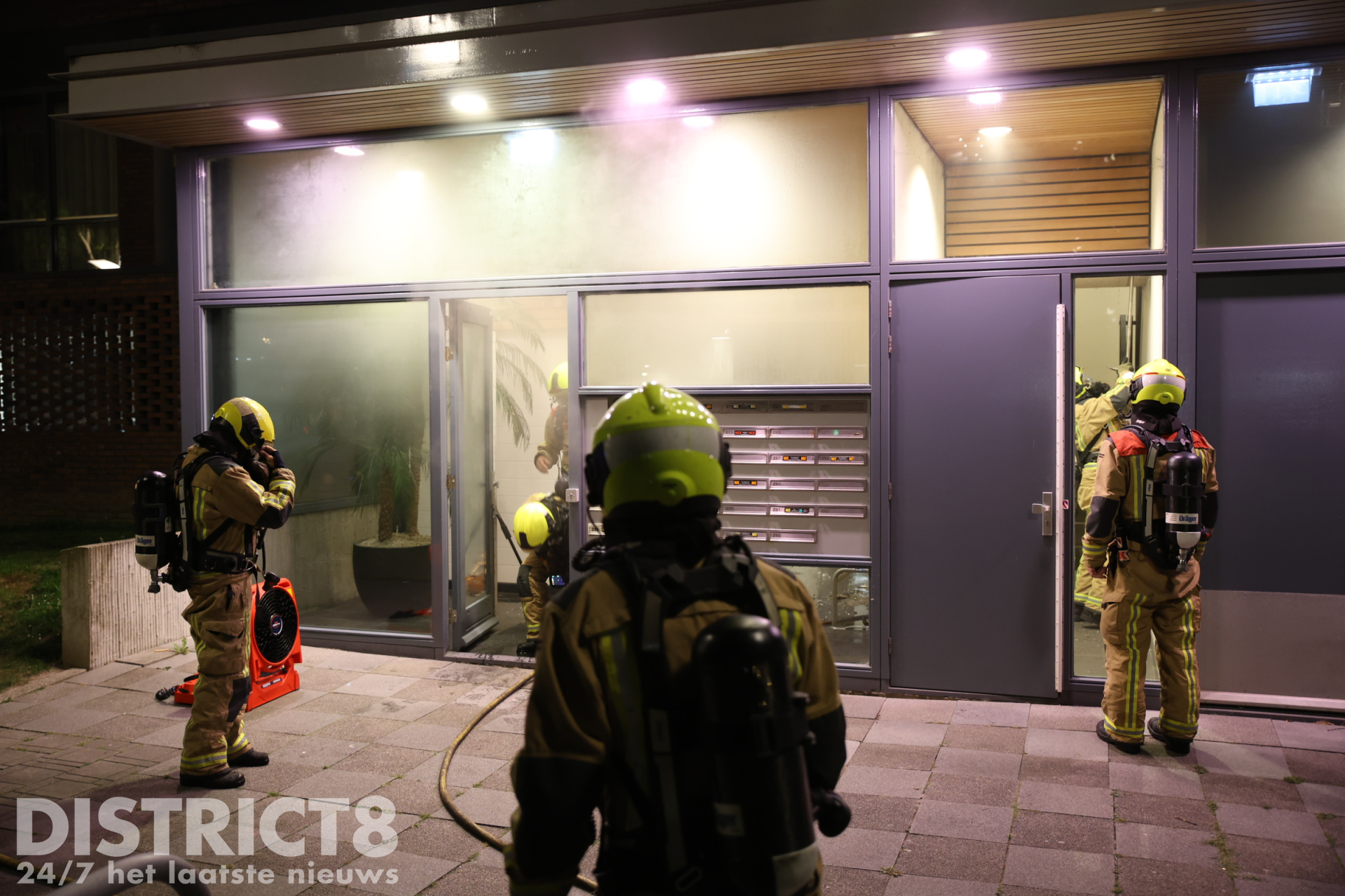 Bij aankomst van de brandweer stond de gehele hal van de flat vol rook. De brand woedde vermoedelijk in het plafond. Bewoners raakten in paniek en vluchtten naar hun nabijgelegen balkons om aan de rook te ontsnappen.