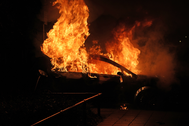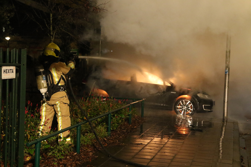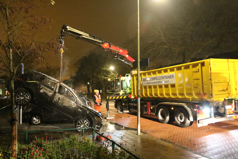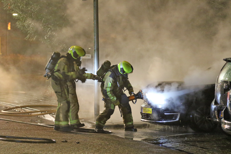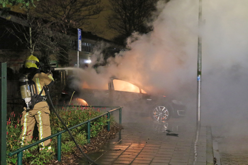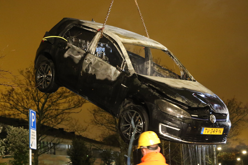 De auto zal zeker een week onder water gehouden moeten worden om een nieuwe ontbranding te voorkomen.