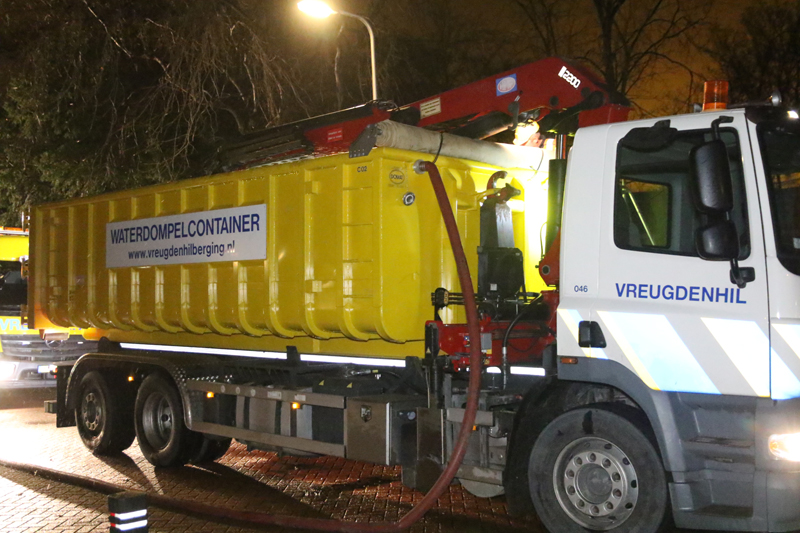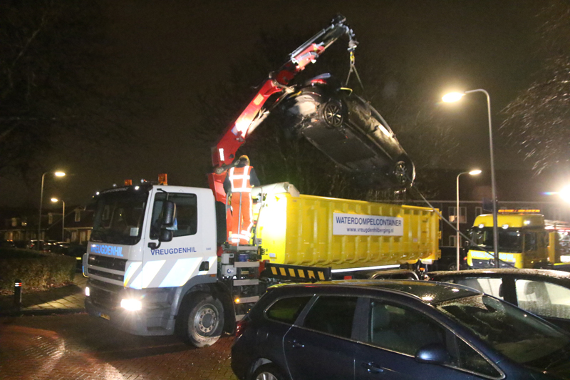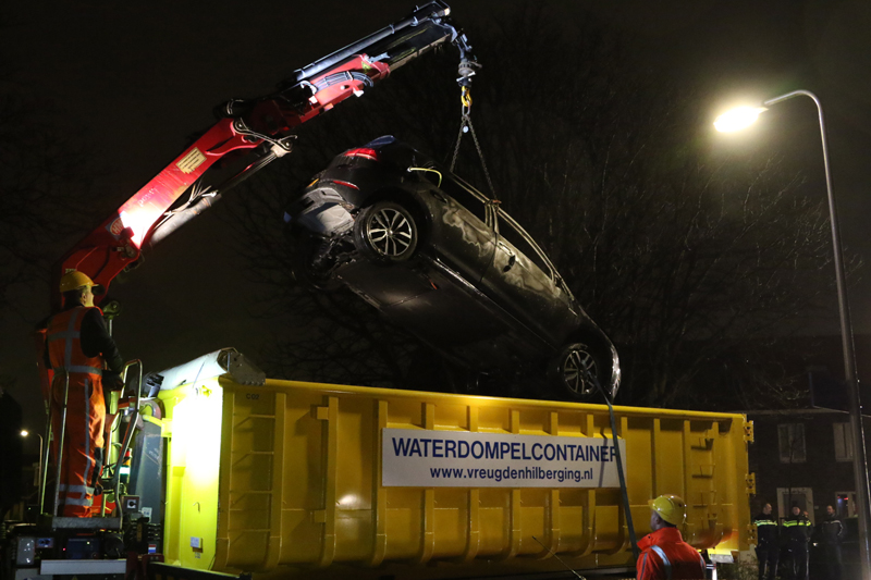 Een Waterdompelcontainer van bergingsbedrijf Vreugdenhil kwam ter plaatse. De elektrische auto is door een kraan in de container gehesen en hierna ondergedompeld met water.