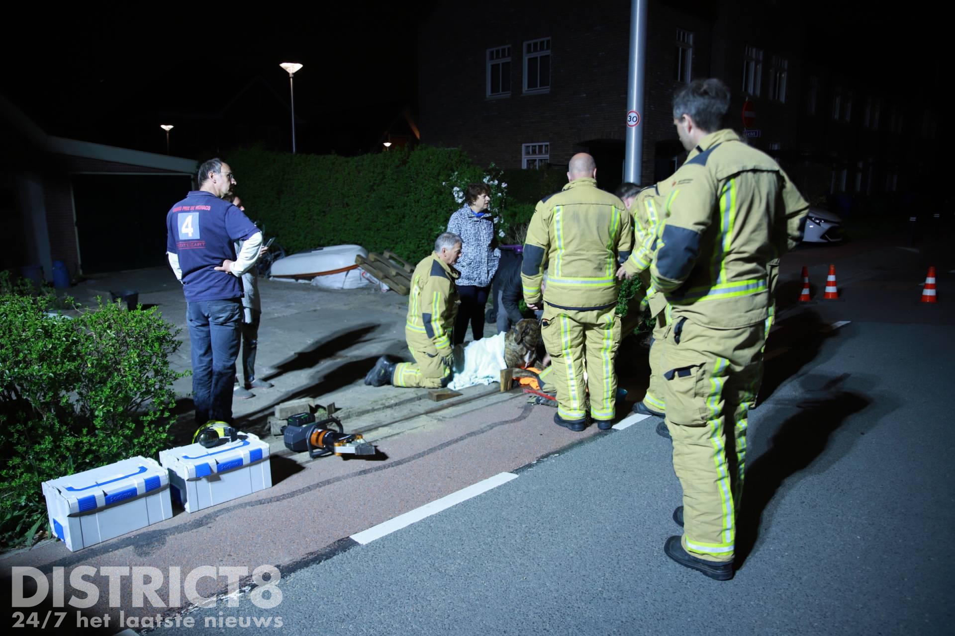 De bemanning van het hulpverleningsvoertuig heeft met moeite de hond kunnen bevrijden. De hond heeft in totaal 40 minuten vastgezeten.