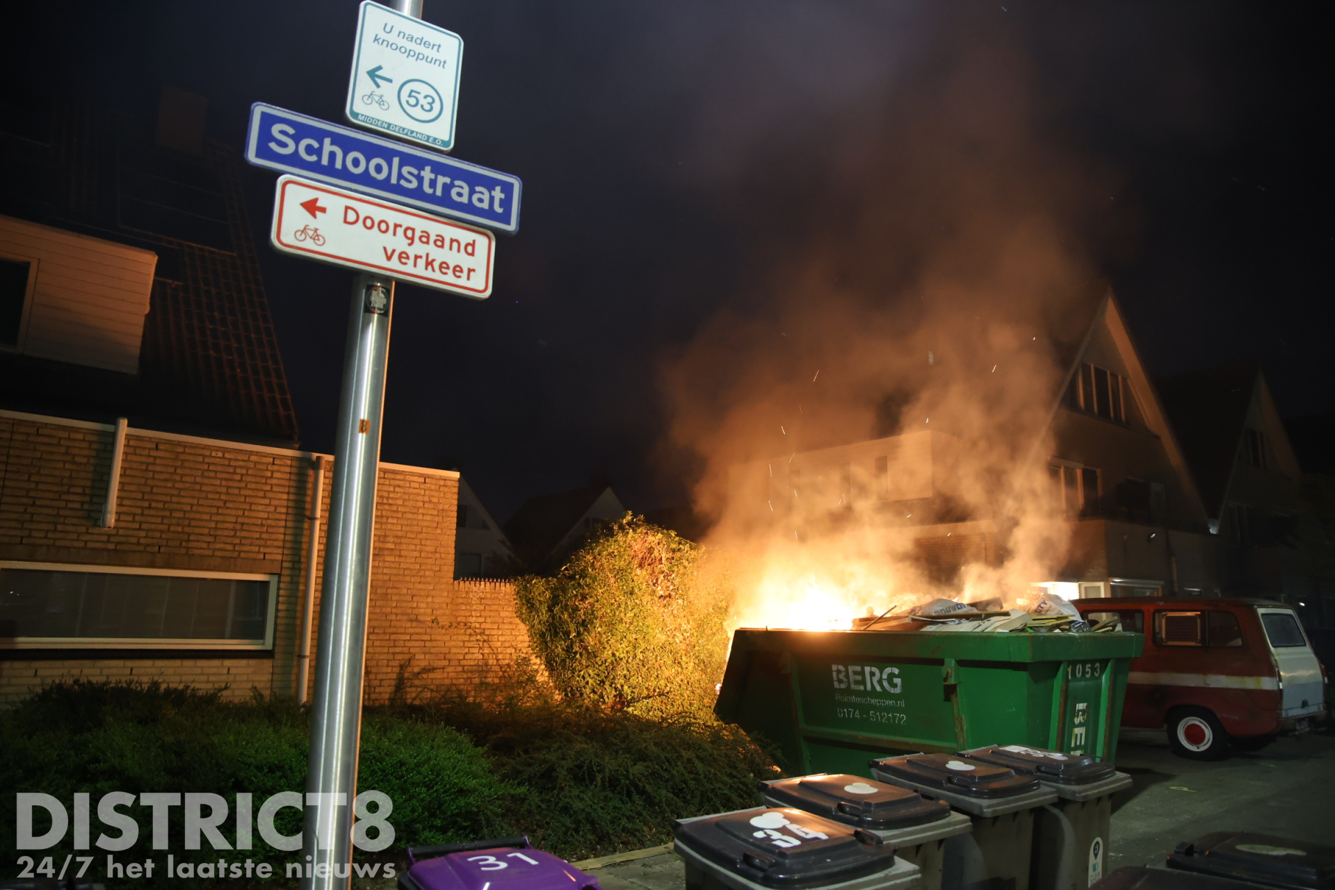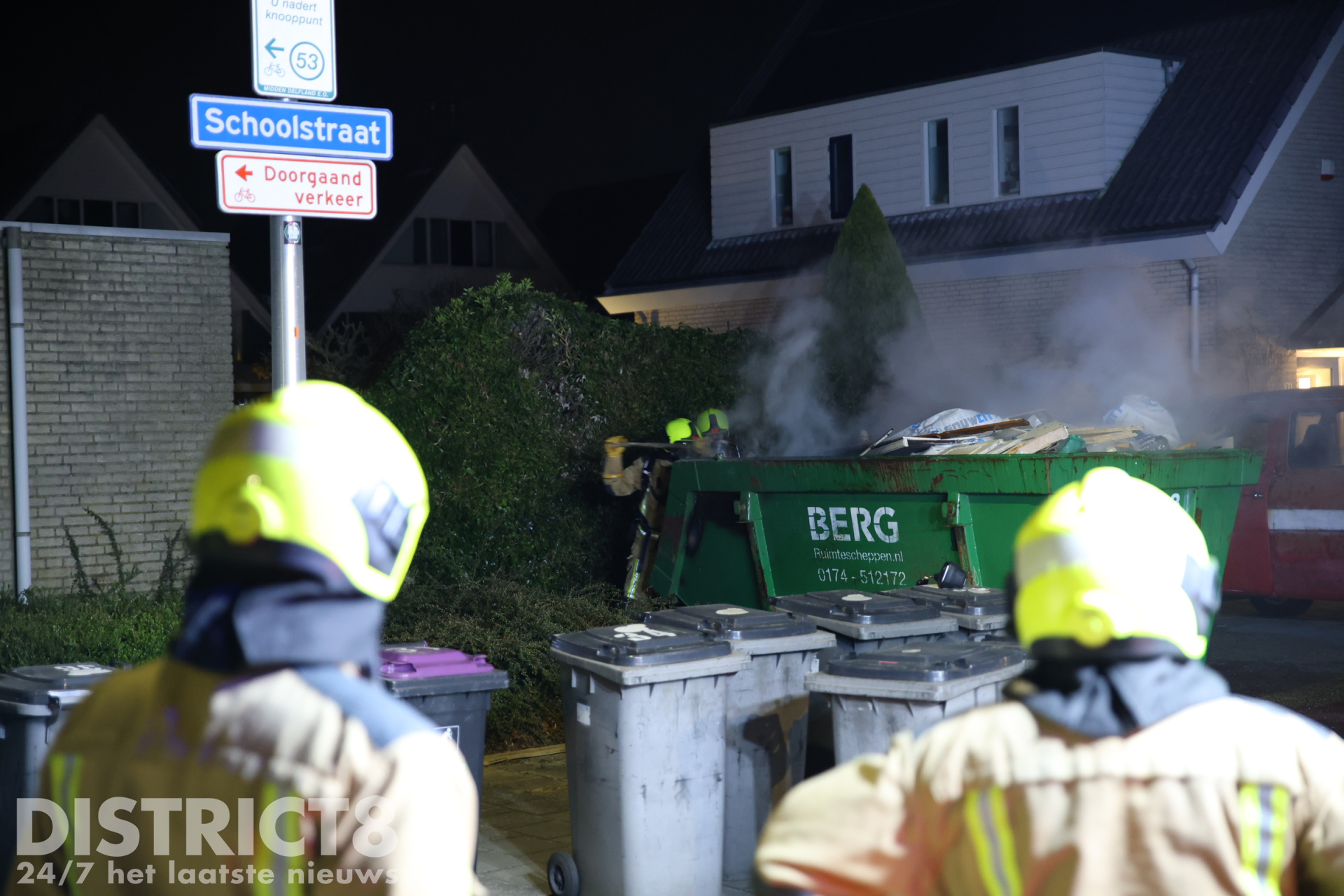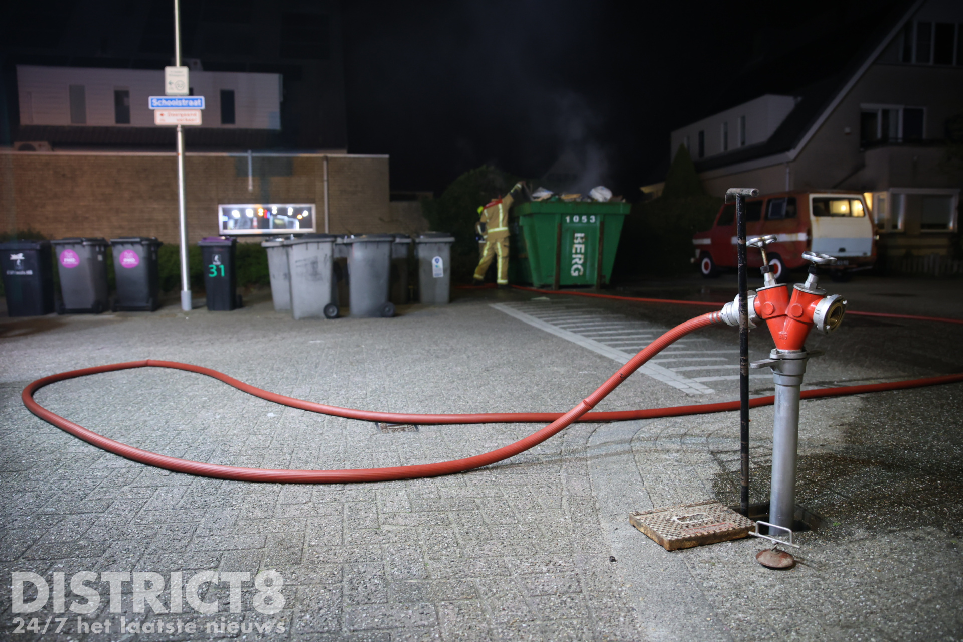 In de Schoolstraat stond de inhoud van een bouwcontainer in brand, de brand was opgemerkt door omwonenden die de brandweer belde. Omdat de container dichtbij een schutting stond werd de brandweer met spoed gealarmeerd.