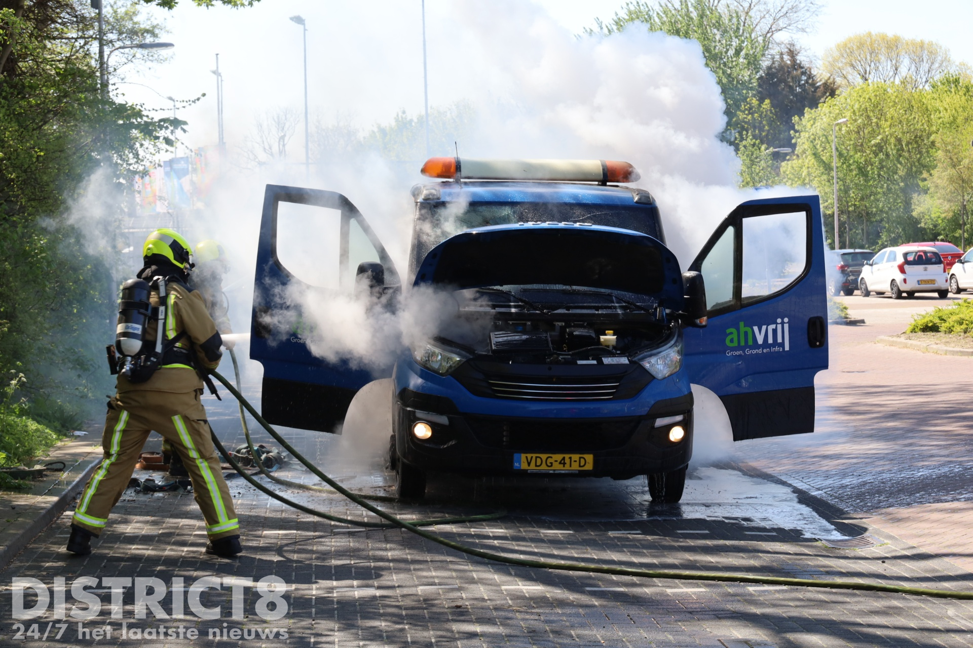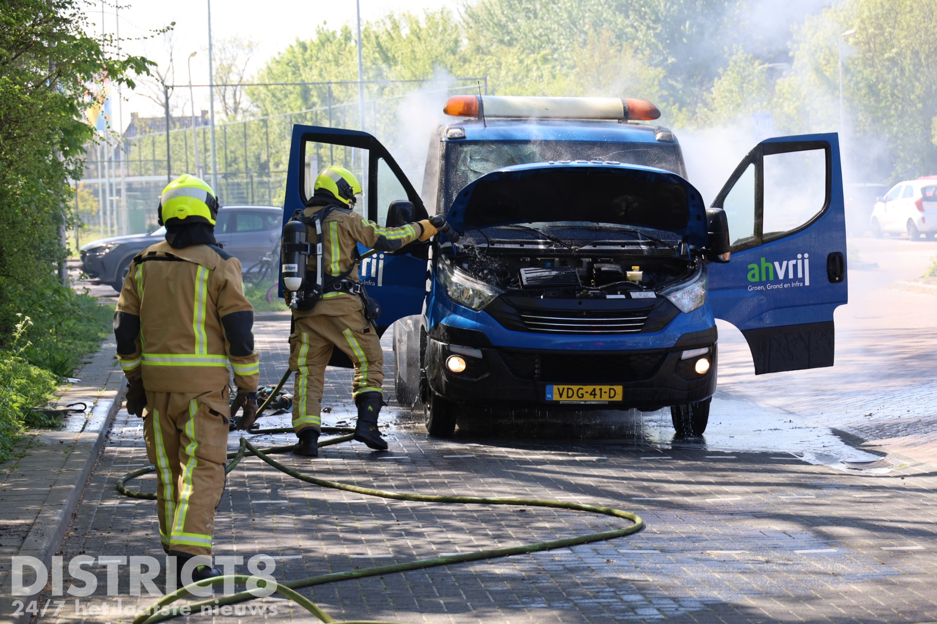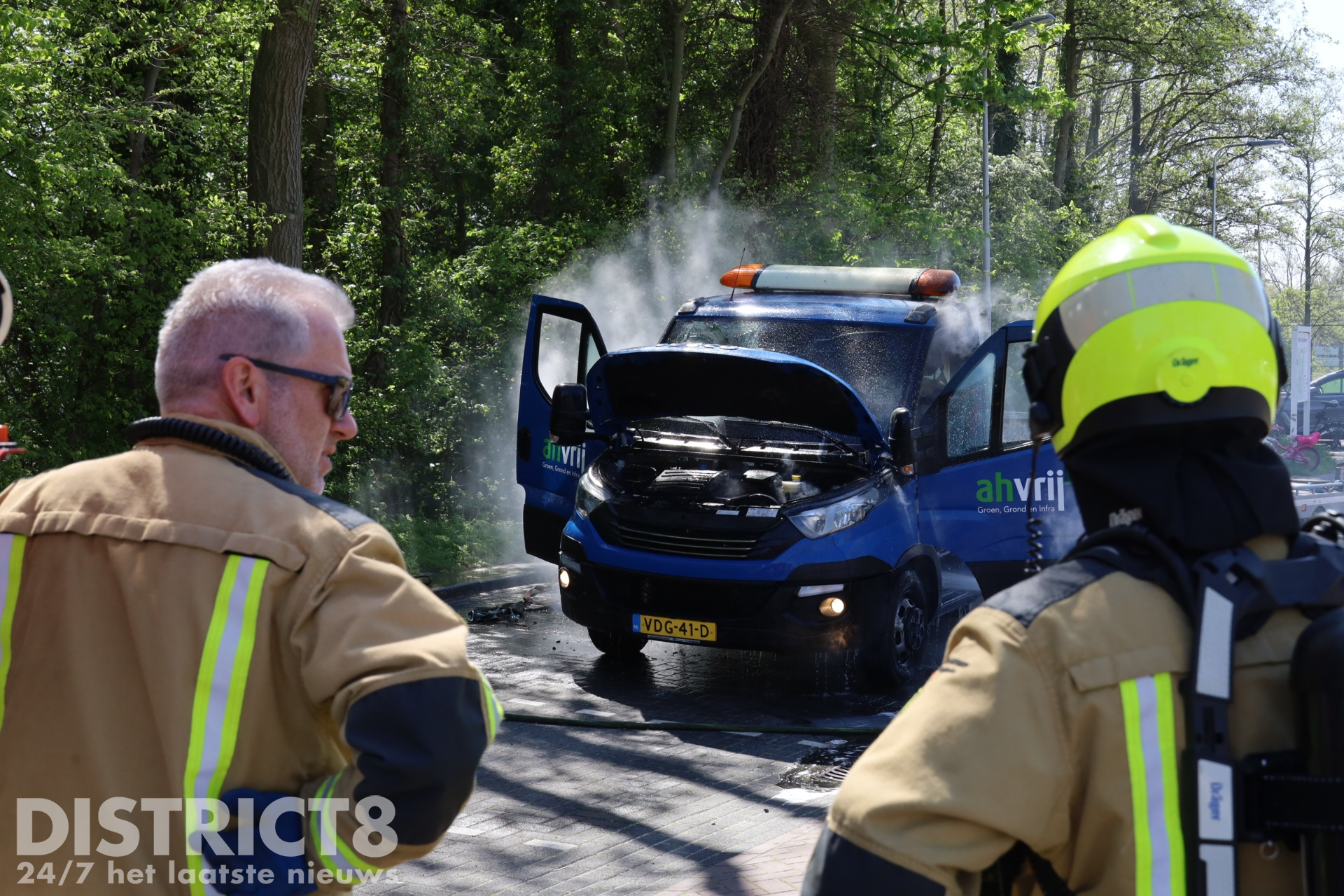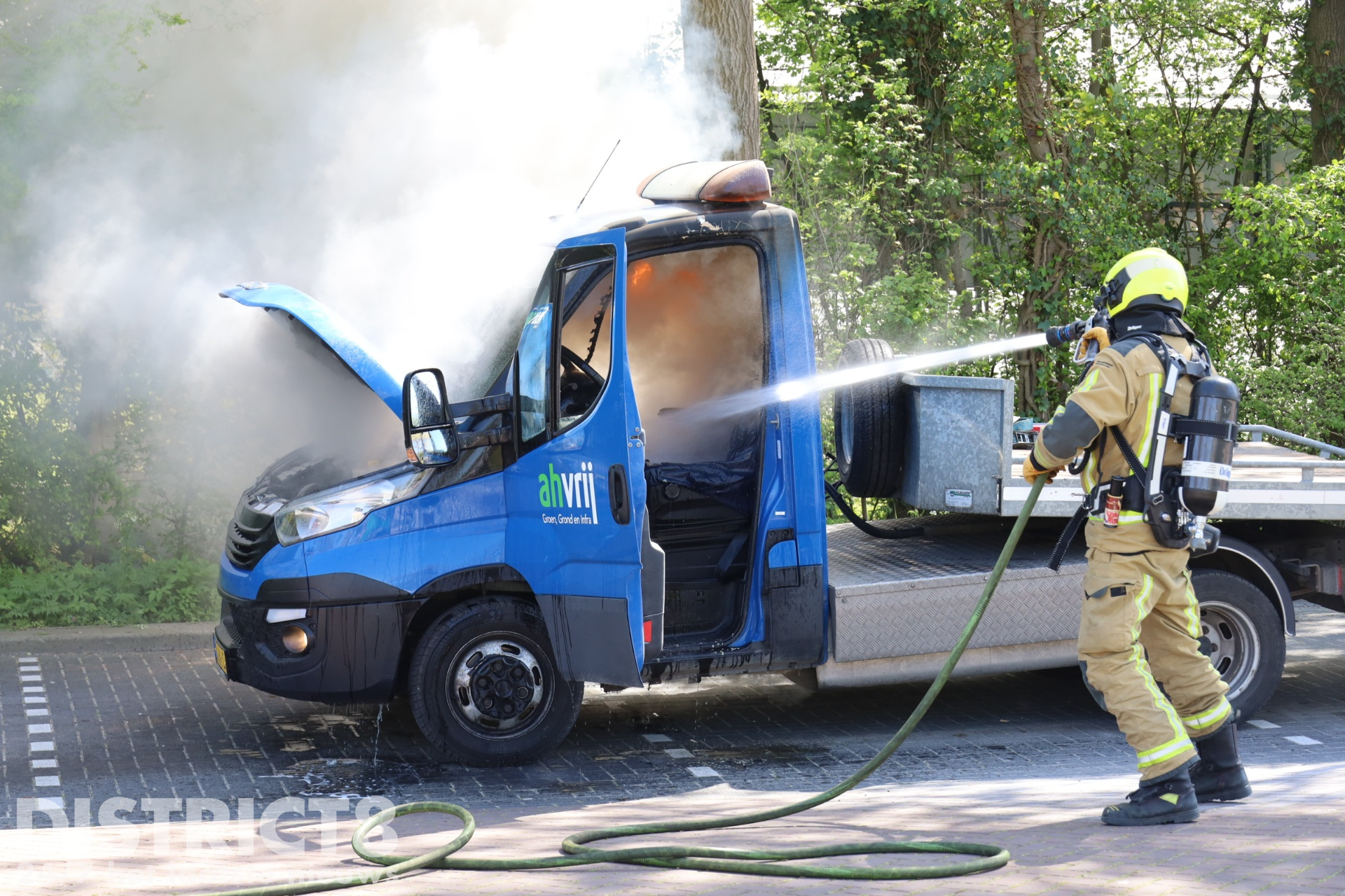 De eerste bluspoging werd ondernomen door de inzittende van het voertuig. Tijdens deze poging heeft de man rook ingeademd. De brandweer heeft vervolgens de brand volledig geblust. De schade aan de bedrijfswagen is groot.