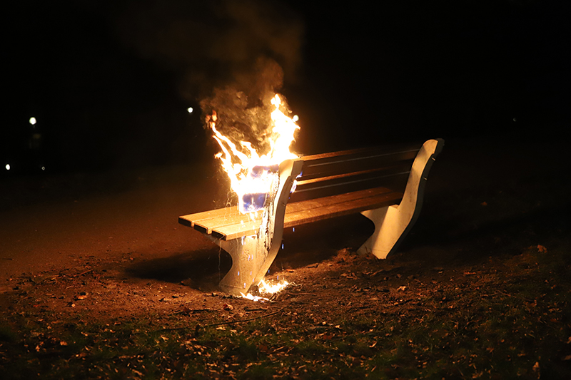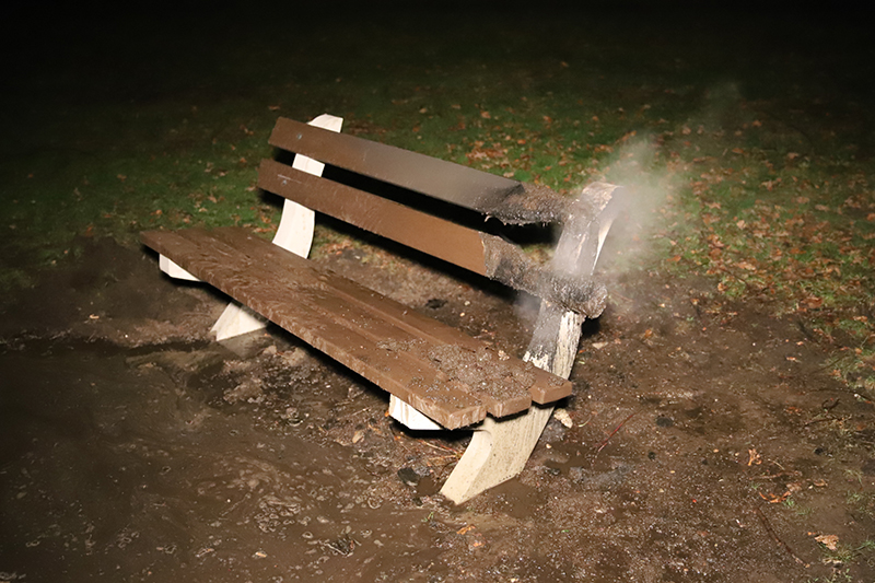 Na 5 bakken water had de brandweer het brandende bankje eindelijk uit. Het bankje heeft door de brandstichting schade opgelopen.