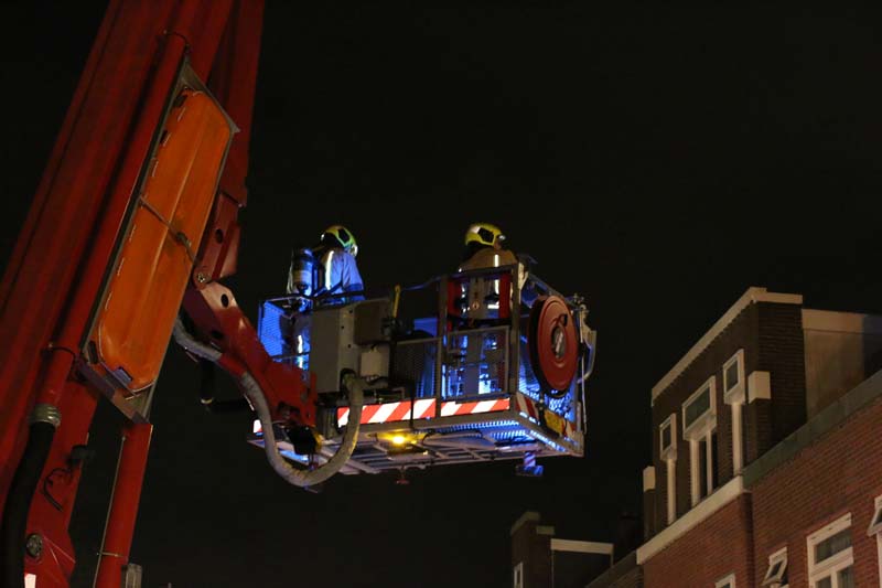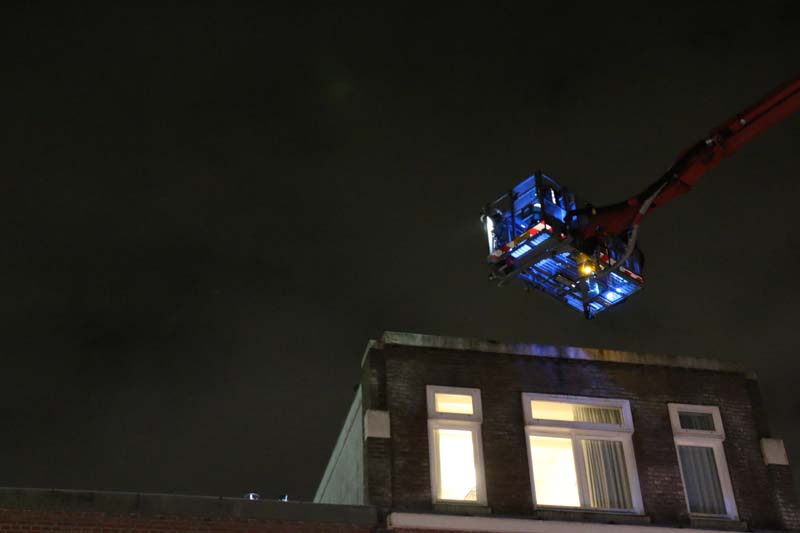 Met de hoogwerker heeft de brandweer nacontroles uitgevoerd op het dak en in de schoorsteen, snel werd duidelijk dat er geen brand meer woedde in de schoorsteen of in het dak.