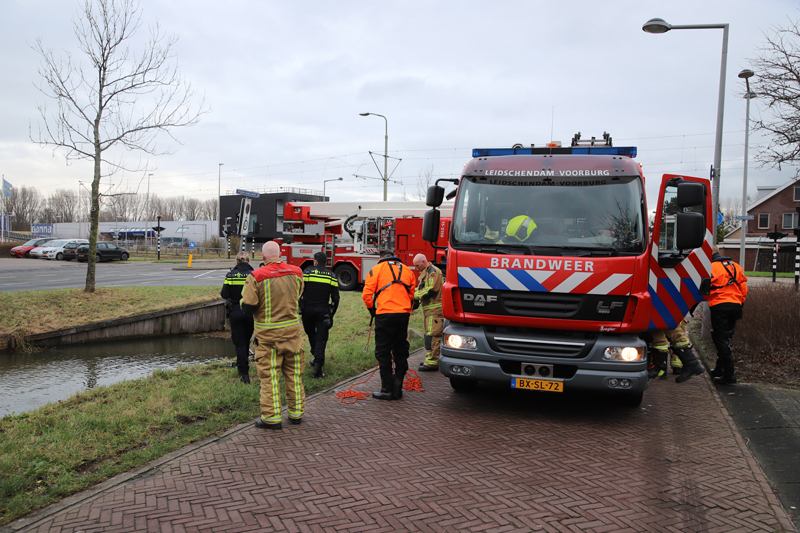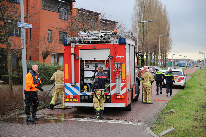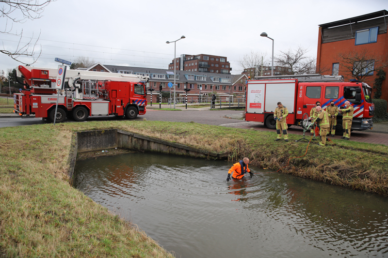 Direct werden meerdere brandweer eenheden gealarmeerd. Een brandweerman in een waadpak heeft het water kort doorzocht op een mogelijk slachtoffer.
