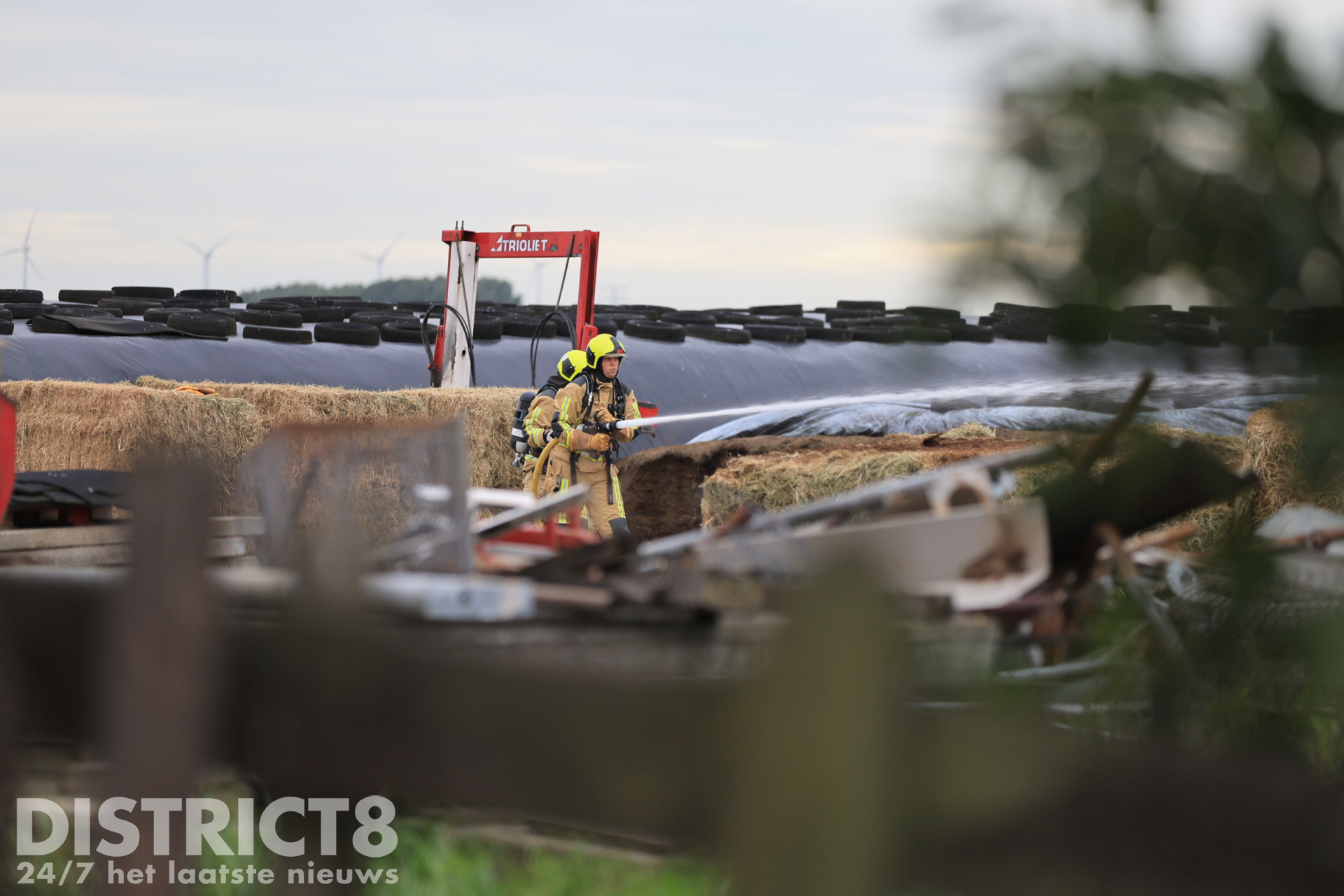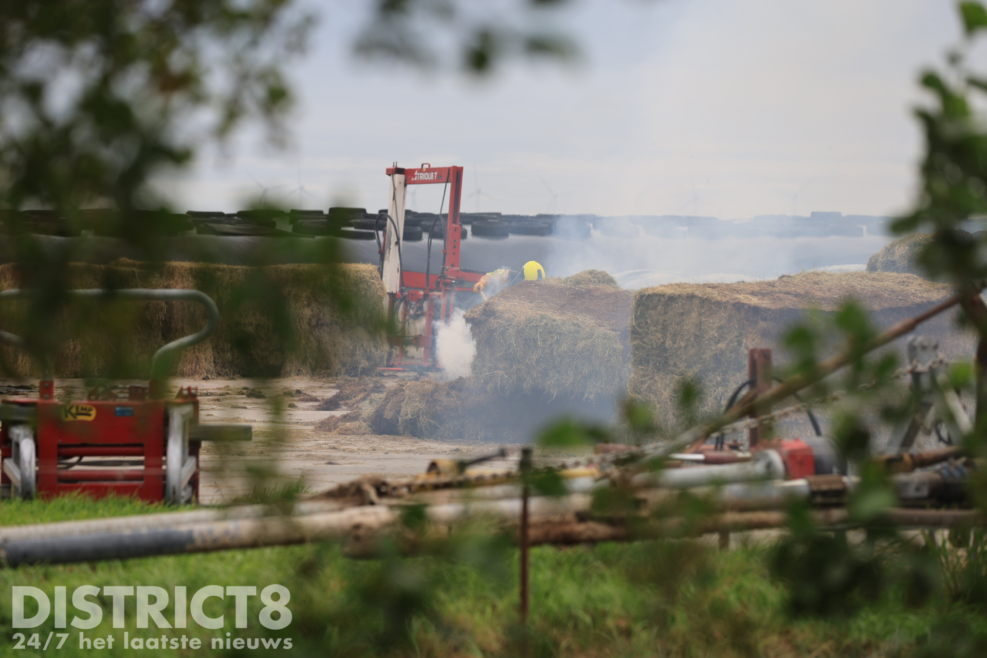 De brandweer is in samenwerking met de boer begonnen met het naar buiten rijden van de hooibalen. Buiten zijn deze door de brandweer uit elkaar getrokken en geblust.