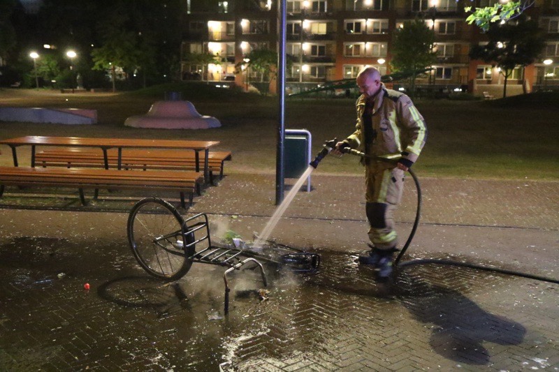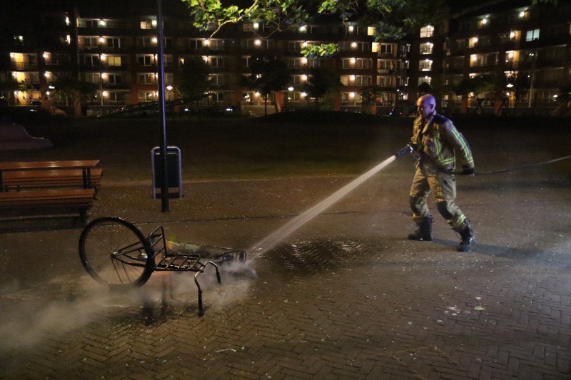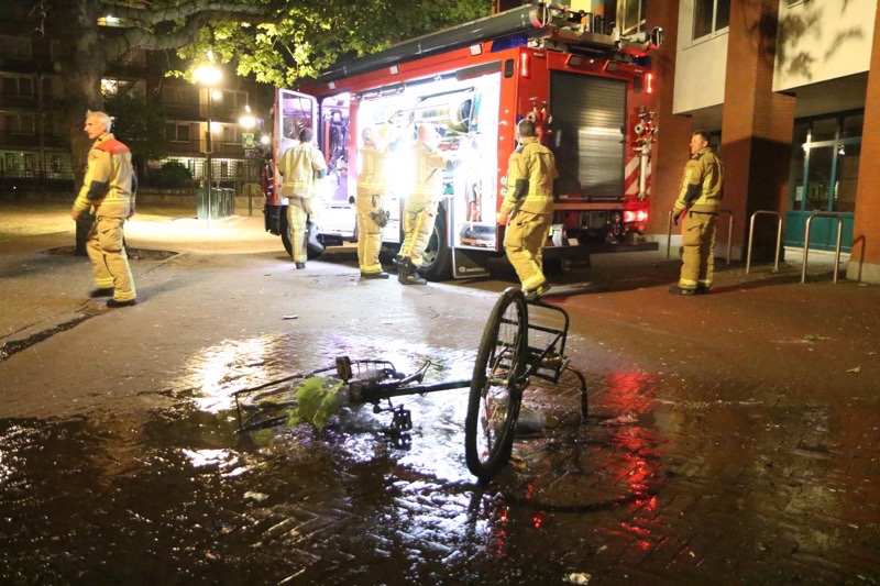 Toen de brandweer arriveerde bleek er een fiets in brand te staan. Met elke liters bluswater was het vuur snel uit.