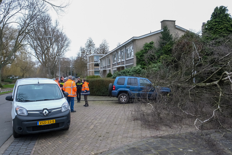 De boom viel om door de harde wind en heeft hiermee de auto flink beschadigd. De brandweer is inmiddels onderweg om de boom te verwijderen.
